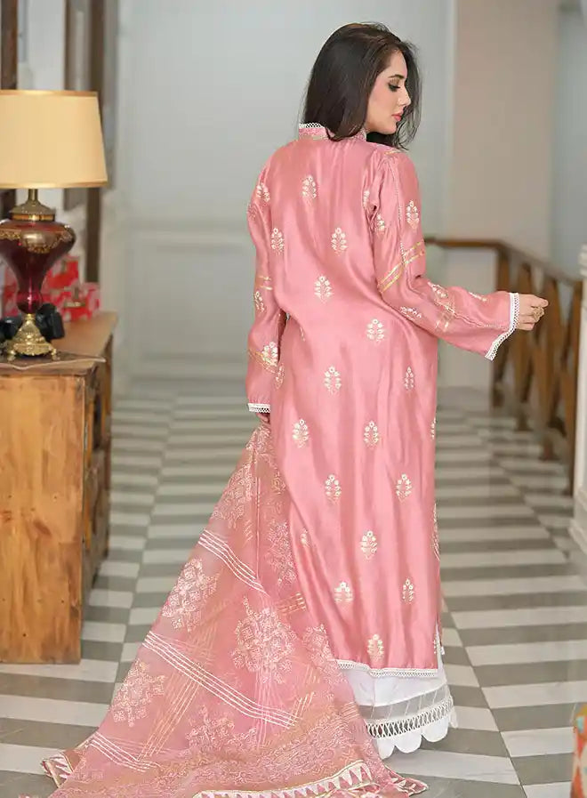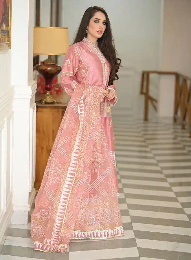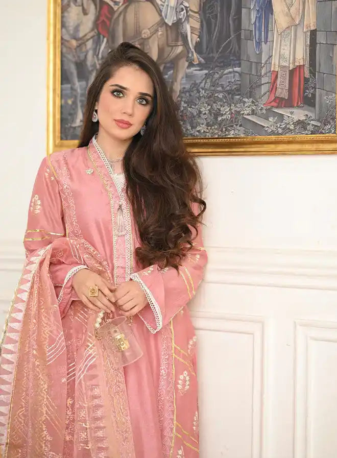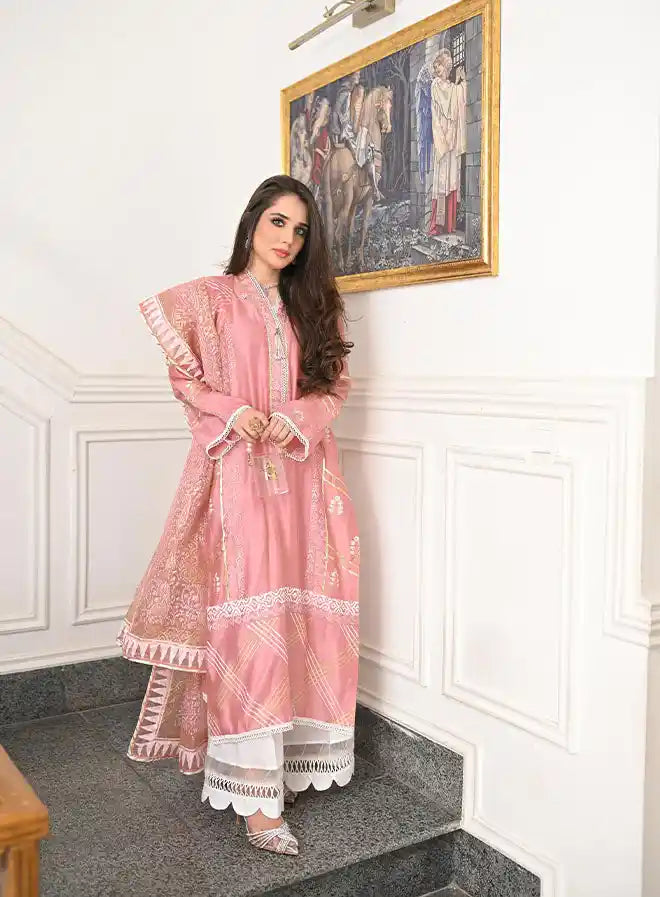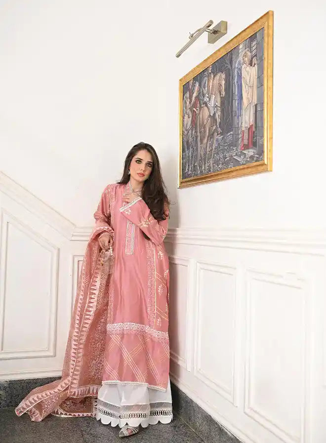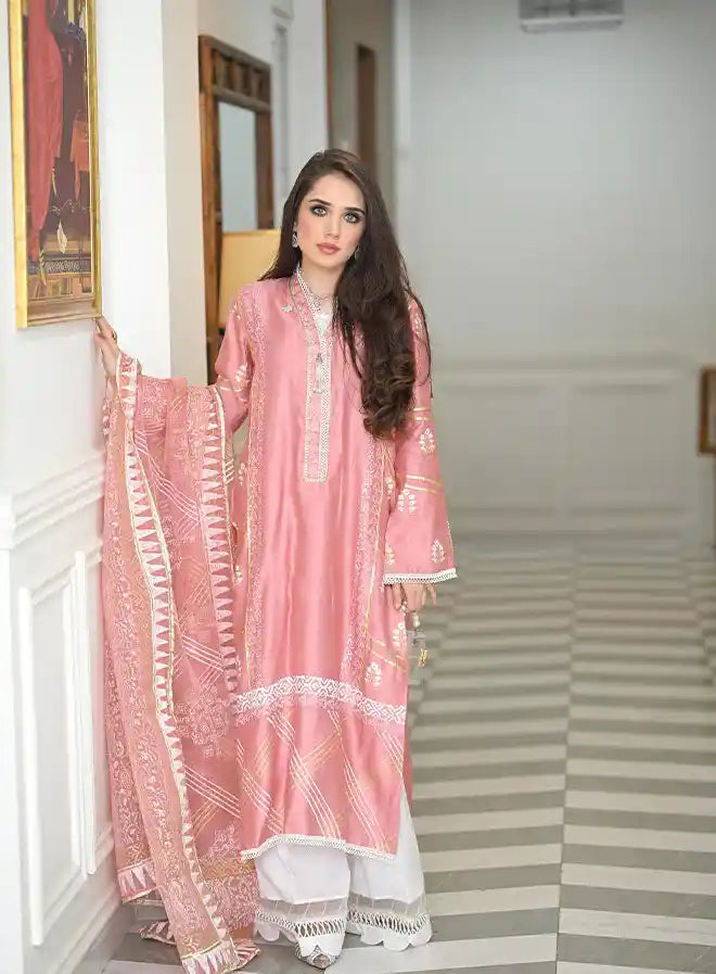 This 3-piece ensemble features a long cotton silk shirt, pure cotton trousers, and a matching dupatta in a soft pink hue. The shirt boasts a graceful silhouette with intricate block-printed details, beautifully complemented by delicate gotta lace accents. Paired with comfortable cotton izaar trousers, this outfit exudes charm and elegance, perfect for both festive and casual occasions.