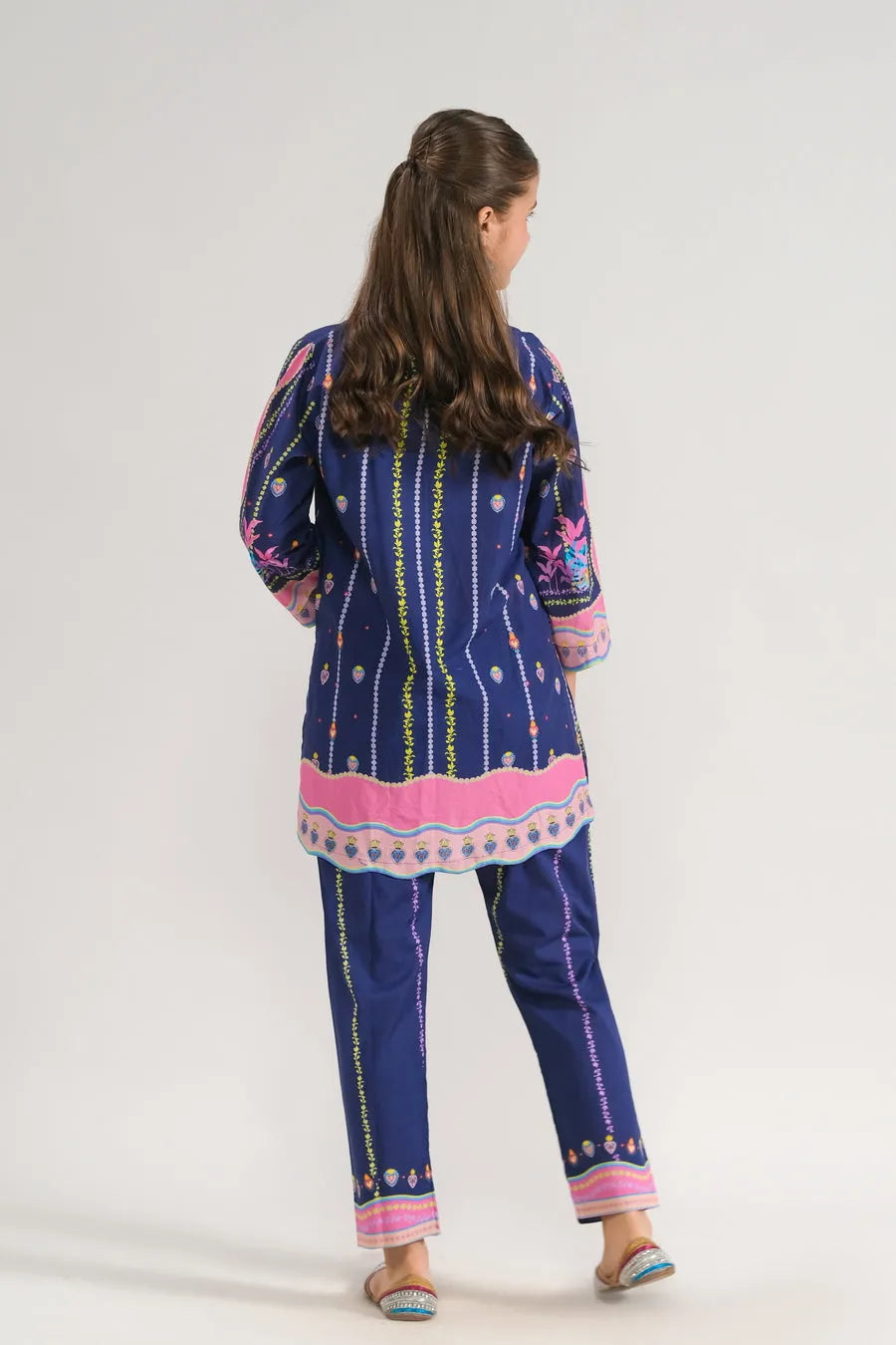 This stunning two-piece set features a vibrant navy blue top adorned with colorful floral patterns and intricate detailing. Paired with matching pants, it makes for a stylish choice for special occasions or family gatherings, ensuring she shines beautifully!