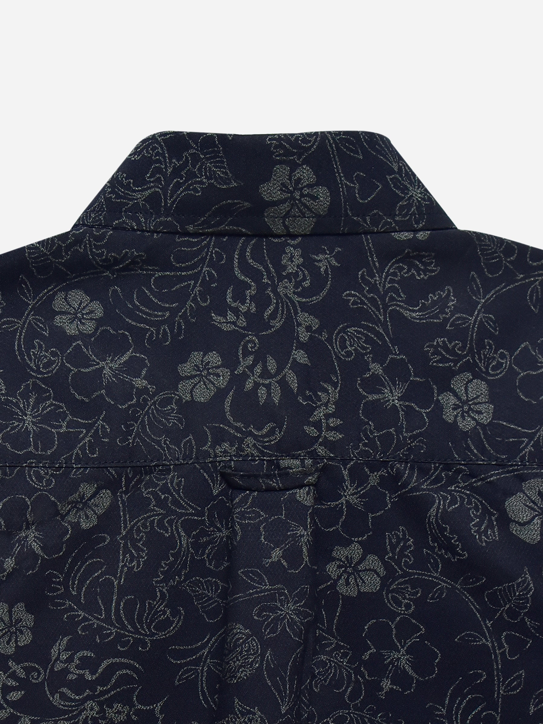 "Step into summer with our all-over navy blue bold printed shirt from Junior collection. A wardrobe essential for the young fashionista. Its playful print and airy half sleeves offer a stylish yet comfortable option for hot days ahead. Finished with shallow collar & inner collar ribbon detailing