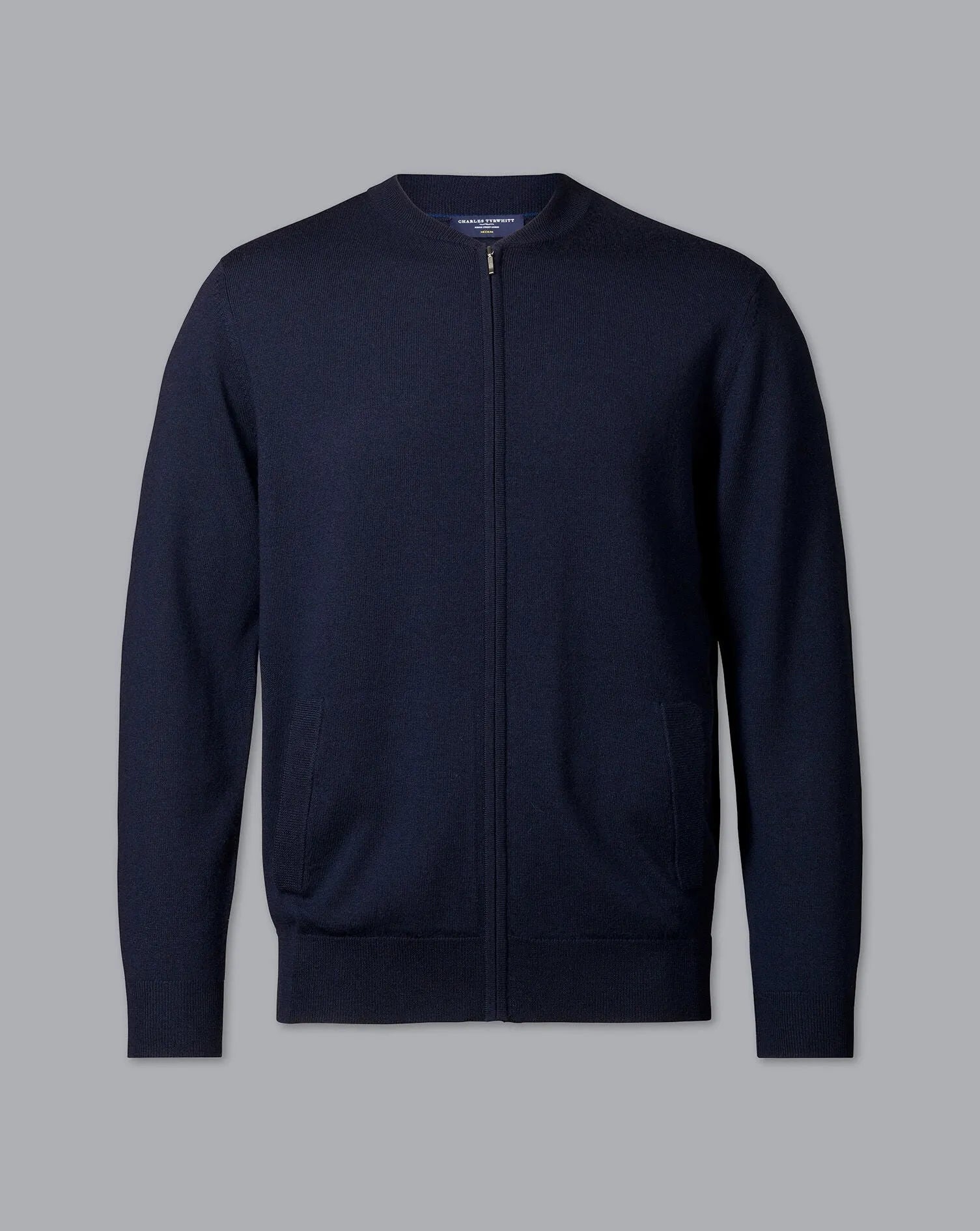 This zip-up bomber jacket is knitted from 100% extra fine merino wool in a jersey stitch, with a rounded baseball collar neckline and two pockets. The zip at the front is concealed for a streamlined look, and rib detailing on the collar, hem, and cuffs create a classic bomber shape. The merino fibers make it lightweight and soft, yet offer good insulation in cold weather, and the piece has been garment-washed for extra softness.