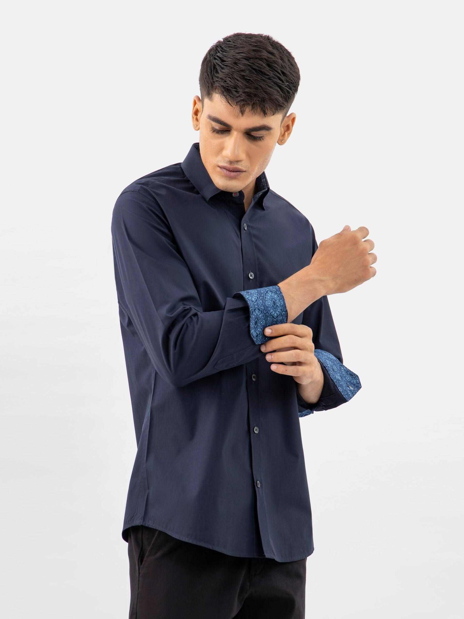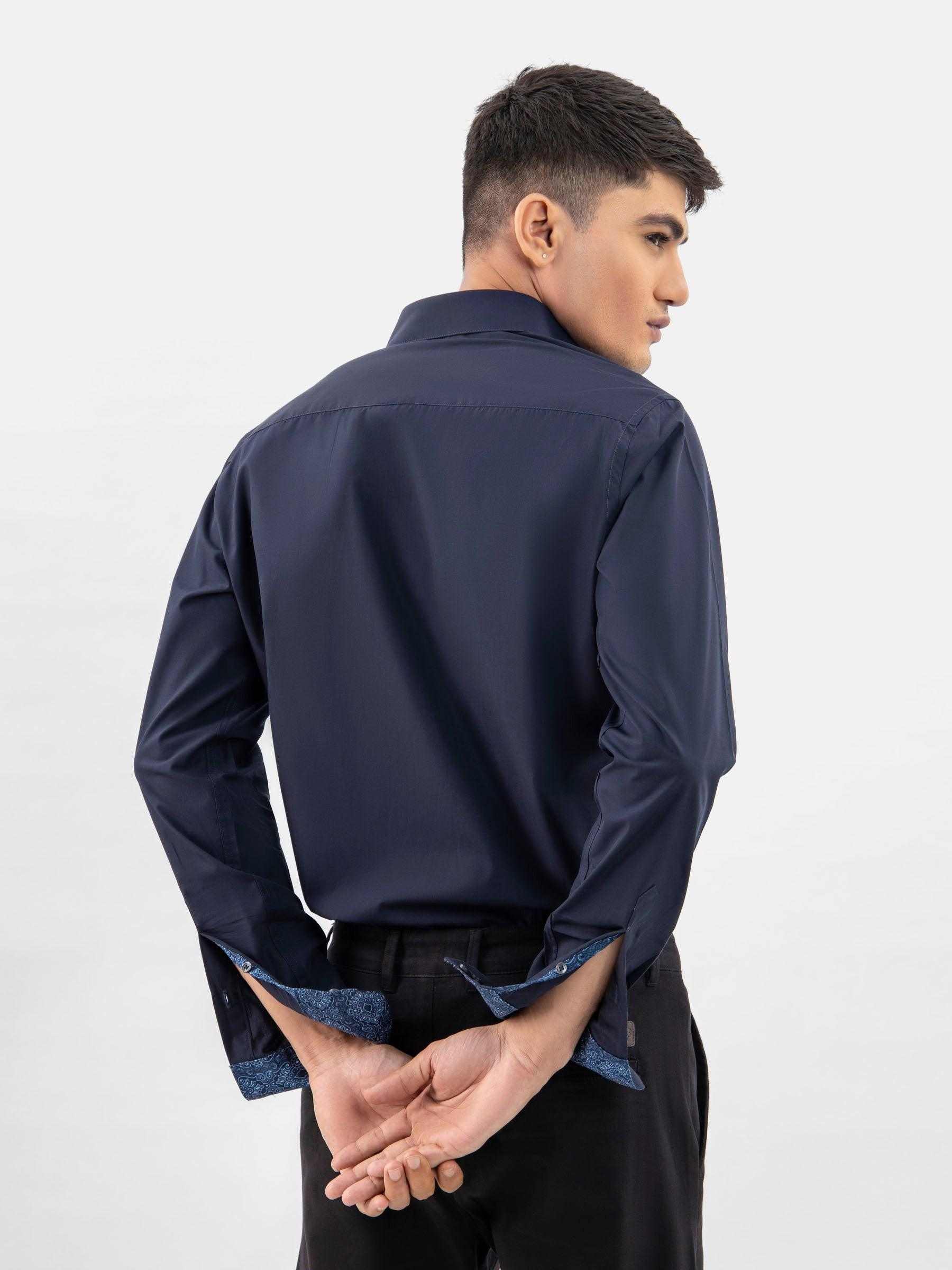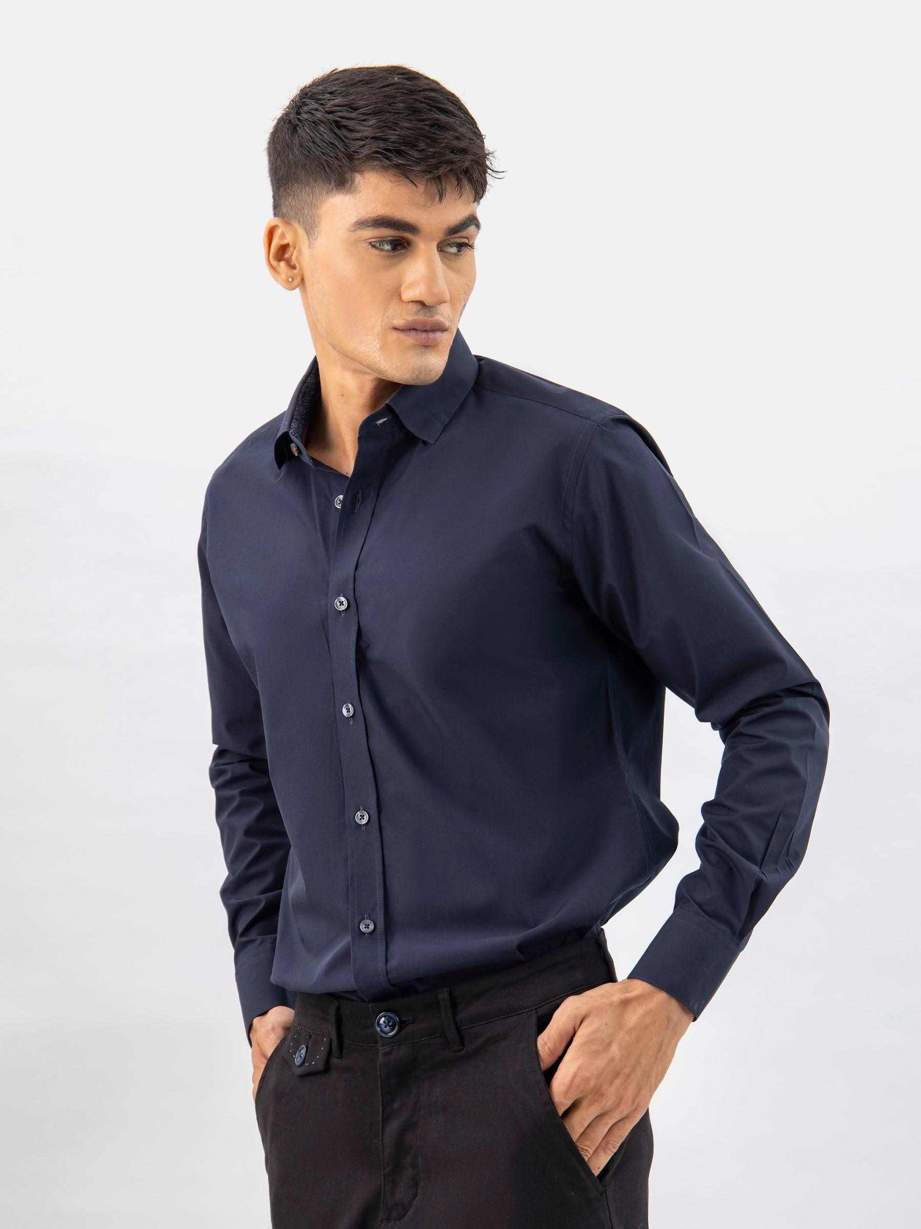 Step into timeless elegance with our mens navy blue satin formal shirt with detailing. This shirt features inside button down collar & printed inner collar detailing weight shirt ensuring a polished and sophisticated look for any occasion. Wear it with our black chinos for a polished look