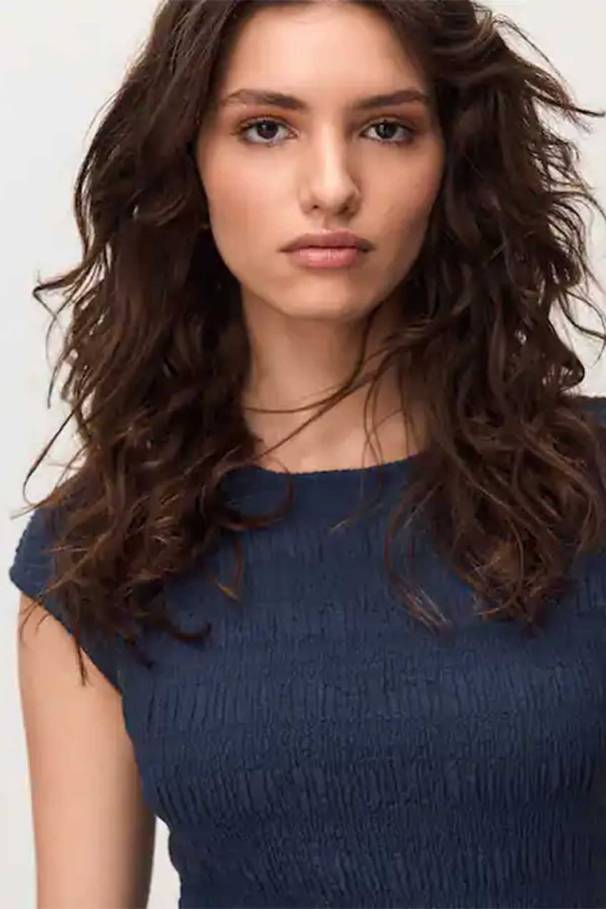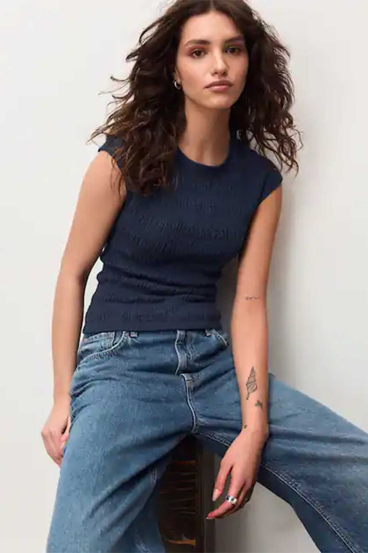 Navy Blue Short Sleeve Shirred Textured Crew Neck Top