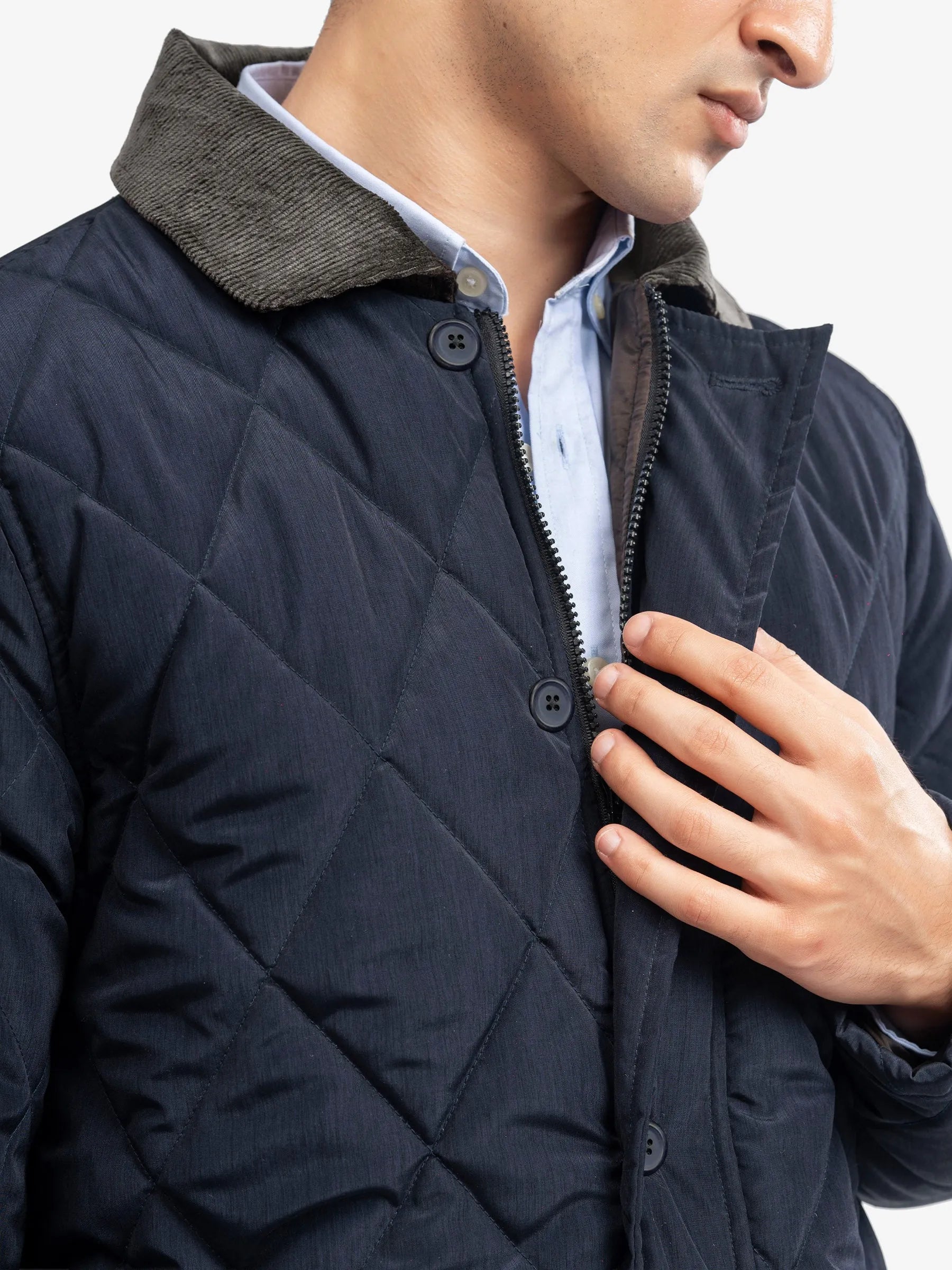 Navy blue sports quilted long jacket with a corduroy collar blends sleek warmth with a refined look. Crafted with heavy quilting for everyday comfort, it features a soft corduroy collar and a clean longline fit. Perfect for smart-casual layering from weekdays to weekends.