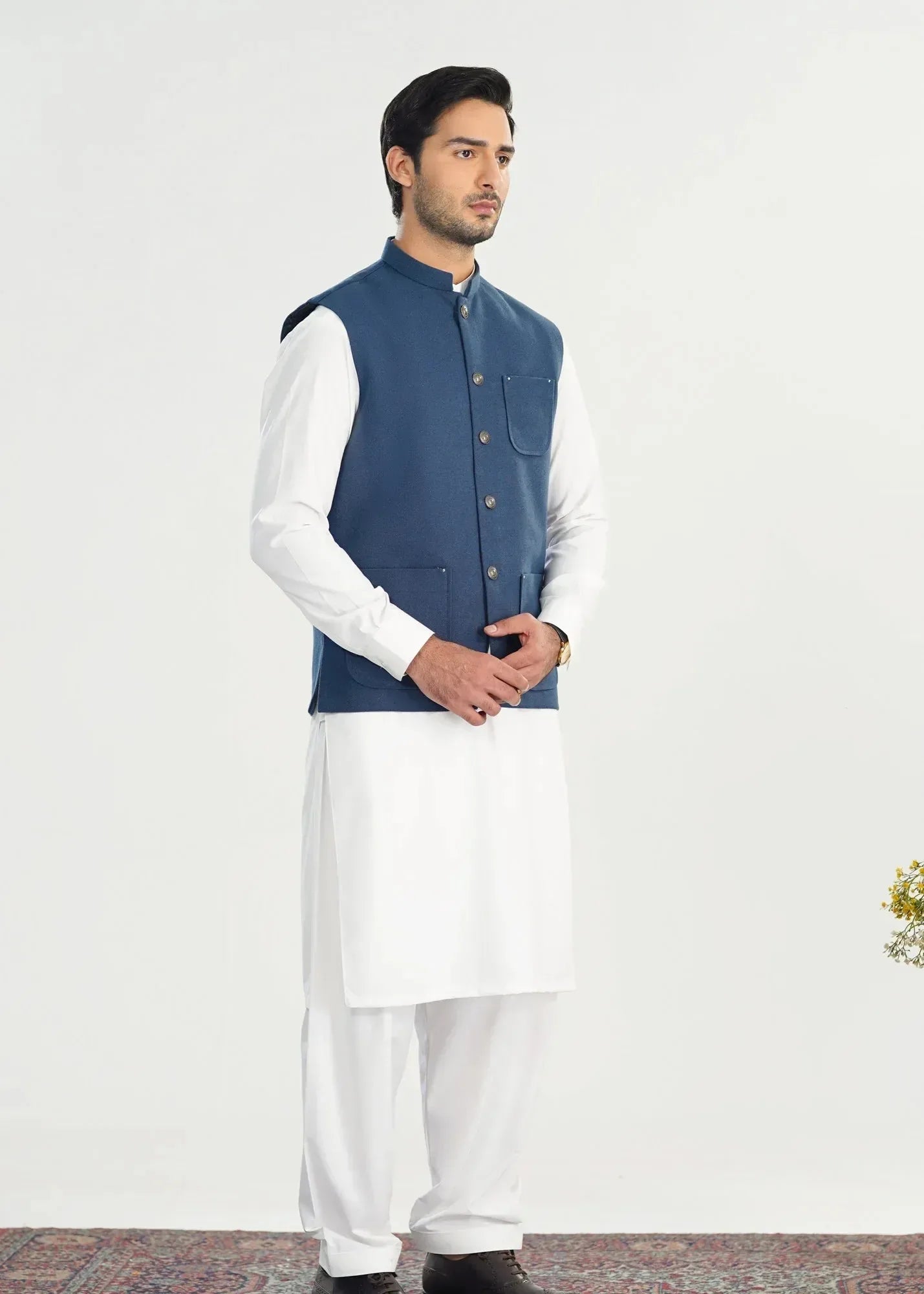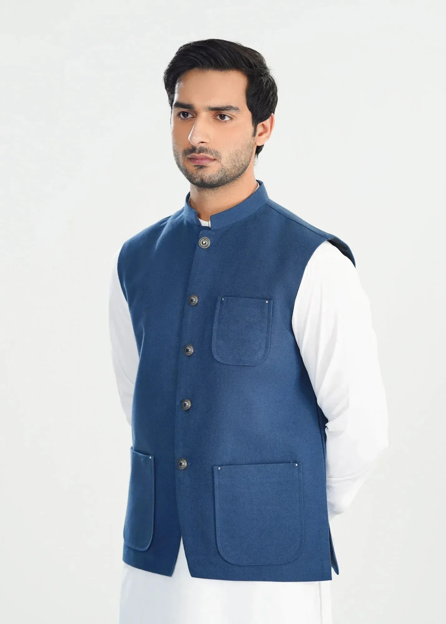 Navy Blue Handloomed Khaddar Waistcoat - A-Line Cut - Men