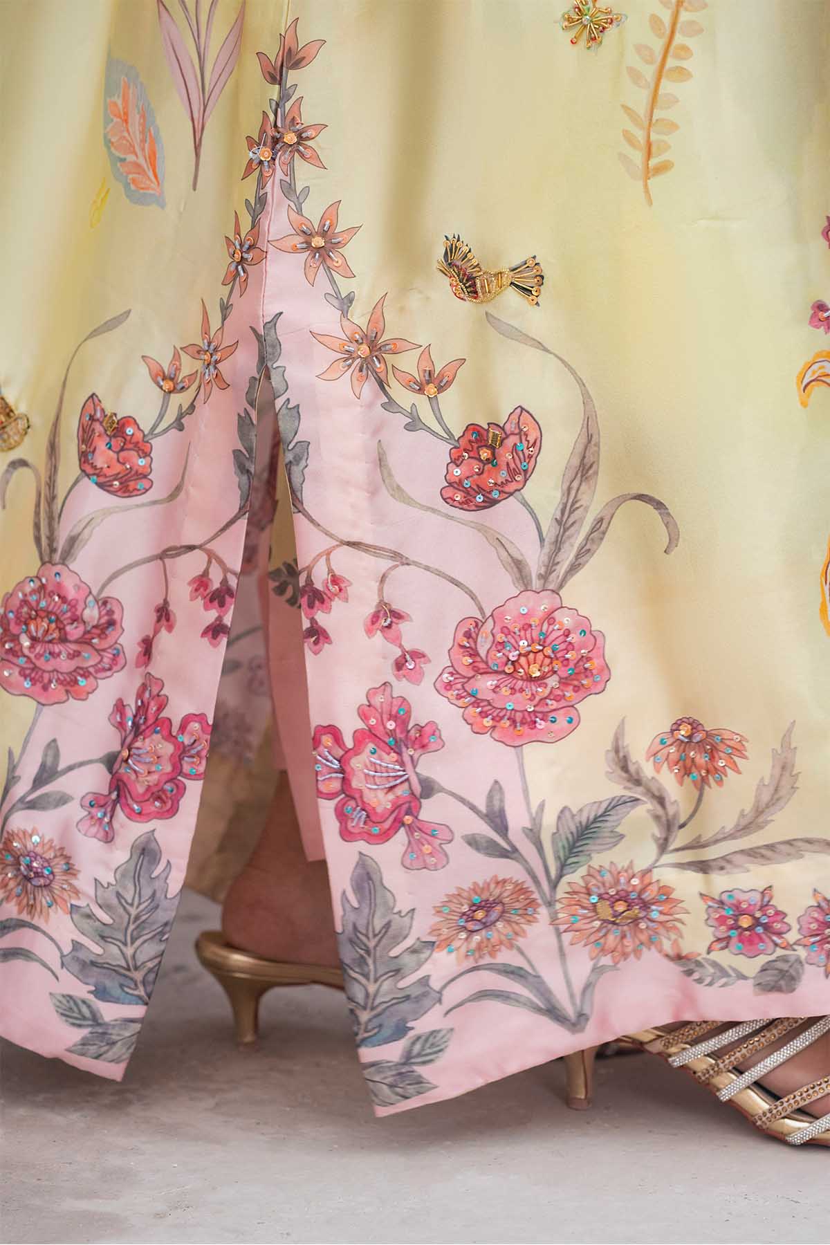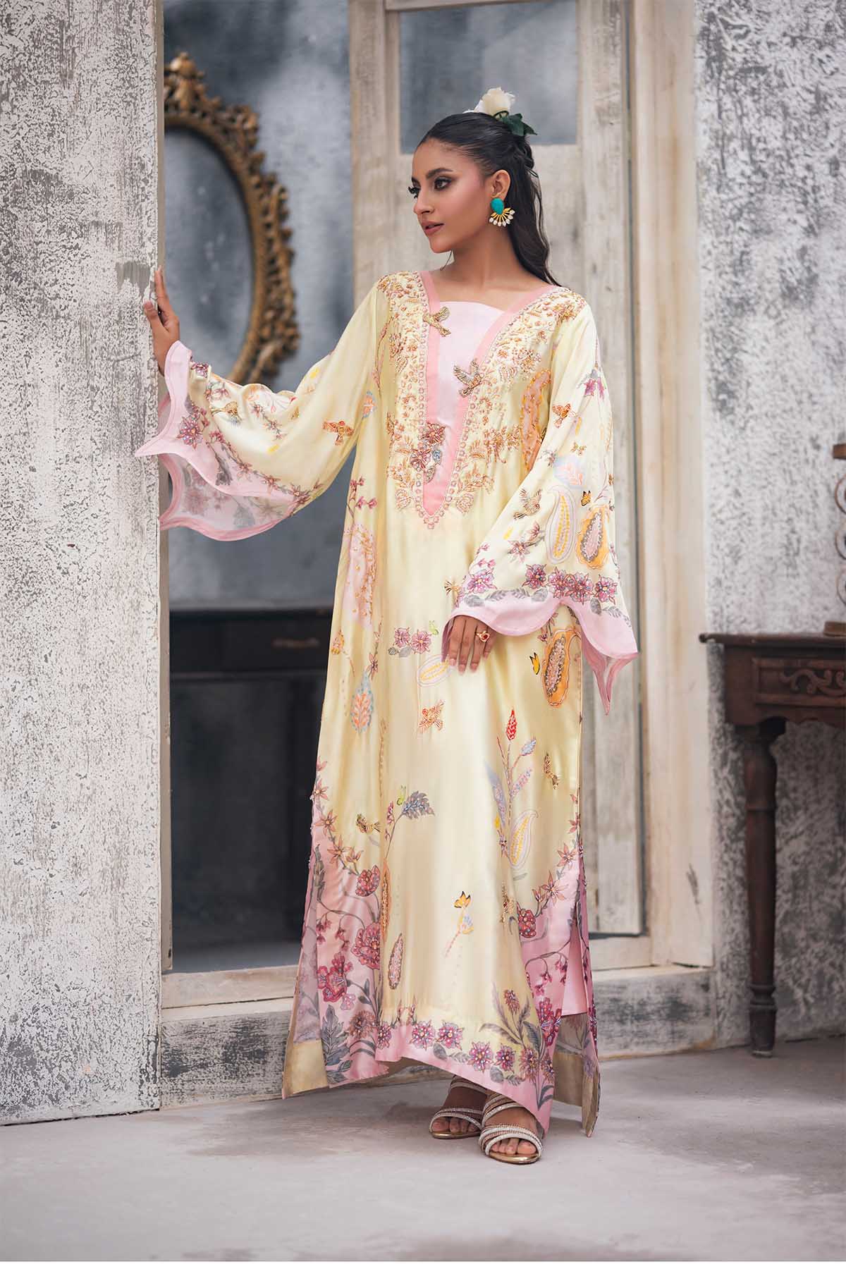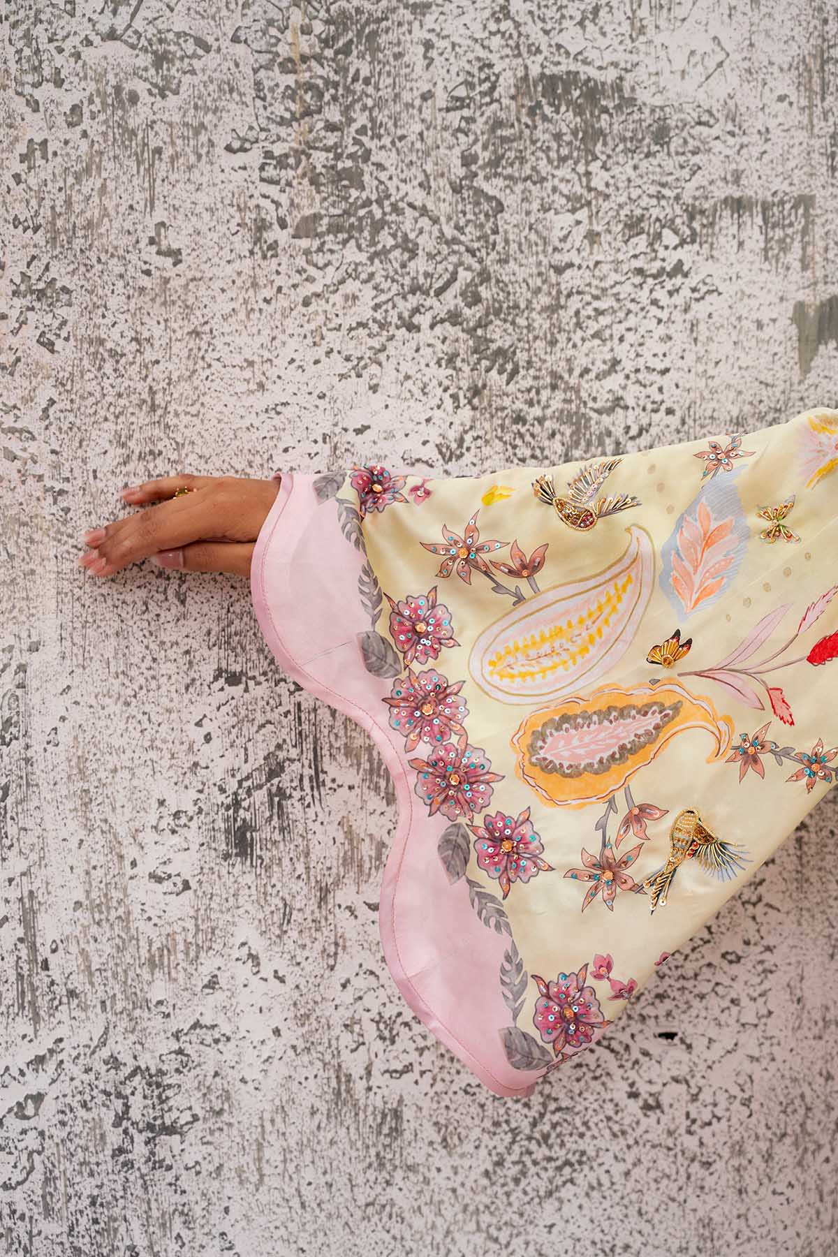 Lia - Festive Formal - Vol 2: A Vision Of Effortless Elegance, This Lemon And Blush Shamooz Silk Kaftan Unfolds In A Relaxed Long Silhouette With Side Slits. The Neckline Is Traced With Delicate Hand Embroidery And Blush Organza, While Soft Blush Borders Frame The Slit Sleeves And Hem In Floral Details. Across The Canvas, Painterly Motifs Of Paisley, Birds, Butterflies, Vines And Blossoms Bloom With A Subtle Shimmer Of Sequins, Beads, Zardoze And Gota. Paired Digitally Printed Shamooz Silk Culottes.