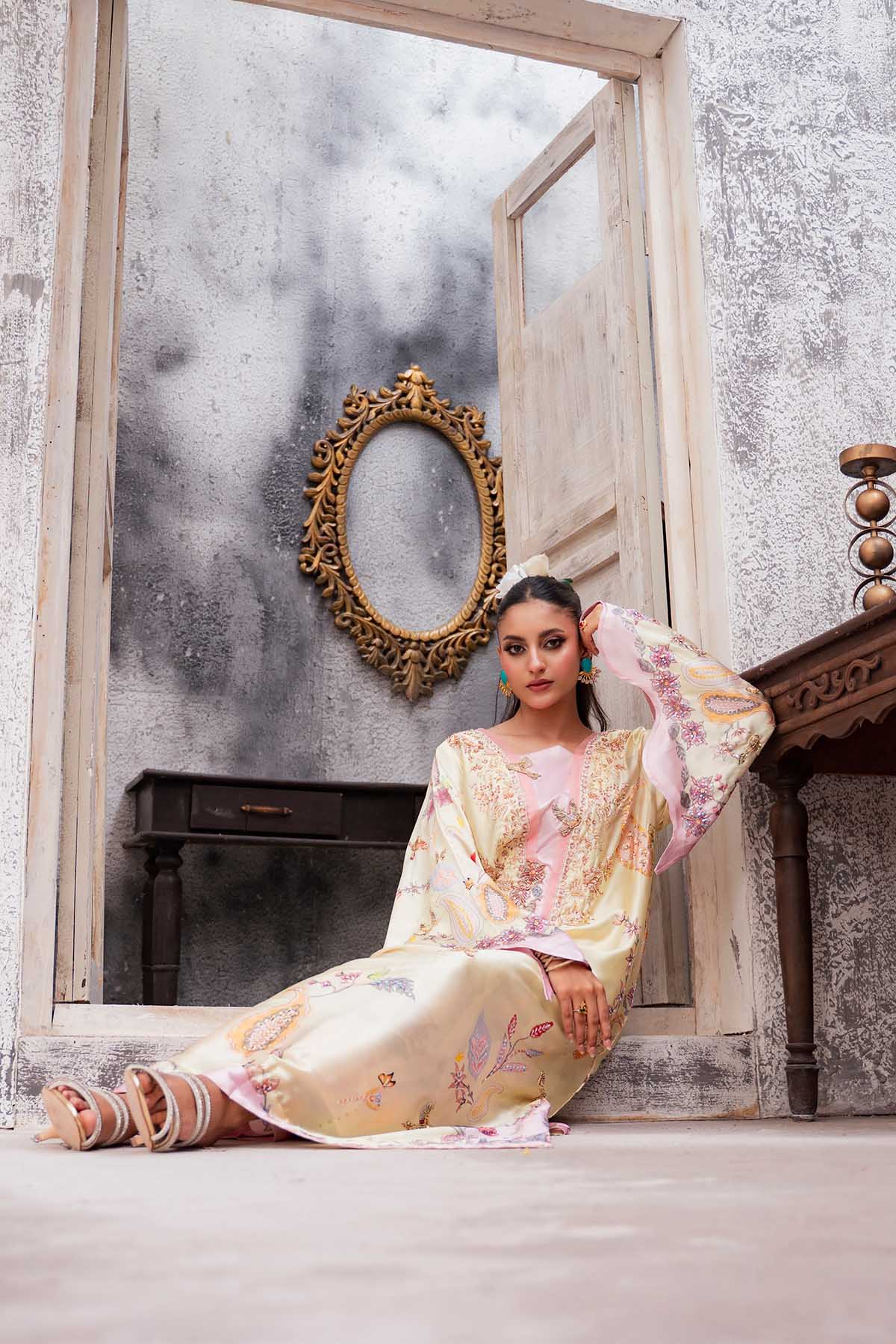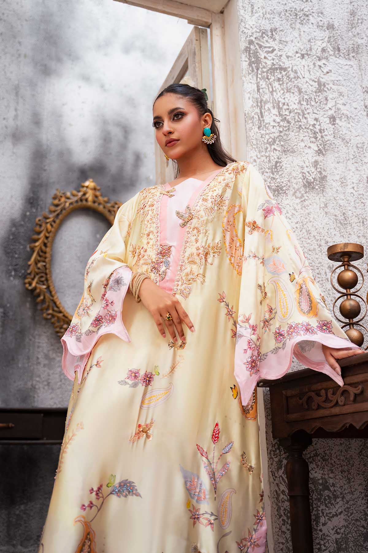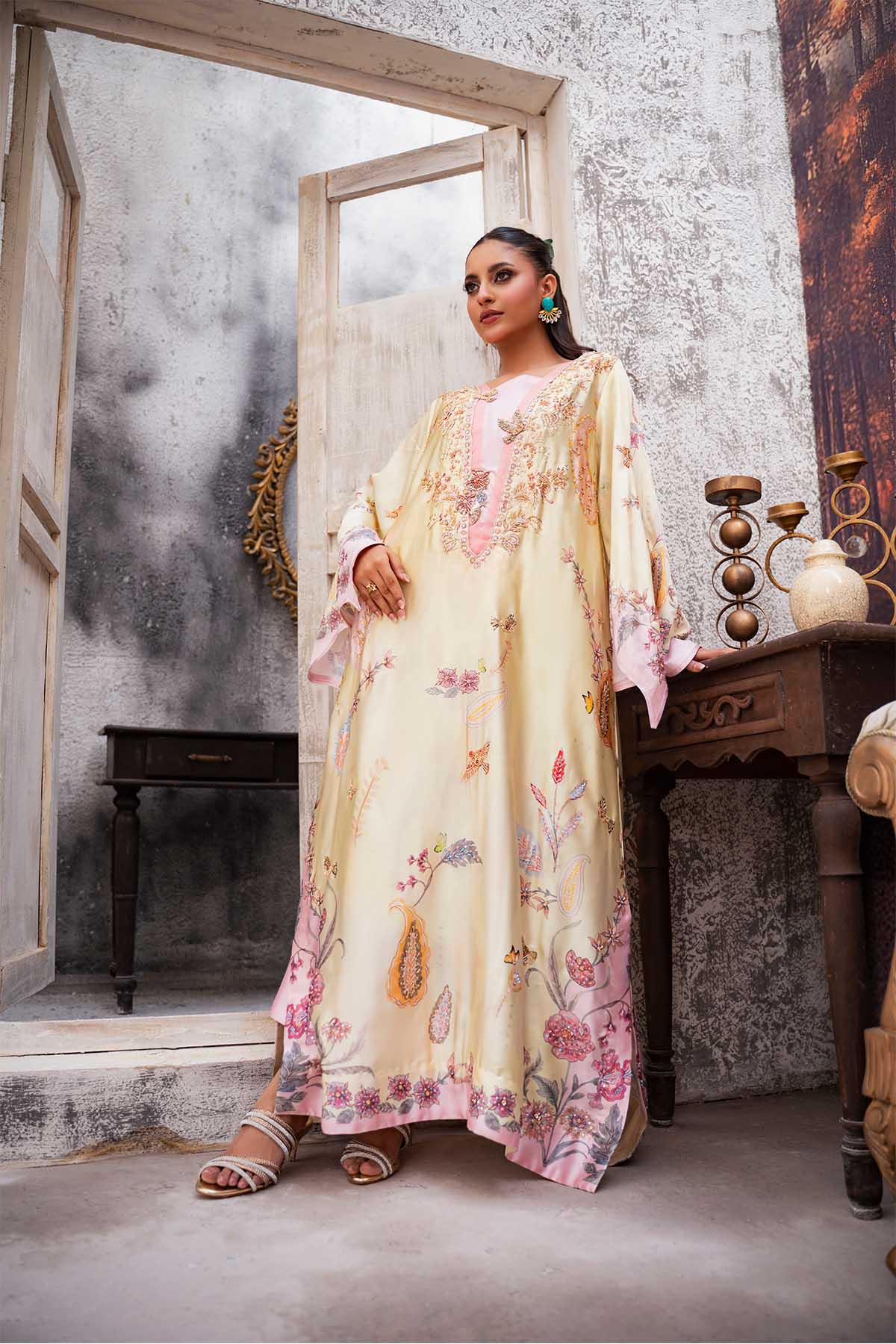 Lia - Festive Formal - Vol 2: A Vision Of Effortless Elegance, This Lemon And Blush Shamooz Silk Kaftan Unfolds In A Relaxed Long Silhouette With Side Slits. The Neckline Is Traced With Delicate Hand Embroidery And Blush Organza, While Soft Blush Borders Frame The Slit Sleeves And Hem In Floral Details. Across The Canvas, Painterly Motifs Of Paisley, Birds, Butterflies, Vines And Blossoms Bloom With A Subtle Shimmer Of Sequins, Beads, Zardoze And Gota. Paired Digitally Printed Shamooz Silk Culottes.