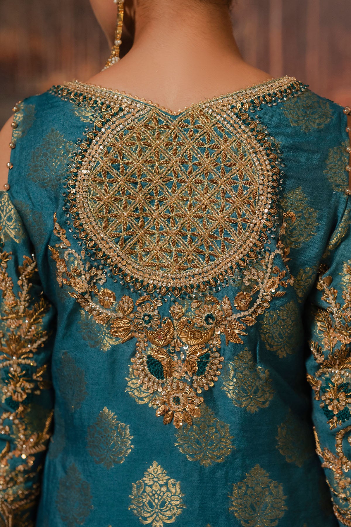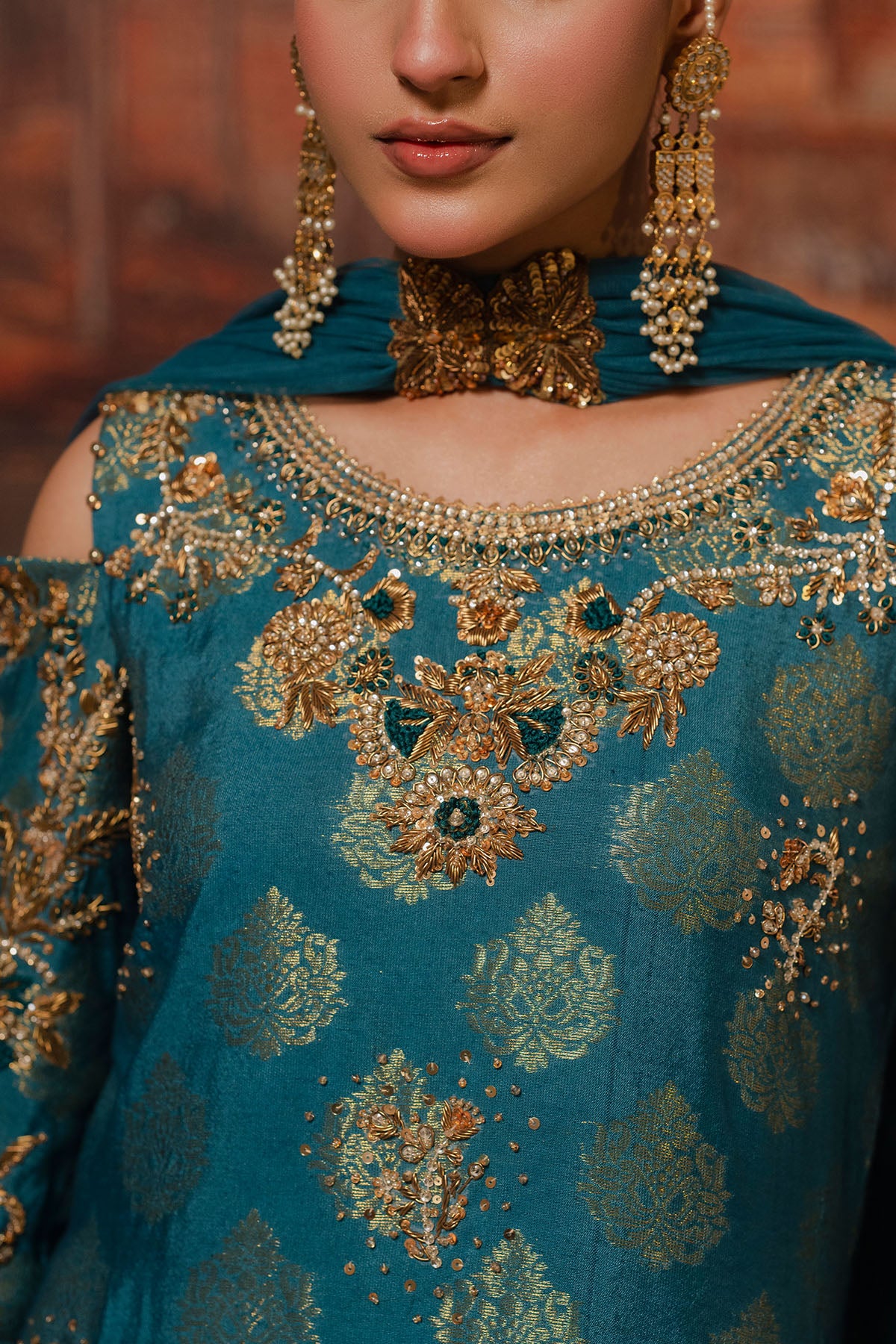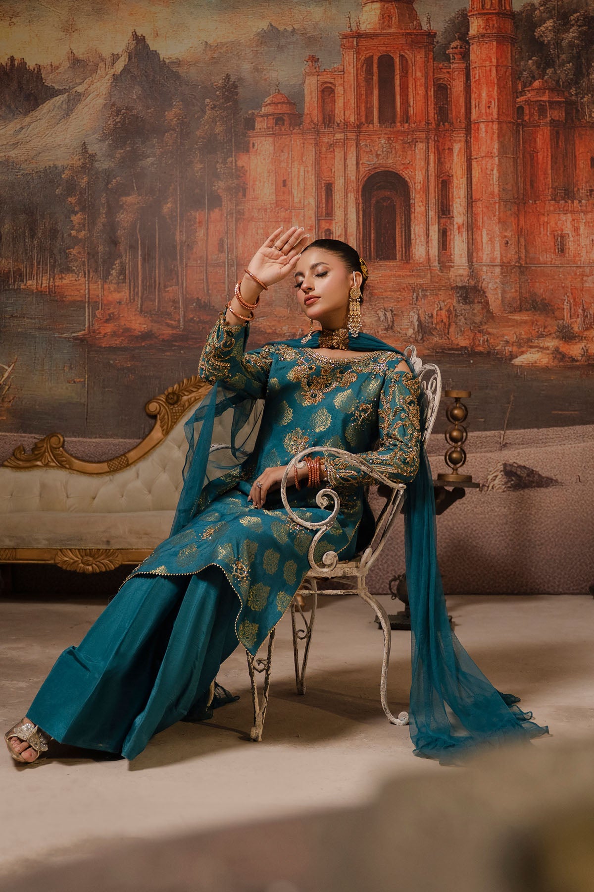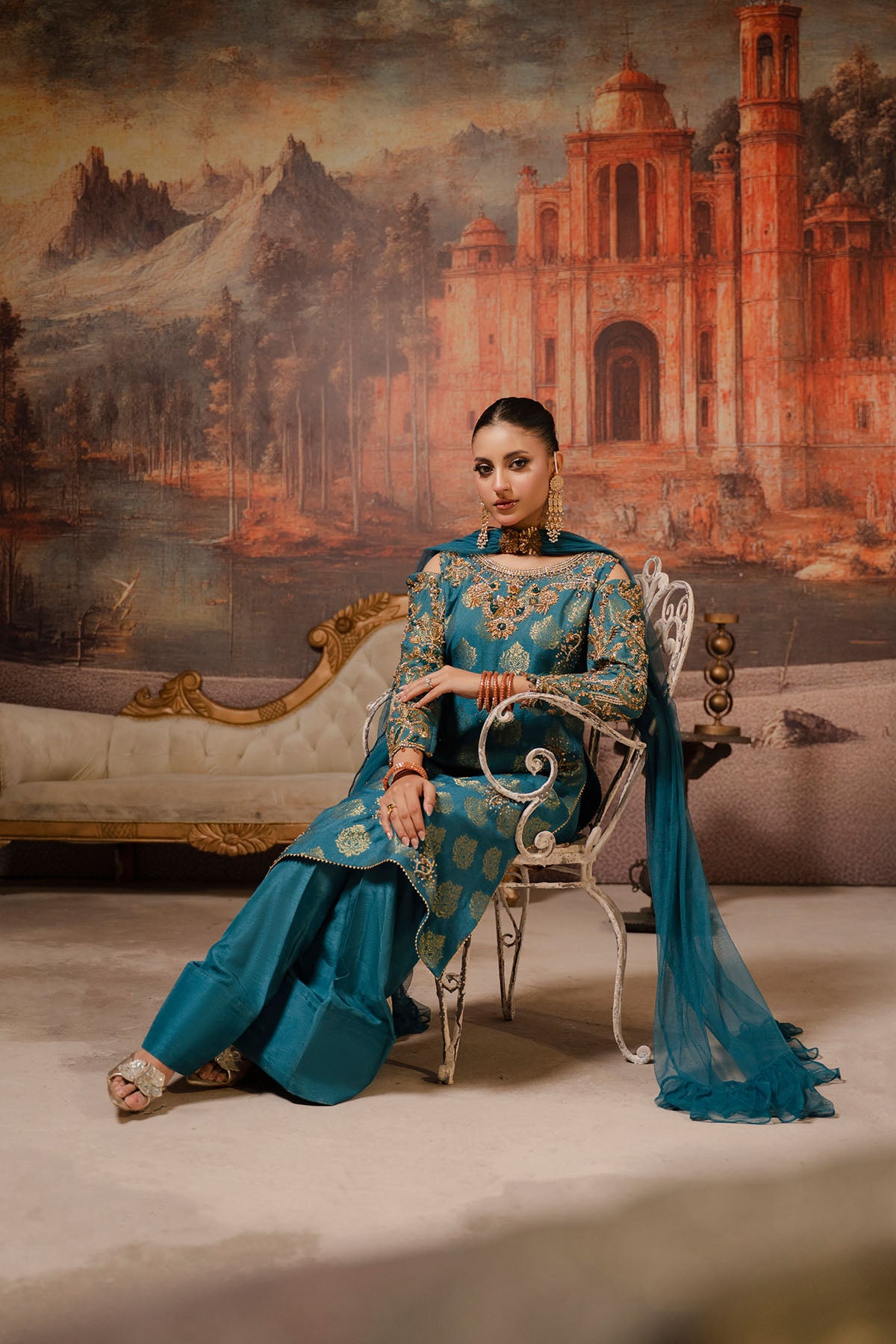 Lia - Festive Formal - Vol 3: A Teal Blue Ensemble Shimmering With Artisanal Finesse. A Banarsi Khaddi Shirt, Cut In A Timeless Straight A-Line Silhouette With High Side Slits, Is Lavishly Embroidered With Zardoze, Sequins, Resham, Crystals Hand Work, Finished With Gota. Paired With Tailored Korean Rawsilk Floor Length Izaar. The Teal Blue Airy Net Dupatta, Adorned With Butterfly Motif In The Centre And Pleated As Choker Dupatta, Drapes Like A Whisper Of Regality.