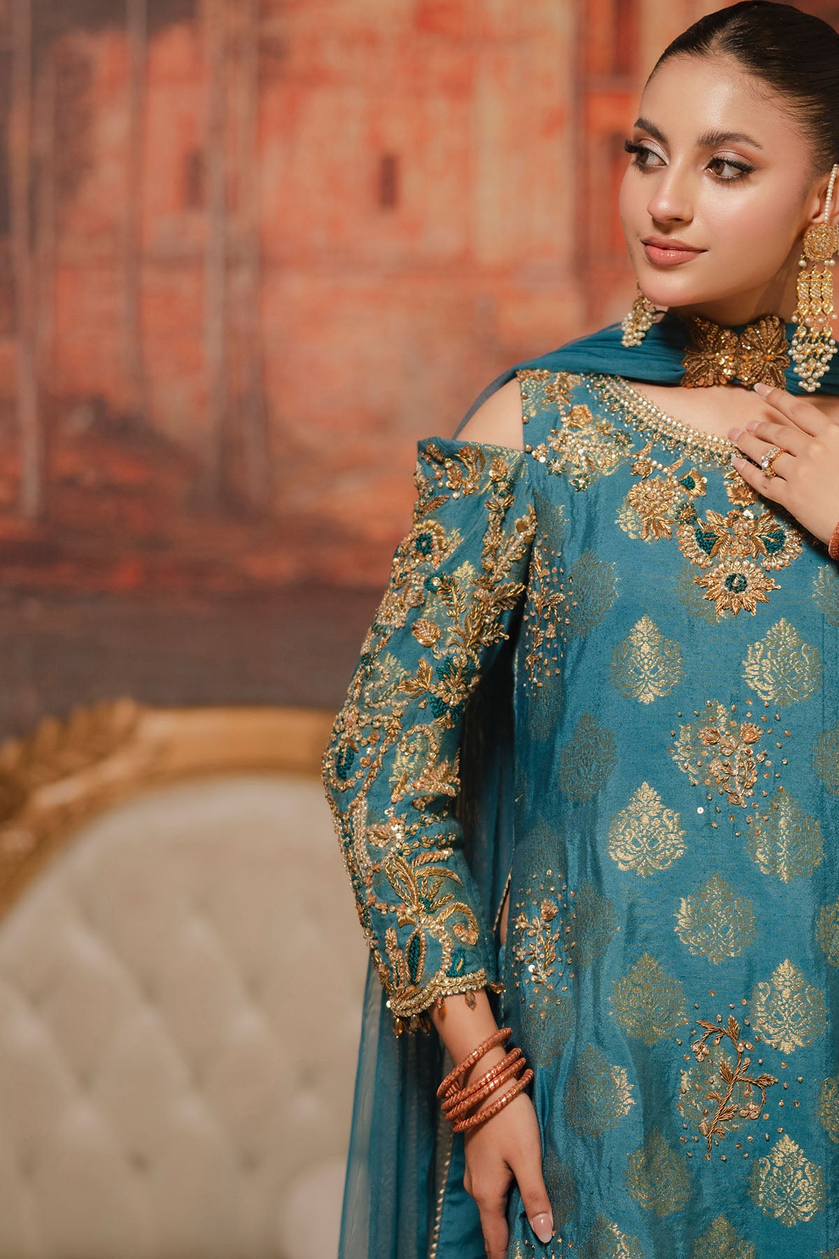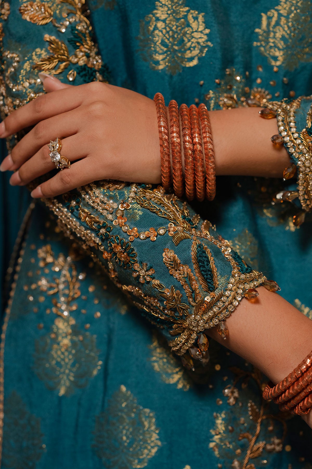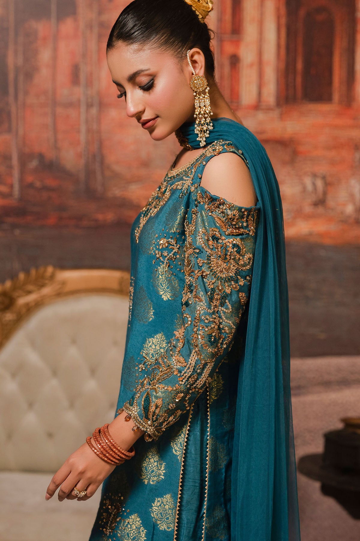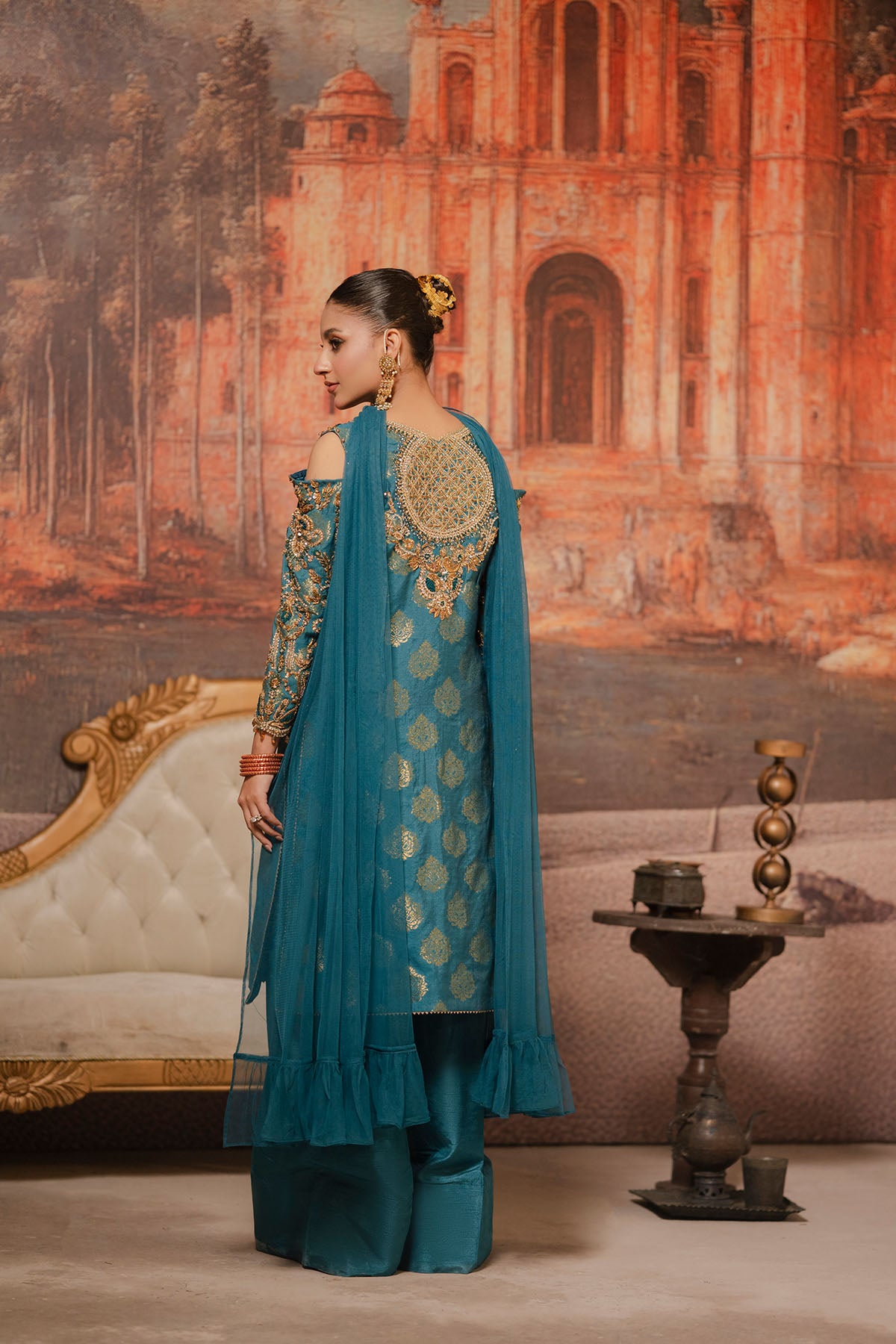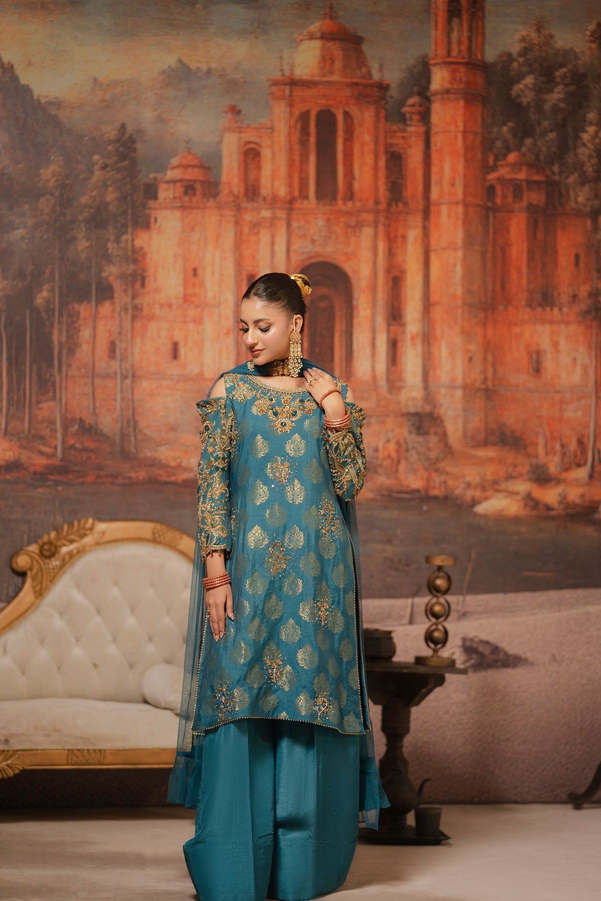 Lia - Festive Formal - Vol 3: A Teal Blue Ensemble Shimmering With Artisanal Finesse. A Banarsi Khaddi Shirt, Cut In A Timeless Straight A-Line Silhouette With High Side Slits, Is Lavishly Embroidered With Zardoze, Sequins, Resham, Crystals Hand Work, Finished With Gota. Paired With Tailored Korean Rawsilk Floor Length Izaar. The Teal Blue Airy Net Dupatta, Adorned With Butterfly Motif In The Centre And Pleated As Choker Dupatta, Drapes Like A Whisper Of Regality.