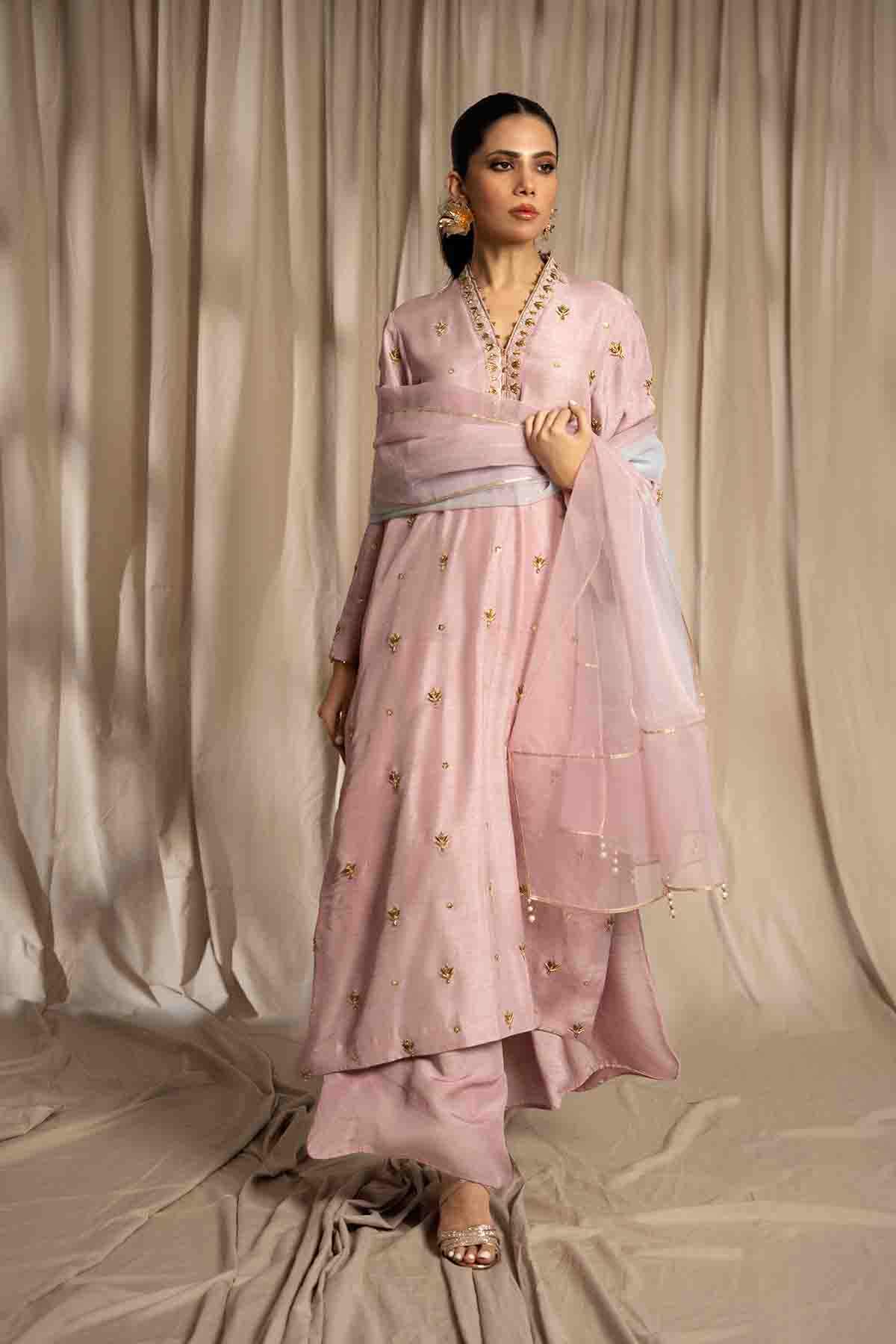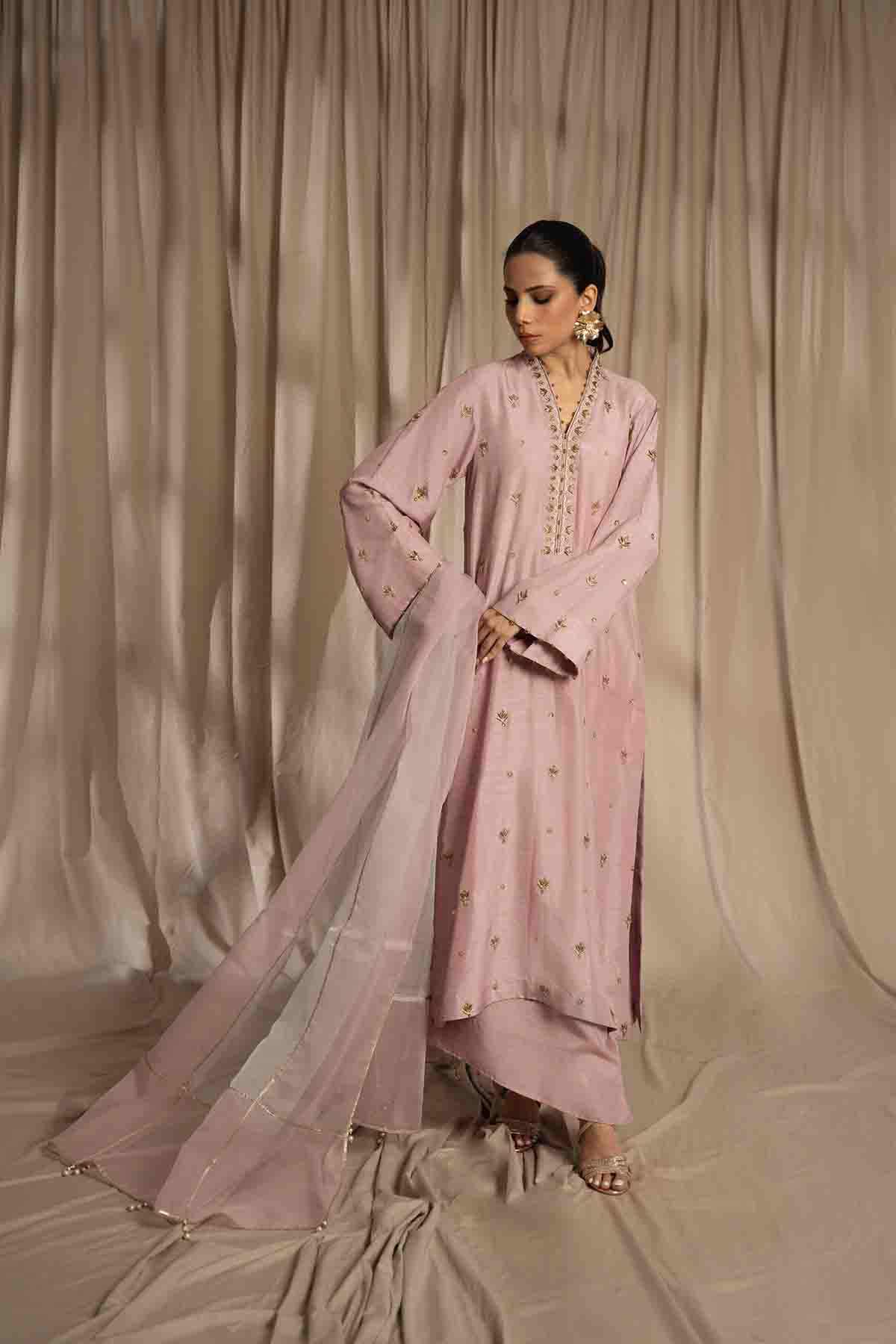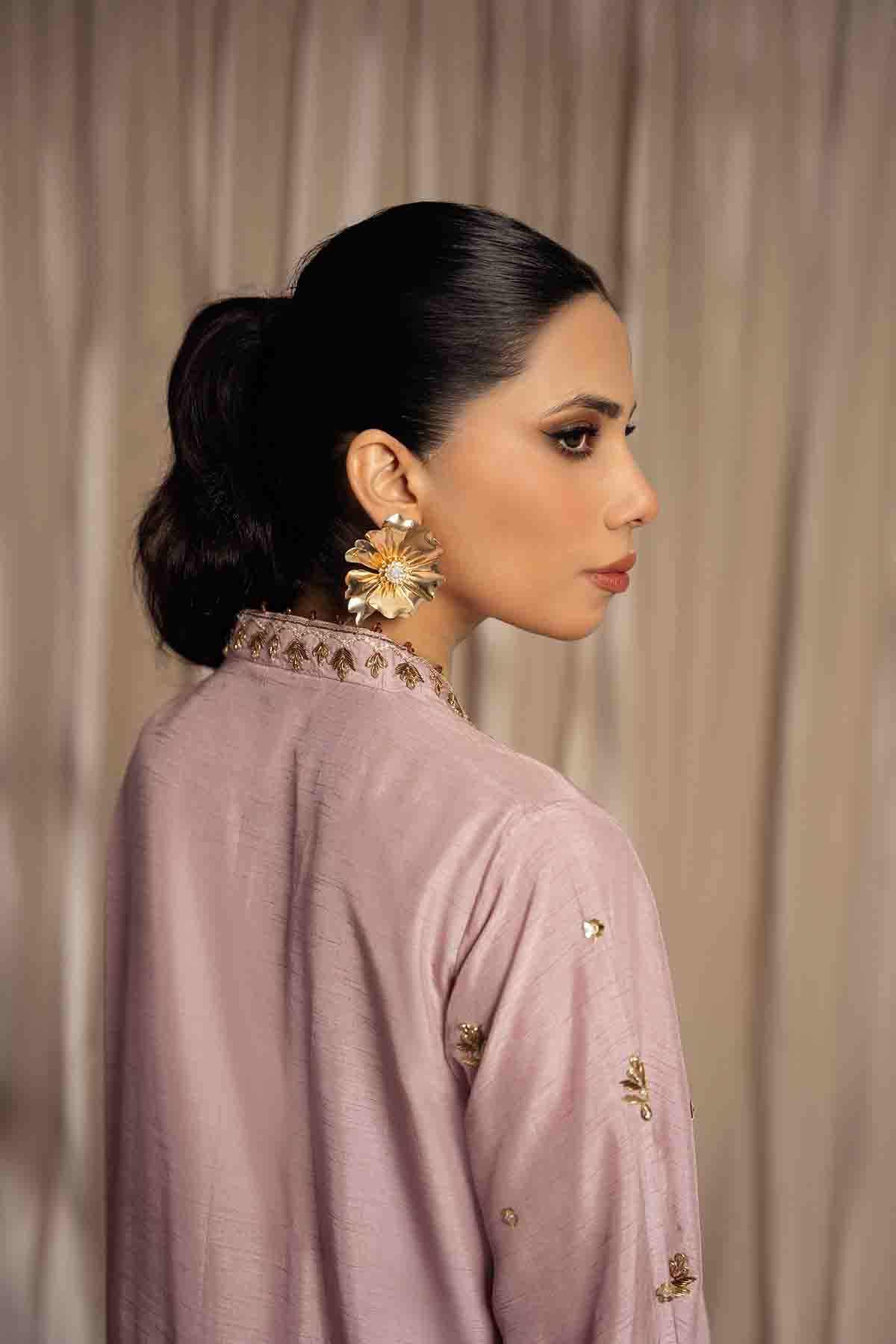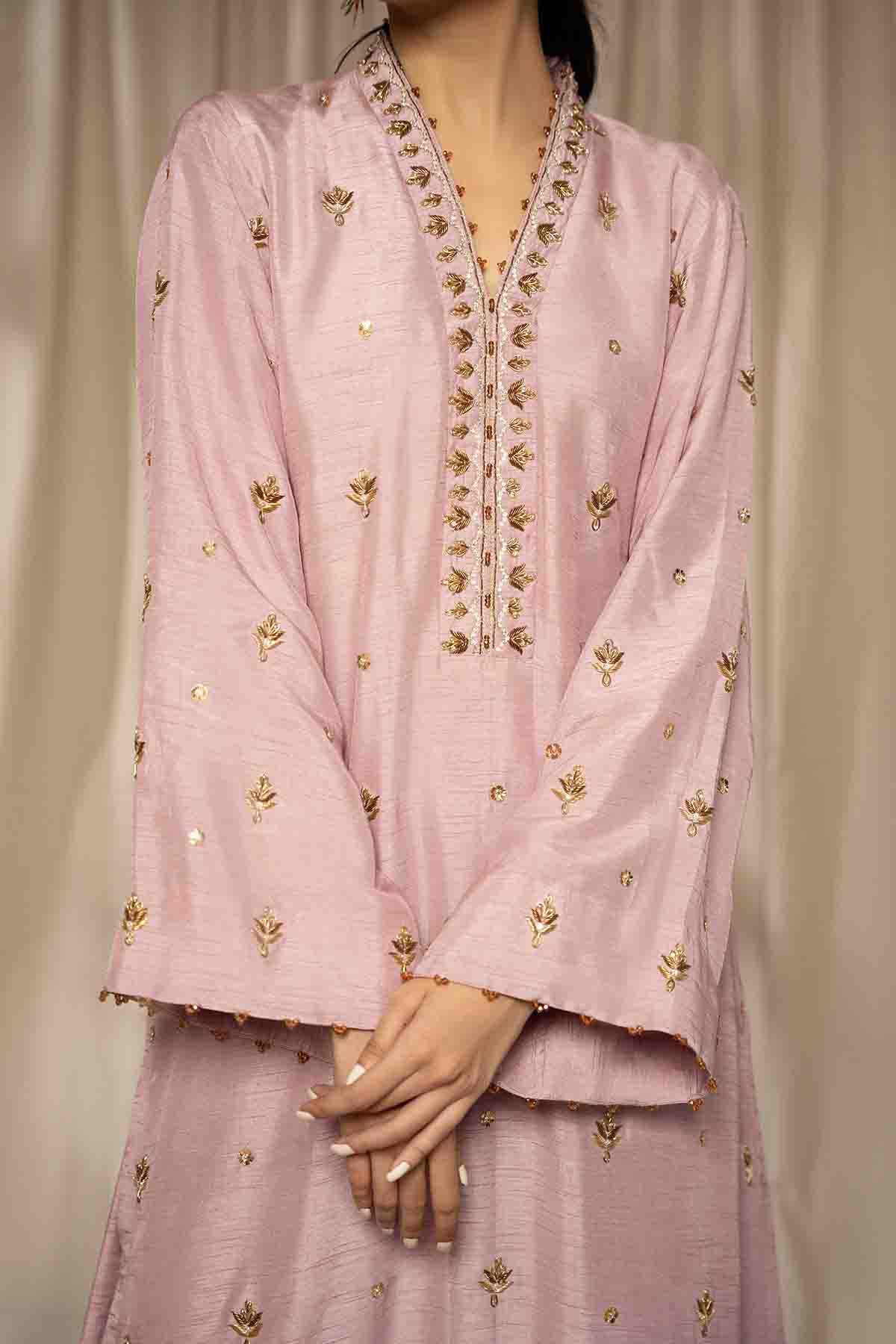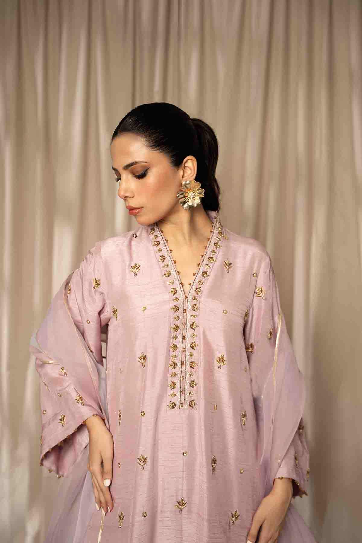LIA - Festive Formal: The Ensemble Features A Plum Lavender Korean Raw Silk Long Shirt And Free Flowing Pants With Organza Dupatta. Shirt Embellished With Zardozi, Sequins And Crystals Embroidery All Over. Organza Dupatta Finished With Dhanak And Pearl Exudes An Air Of Effortless Elegance, Making It The Perfect Choice For Any Occasion.