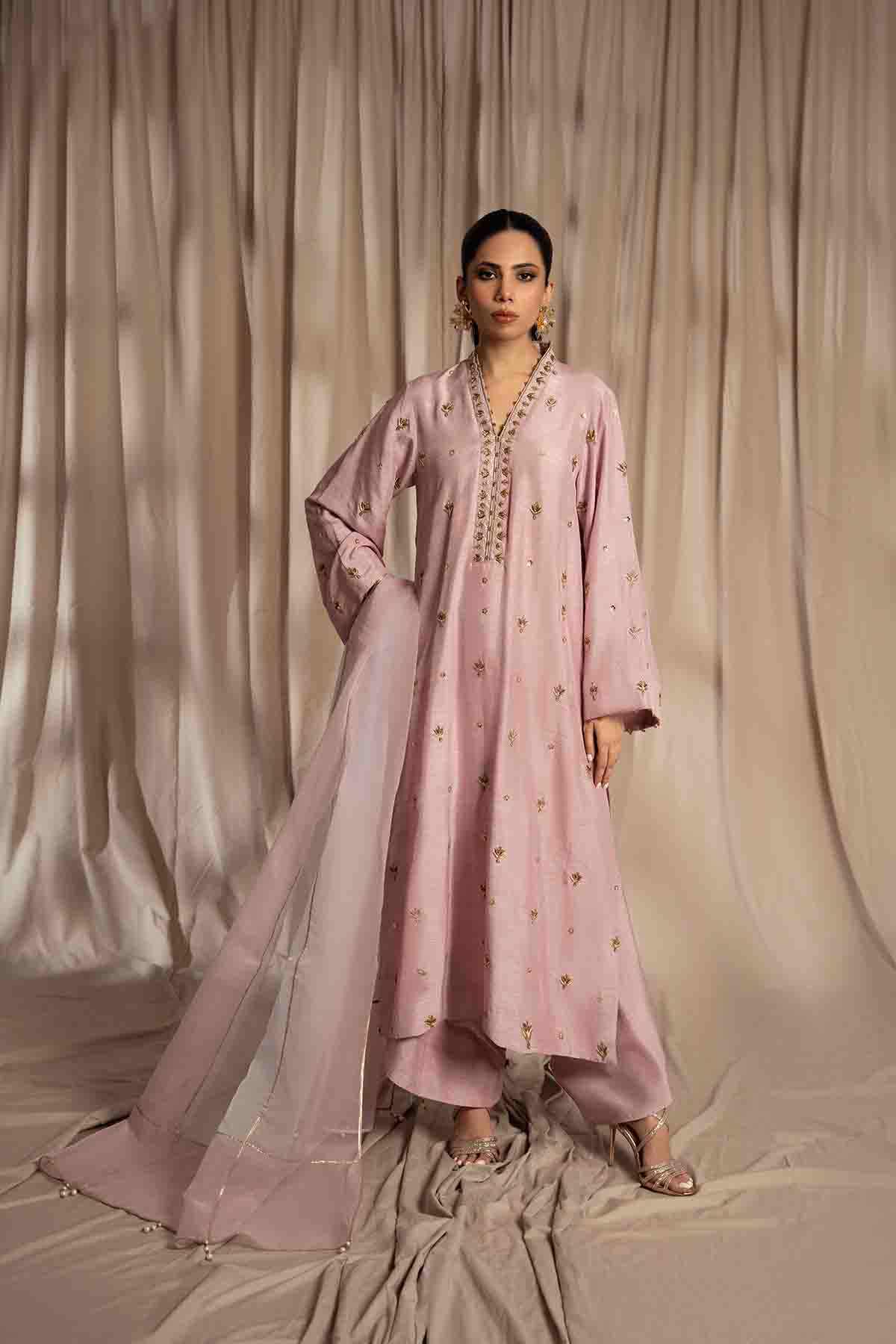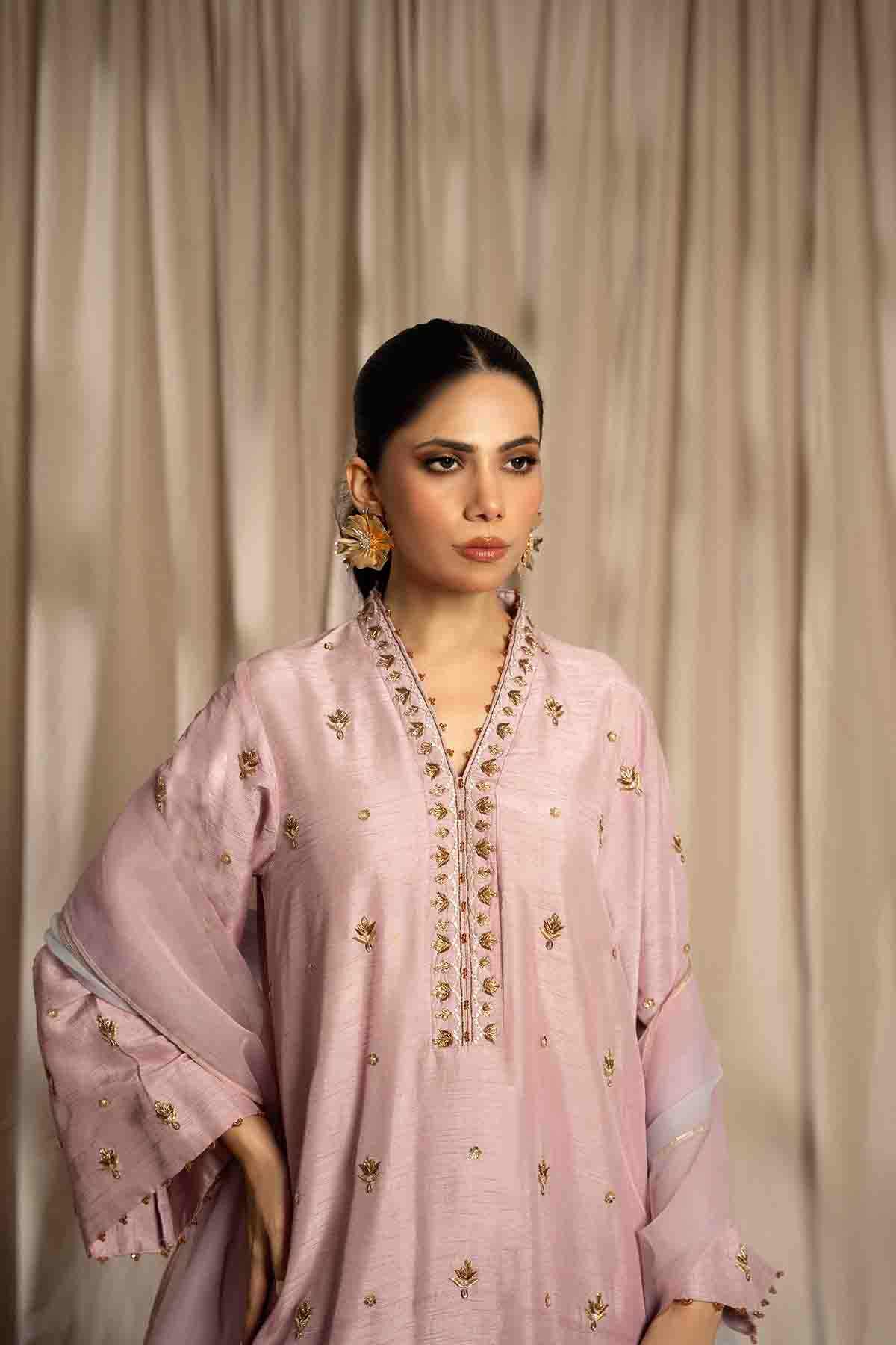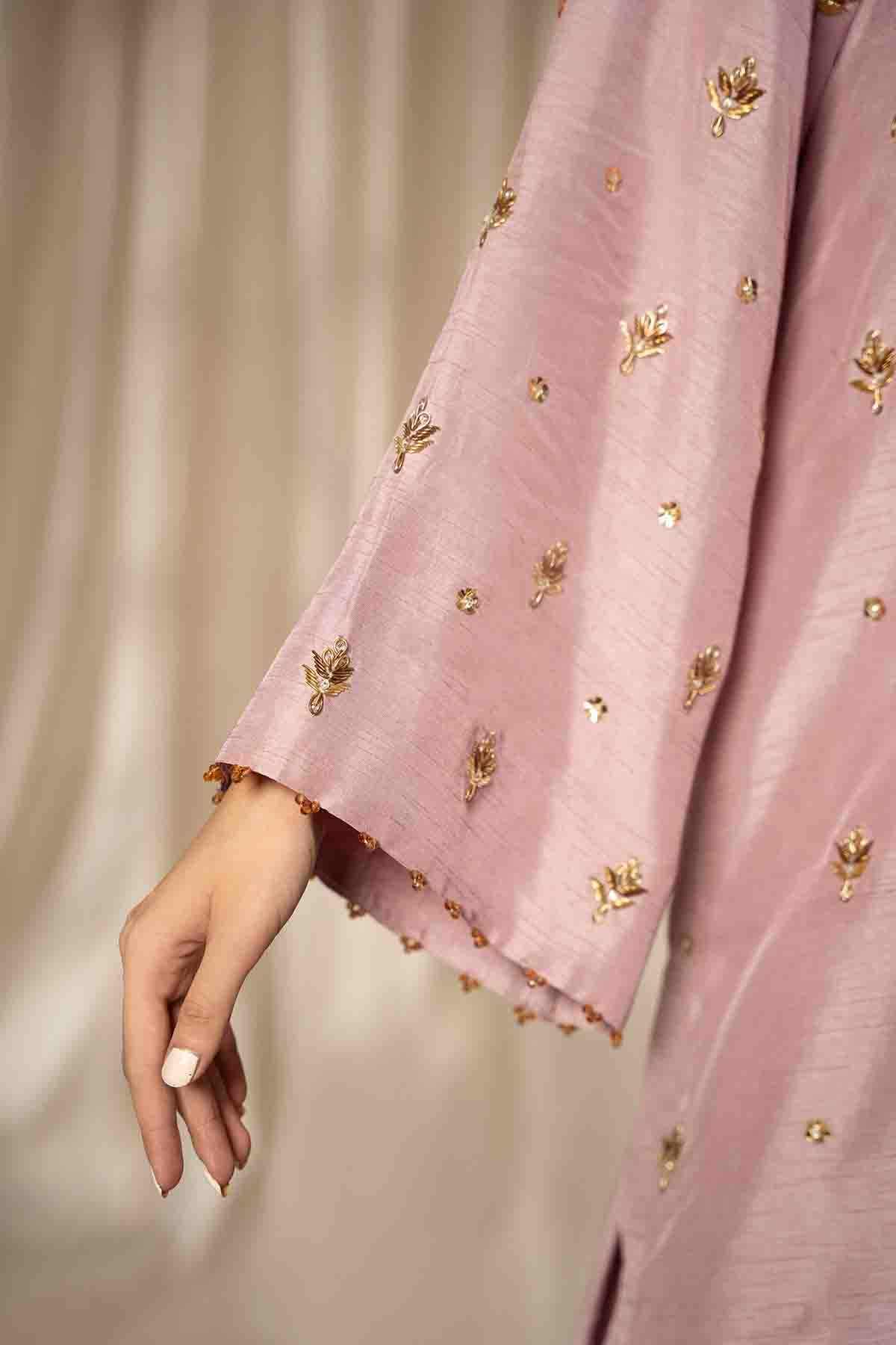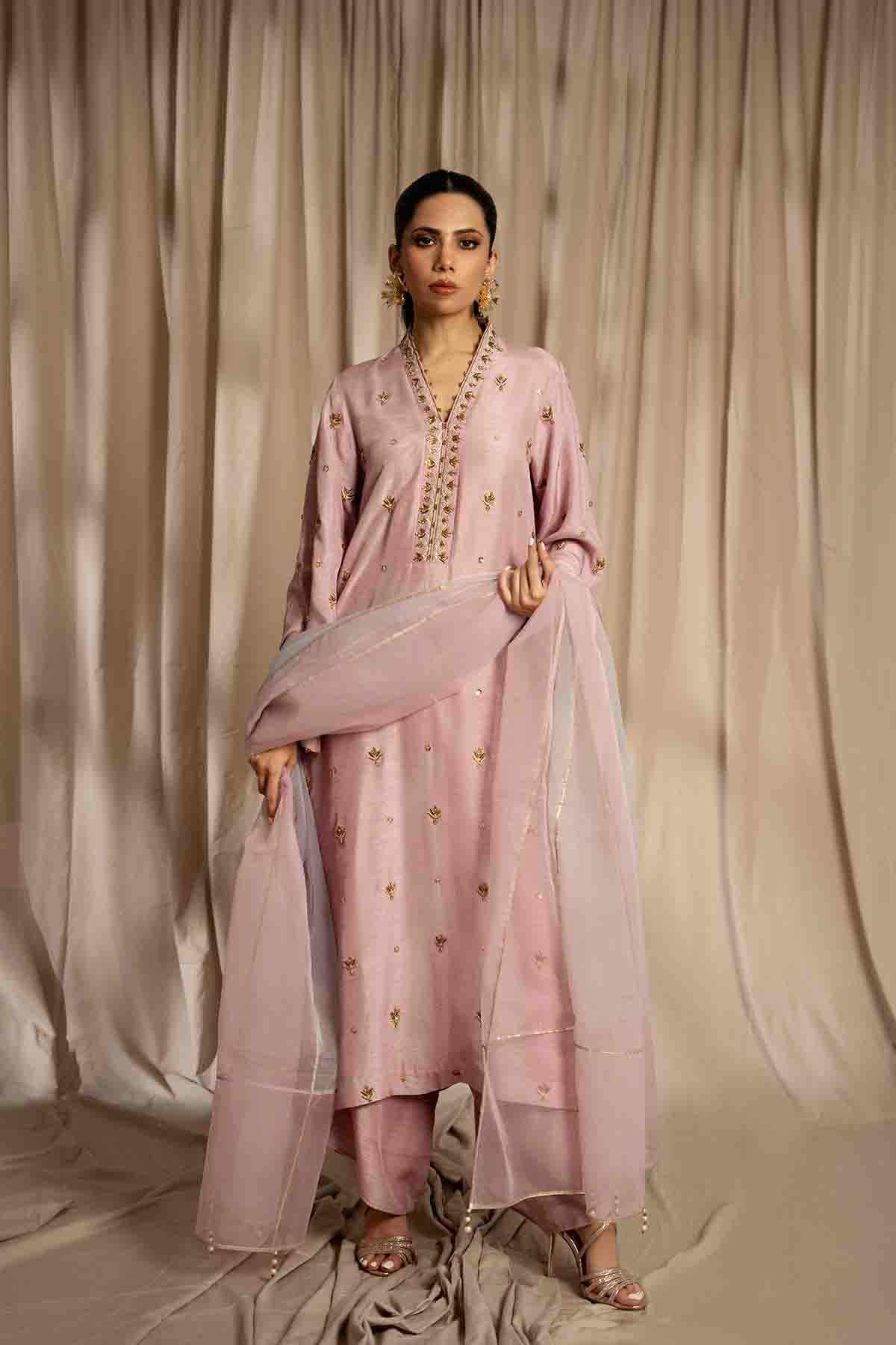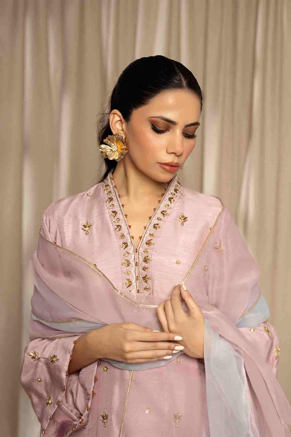LIA - Festive Formal: The Ensemble Features A Plum Lavender Korean Raw Silk Long Shirt And Free Flowing Pants With Organza Dupatta. Shirt Embellished With Zardozi, Sequins And Crystals Embroidery All Over. Organza Dupatta Finished With Dhanak And Pearl Exudes An Air Of Effortless Elegance, Making It The Perfect Choice For Any Occasion.