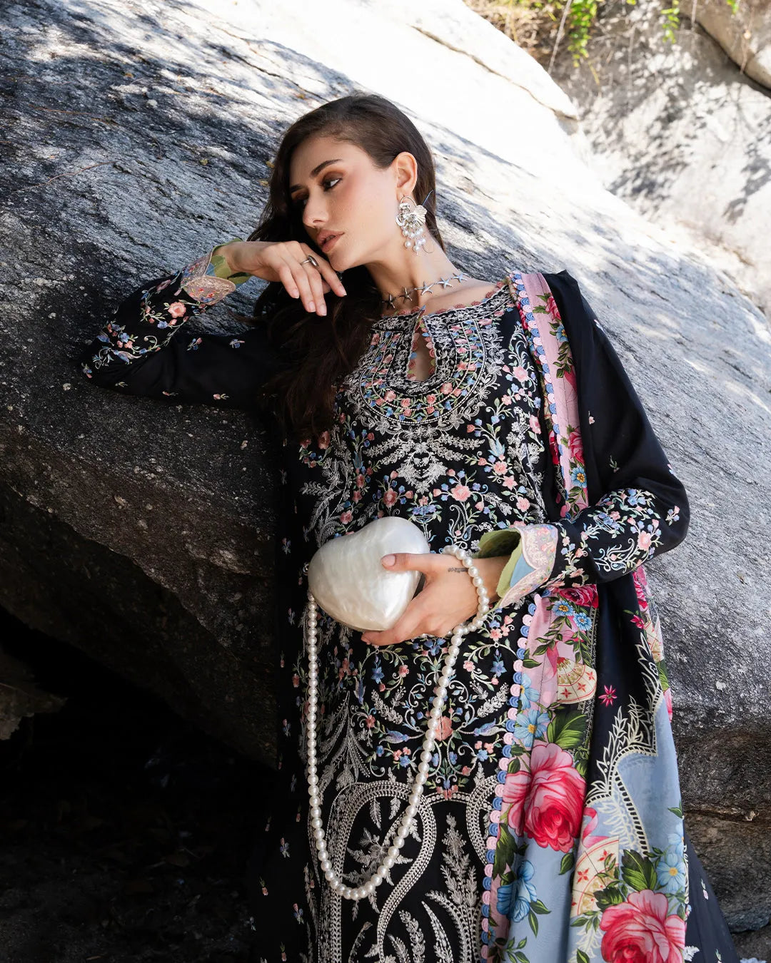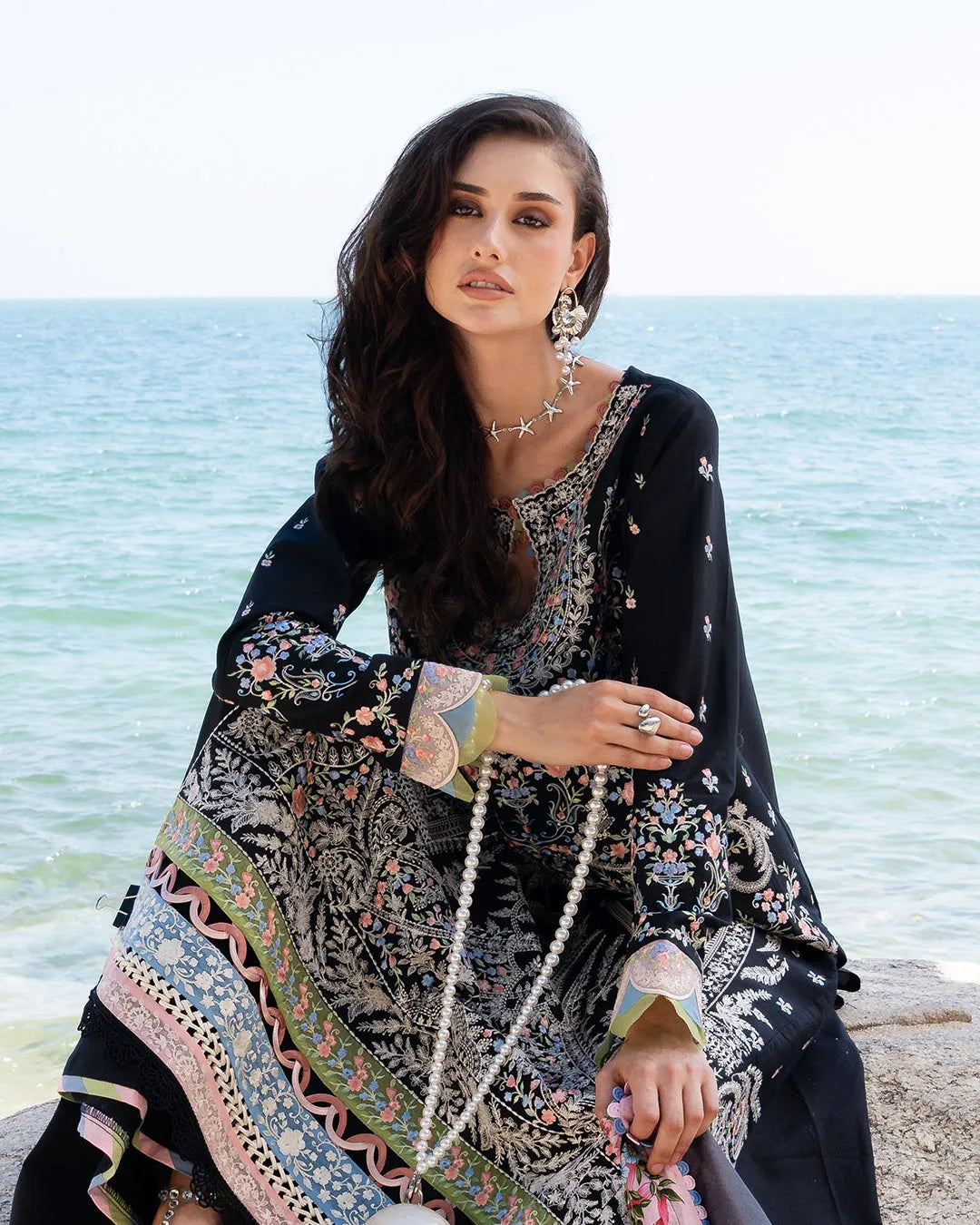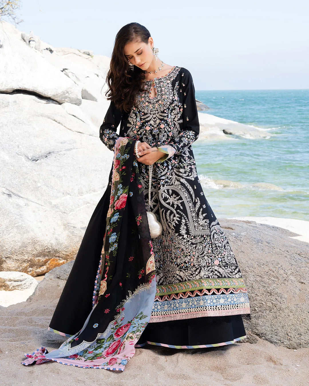 Noir is a sophisticated black lawn suit featuring an elegant A-line cut adorned with bold embroidered detailing. This refined ensemble includes coordinating dyed cotton trousers and a printed silk dupatta, creating a complete look perfect for festive celebrations and special occasions.