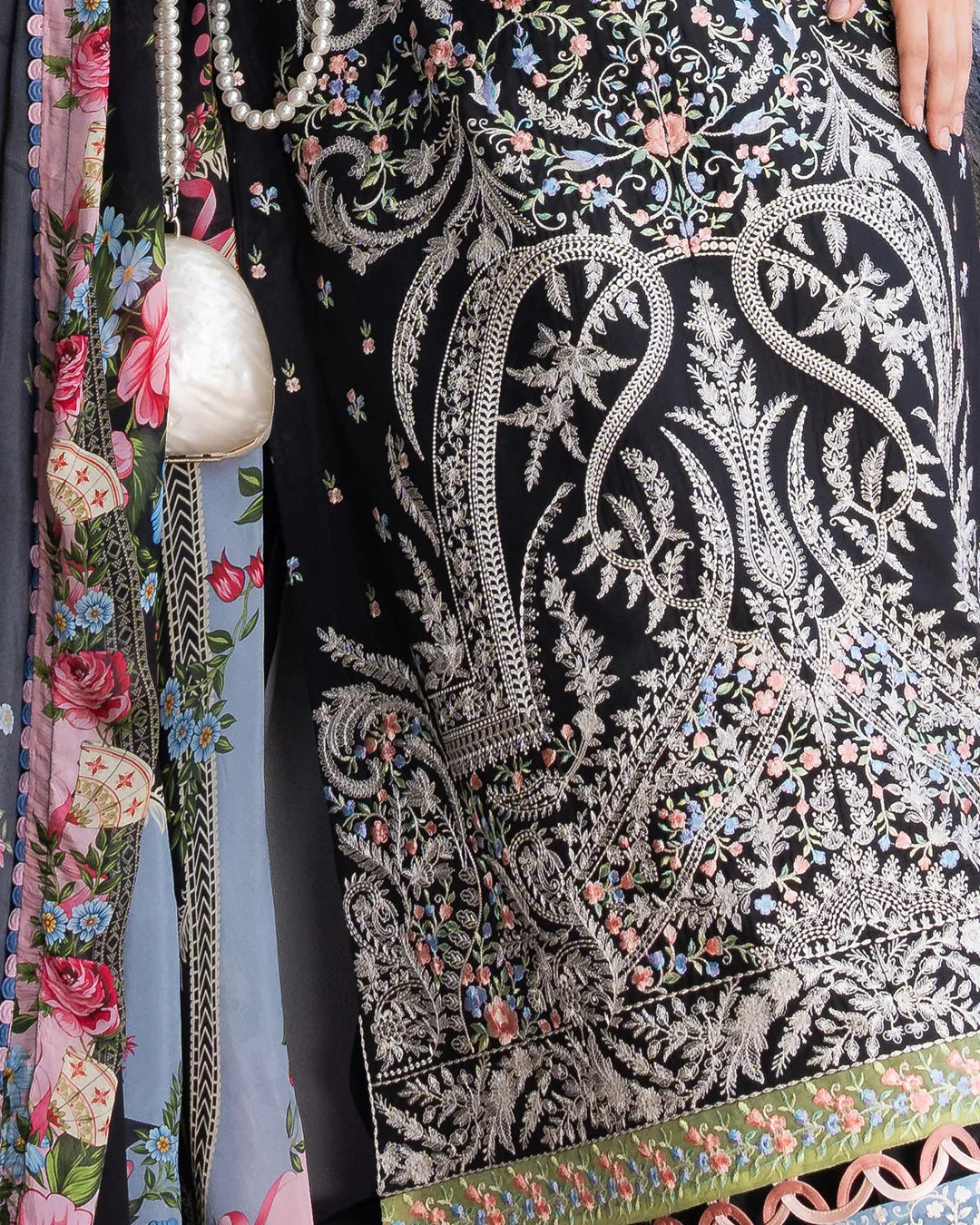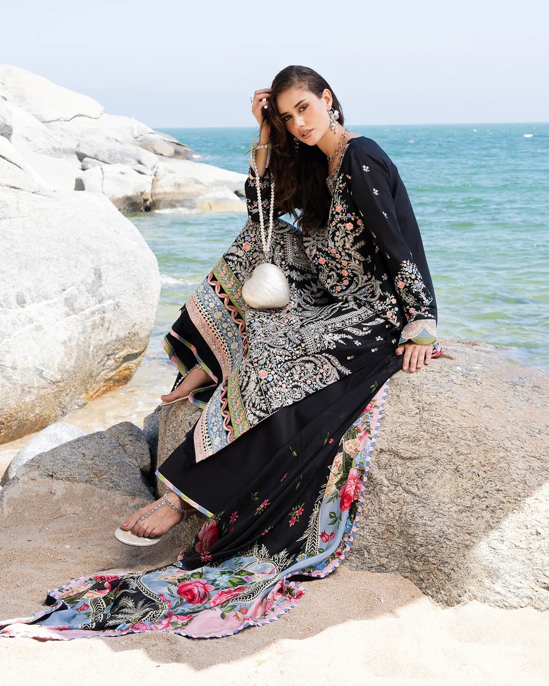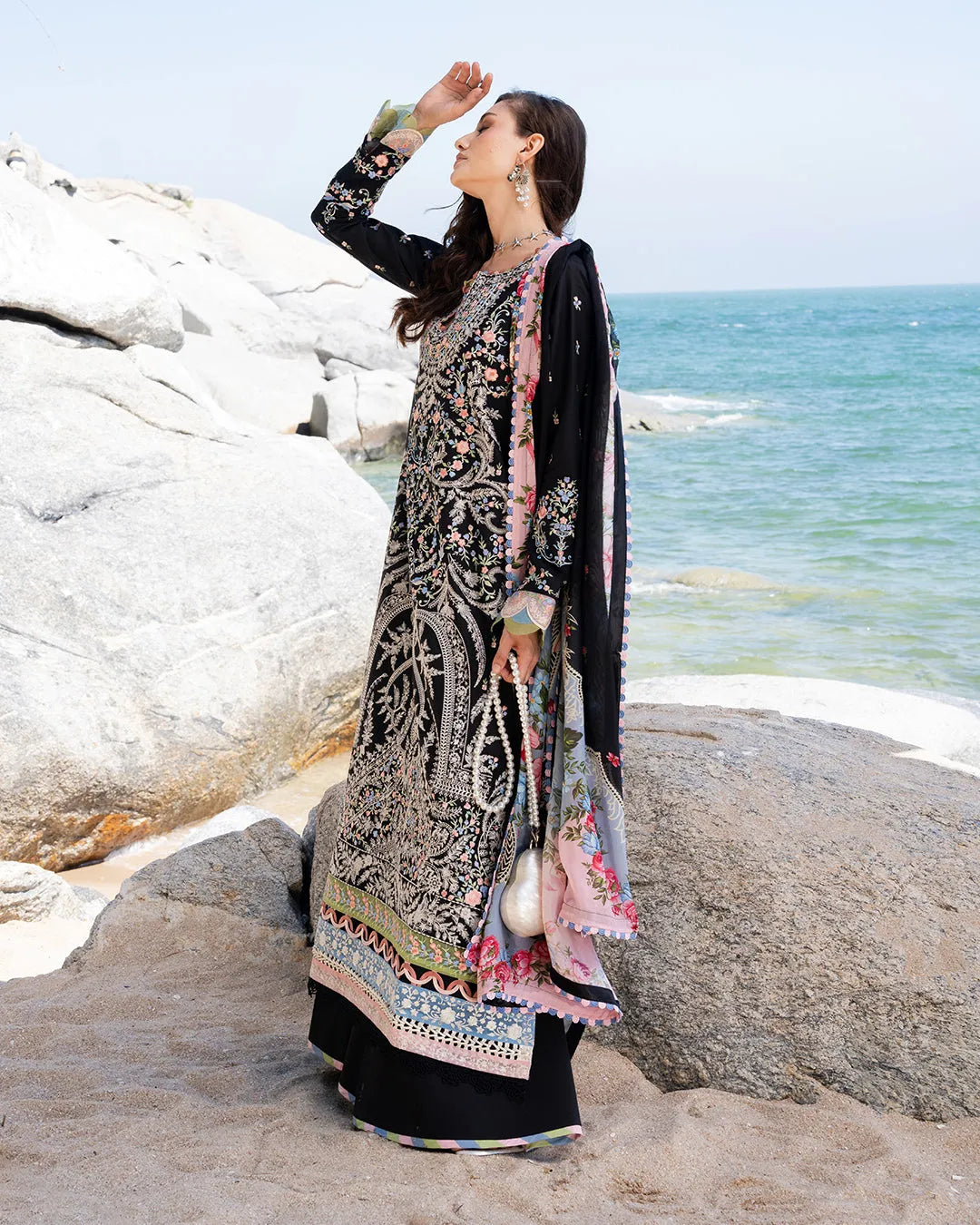 Noir is a sophisticated black lawn suit featuring an elegant A-line cut adorned with bold embroidered detailing. This refined ensemble includes coordinating dyed cotton trousers and a printed silk dupatta, creating a complete look perfect for festive celebrations and special occasions.