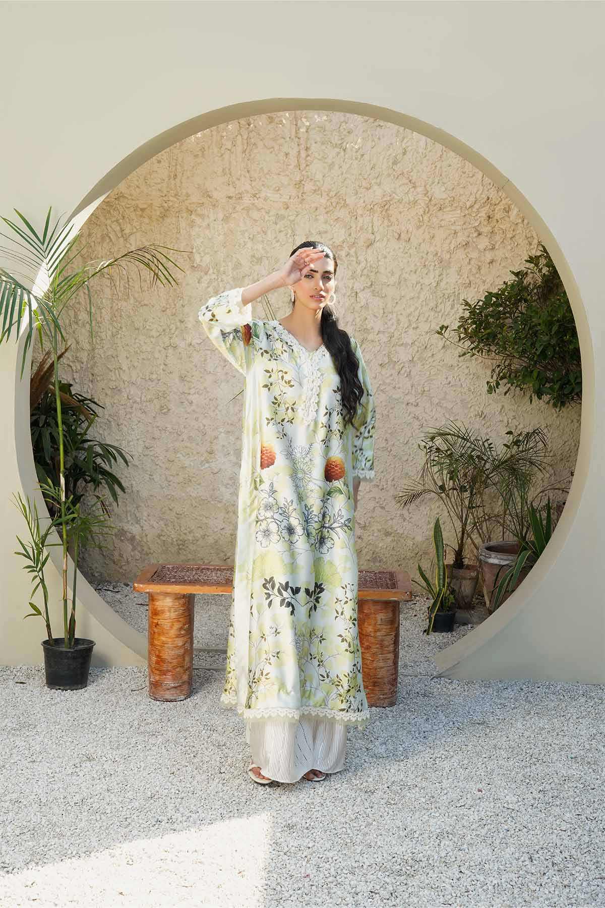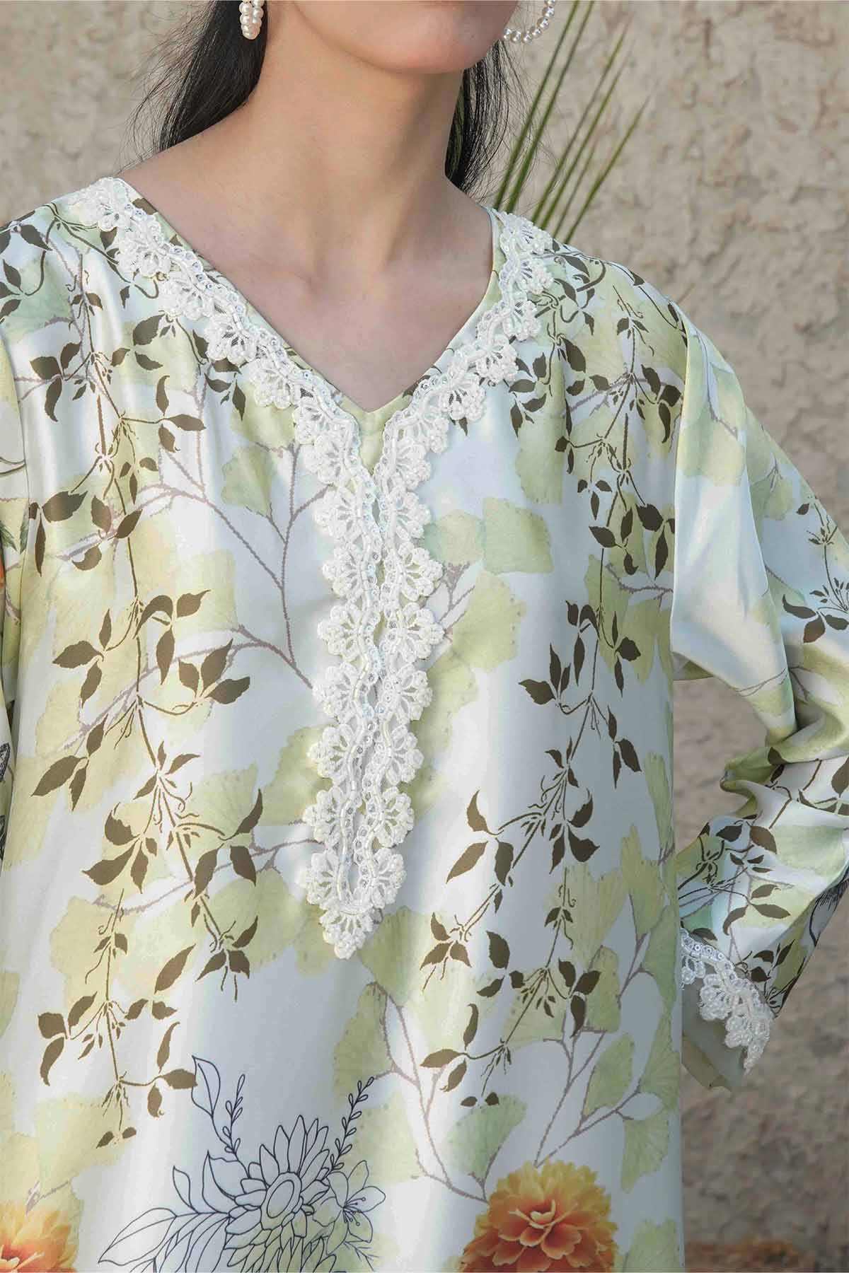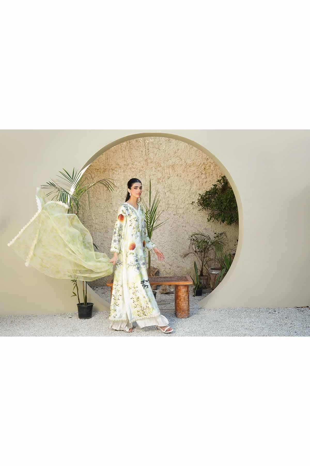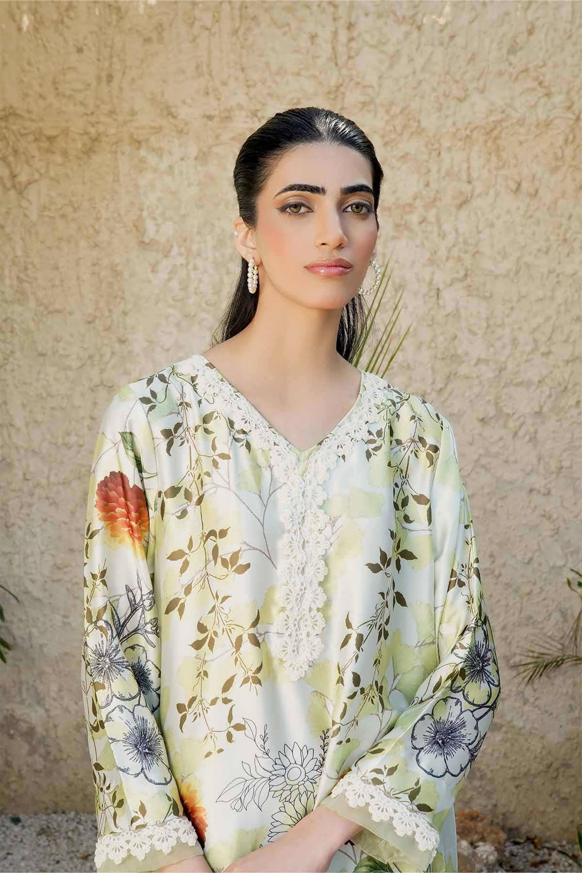 This stunning ensemble features a Charmeuse Silk floral printed shirt,crafted from a luxurious fabric that gives a soft,silky sheen.The shirt is beautifully adorned with lace work at the neck,sleeves, and bottom,adding a touch of elegance and intricate detailing.The lace enhances the feminine charm of the shirt,creating a sophisticated and delicate look.The shirt also includes organza detailing at the sleeves and bottom hem,offering a light,airy texture that perfectly complements the silk.The sheer organza adds a soft volume and depth,further elevating the overall design with a graceful and ethereal touch.Paired with the shirt are off-white foil printed trousers,which offer a neutral yet refined base.The trousers are detailed with peco work at the bottom leg,adding a unique,intricate touch that highlights the artistry of the design.To complete the look,the ensemble includes a printed organza dupatta that mirrors the floral motifs of the shirt.The sheer fabric of the dupatta provides a soft,delicate finish,and the print ties the whole outfit together,giving it a cohesive and elegant look.