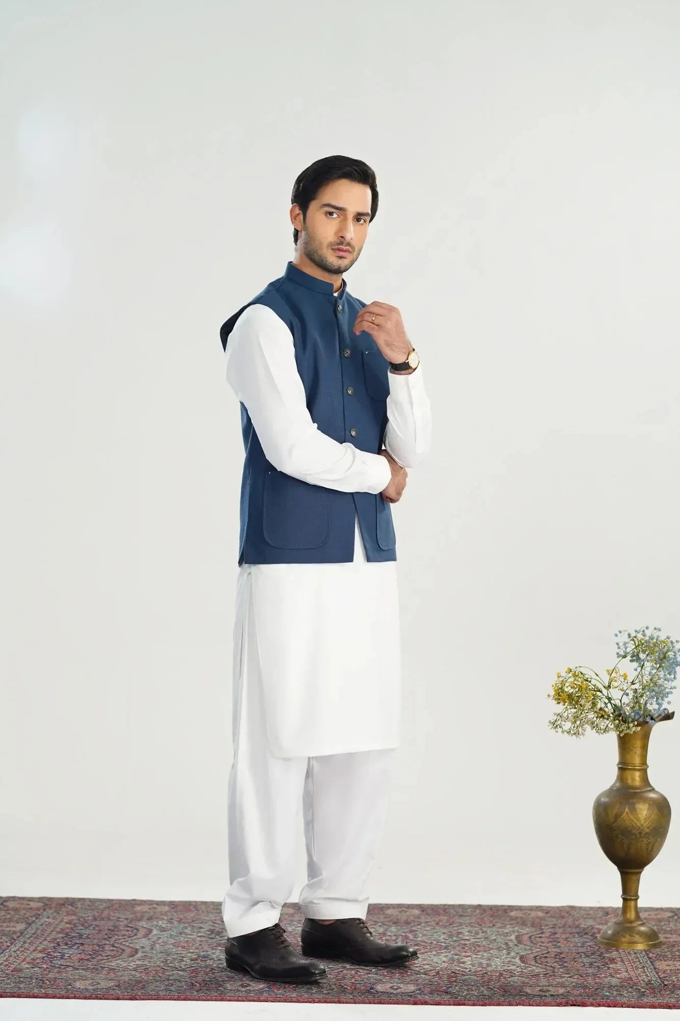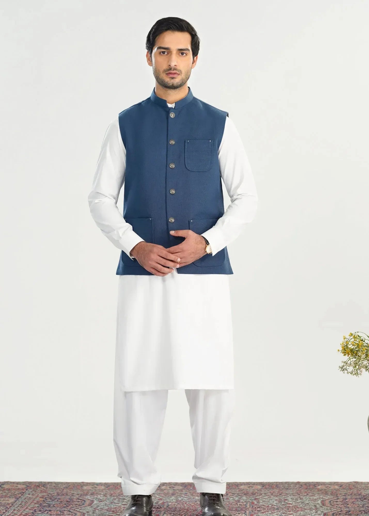 Off White Kurta Shalwar with Navy Blue Khaddar Waistcoat - A-Line Cut - Men