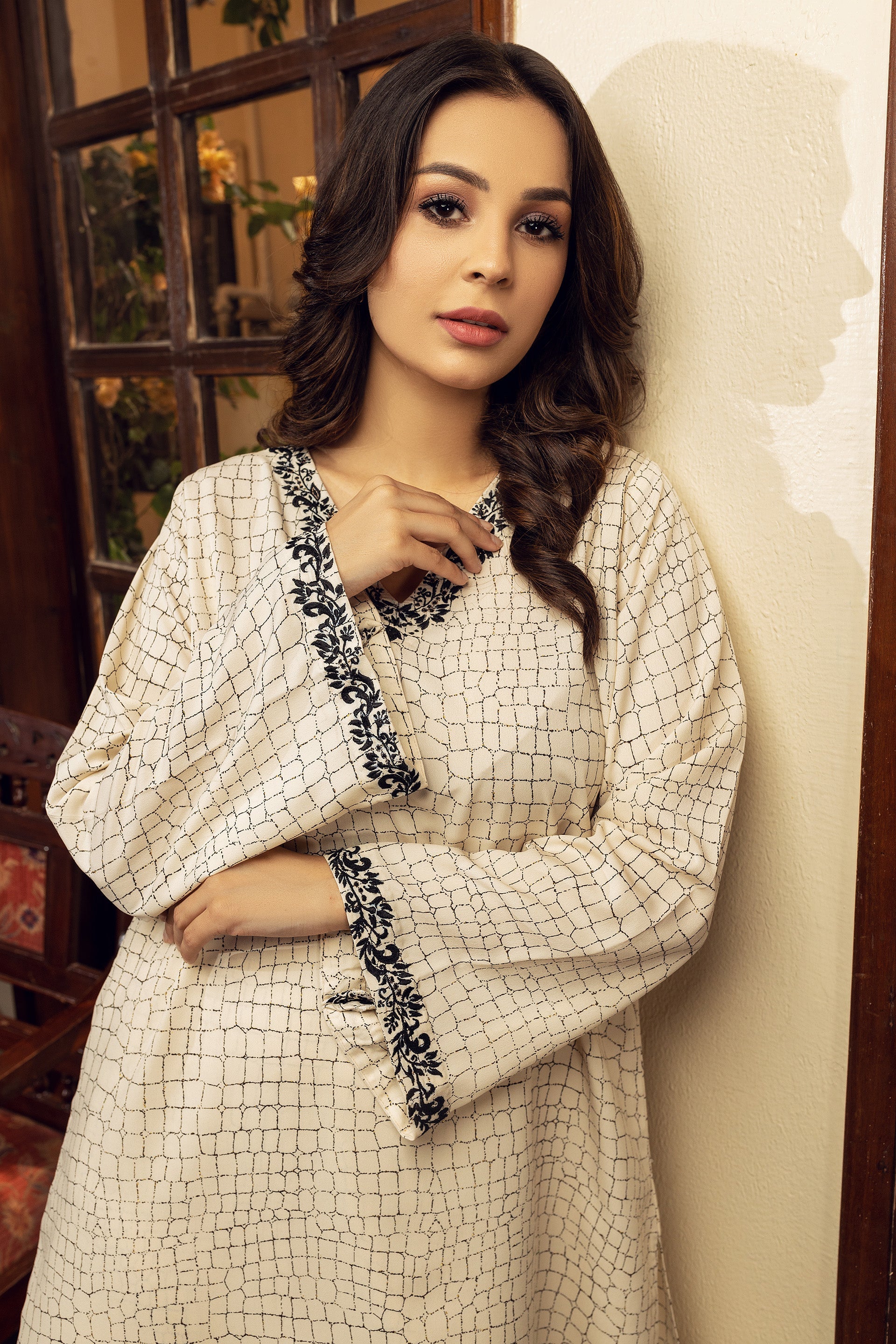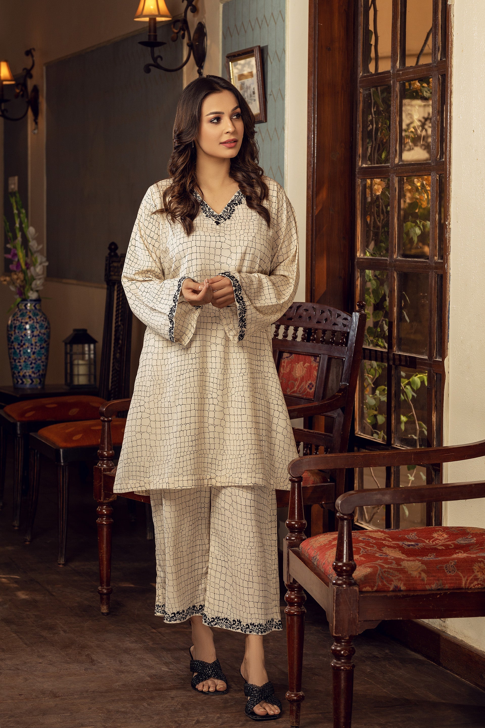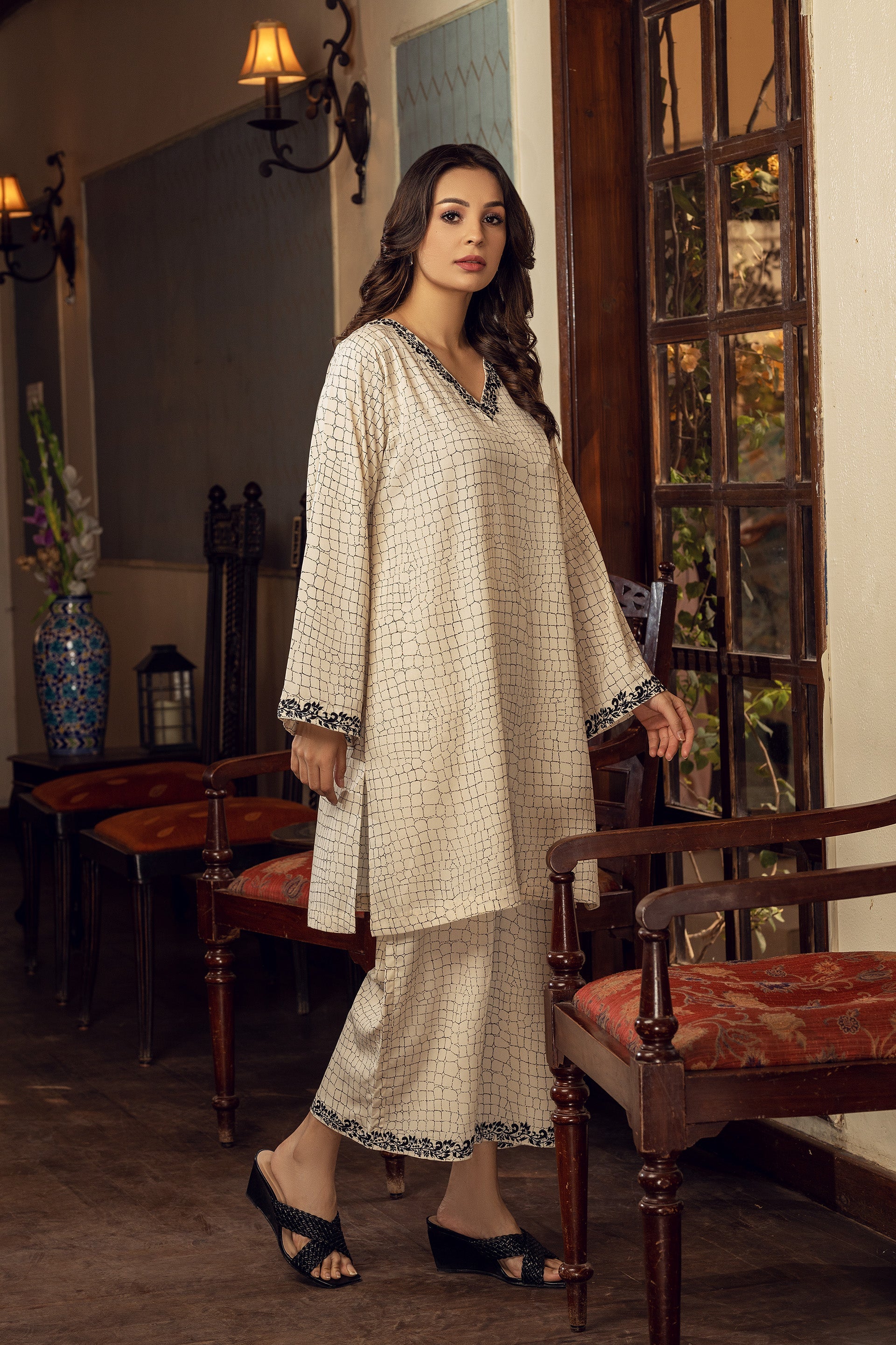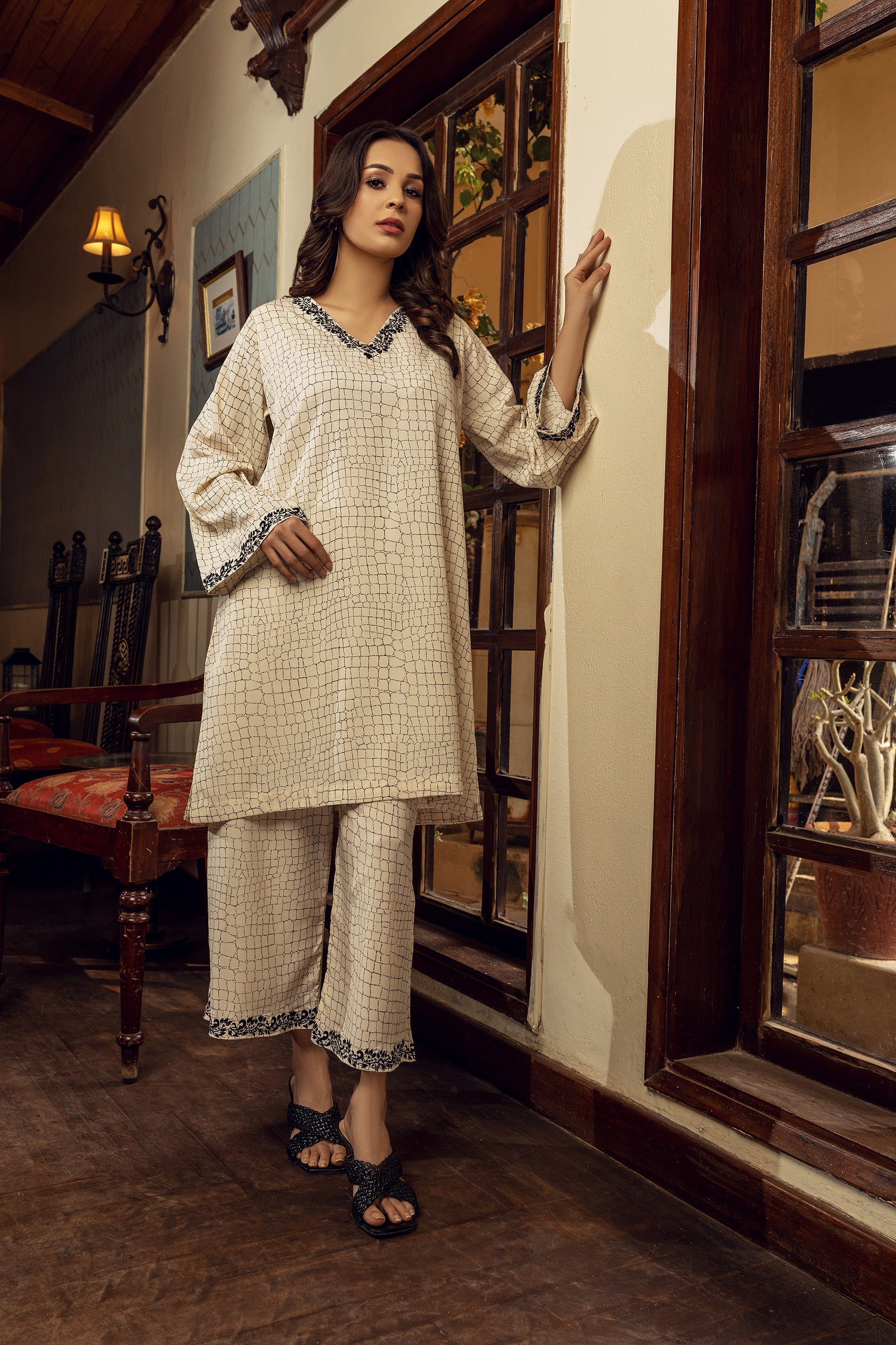 Introducing our off-white straight cut suit made of imported Korean crepe. The suit is detailed with intricate machine embroidery on the neckline and sleeves and comes with matching culottes pants. The suit is made of high-quality crepe material that drapes beautifully on your body, providing a flattering and elegant silhouette. Whether you're attending a formal event or going on a dinner date, this suit is perfect for adding glamour to your wardrobe.