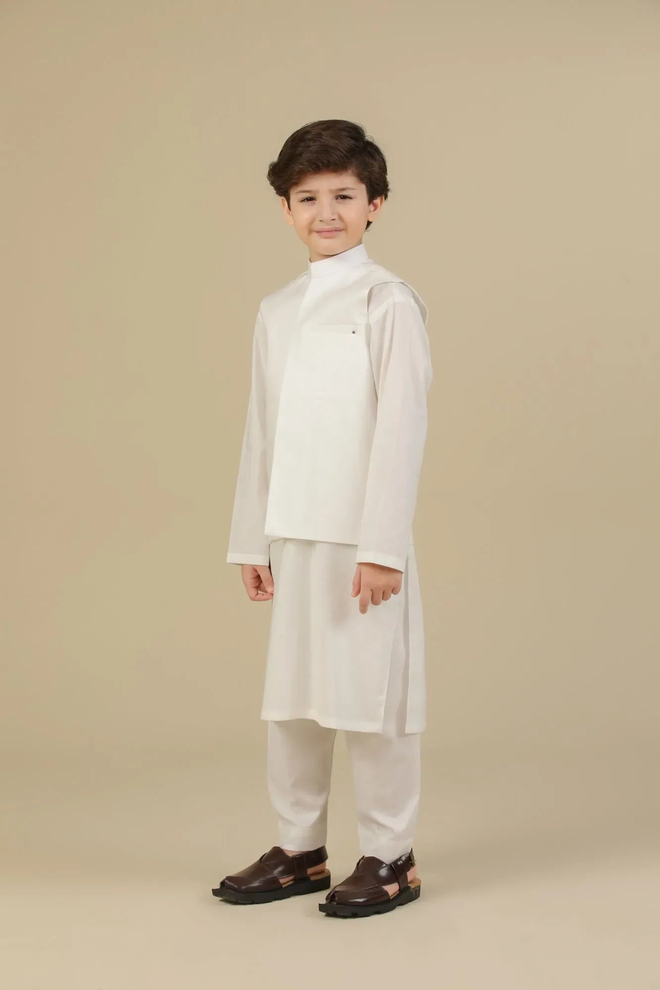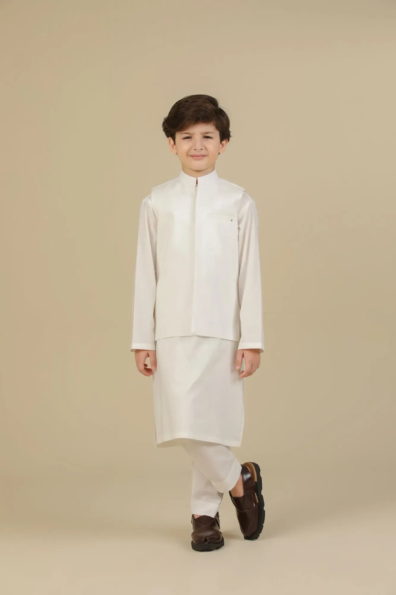 Off White Soft Cotton Kurta Trouser with Waistcoat - Kids