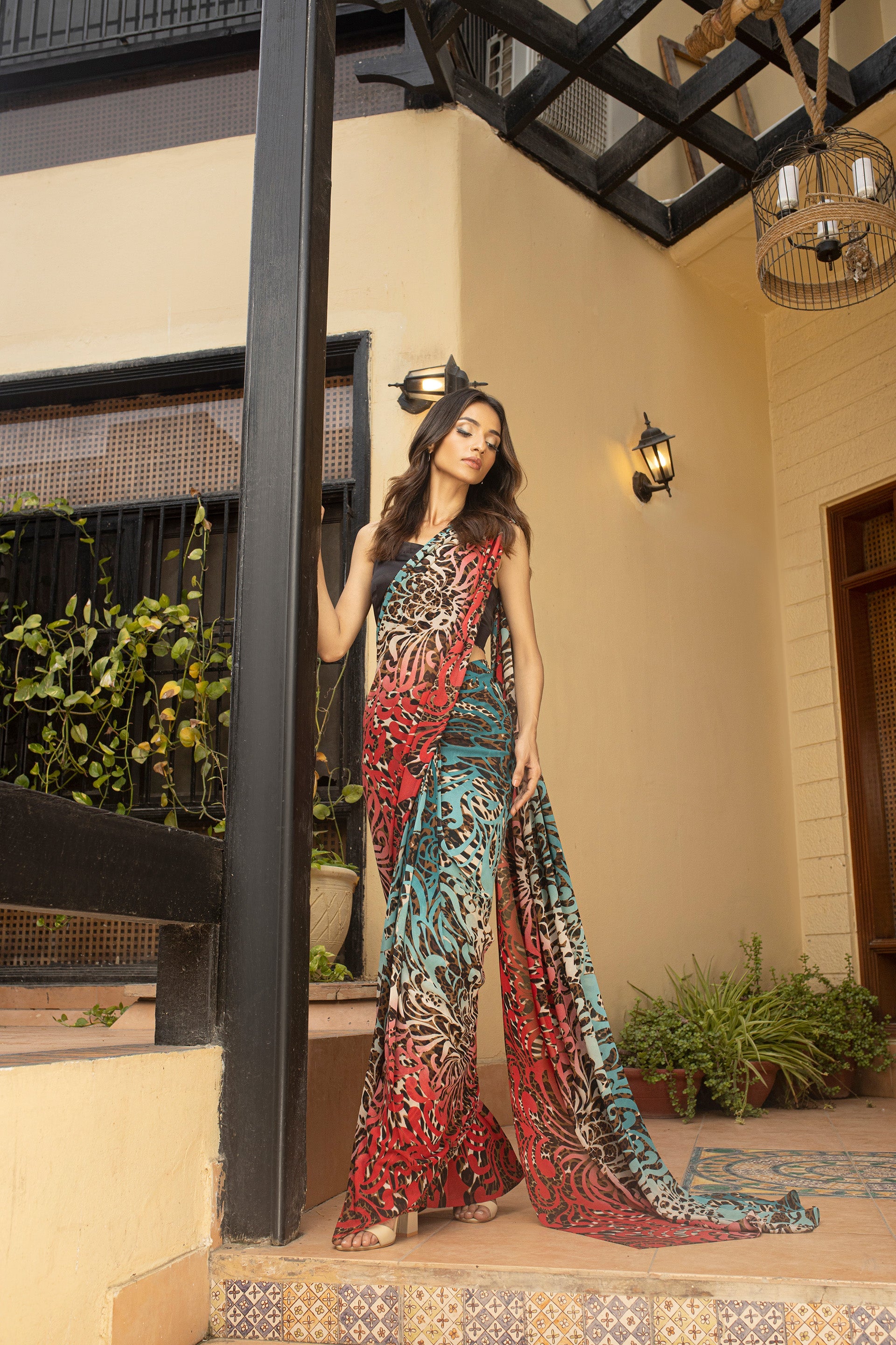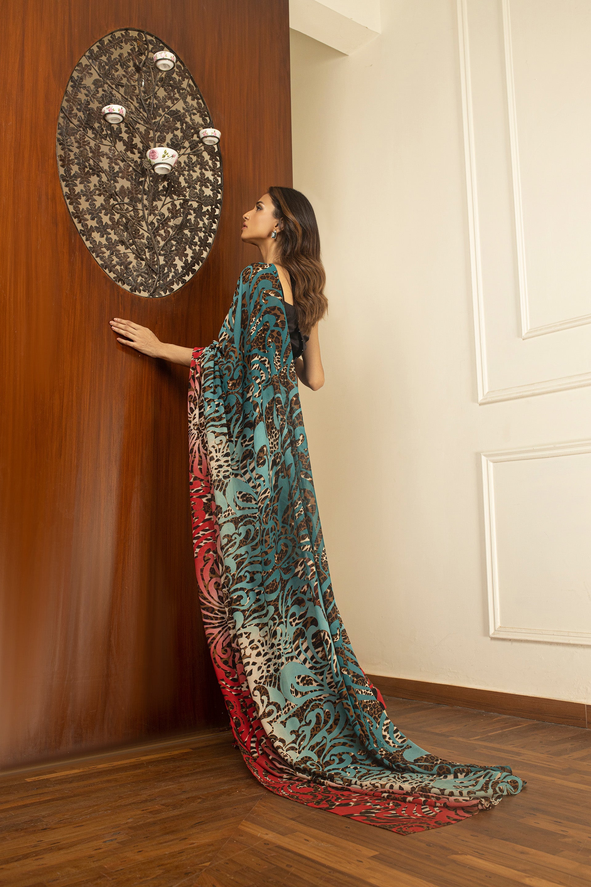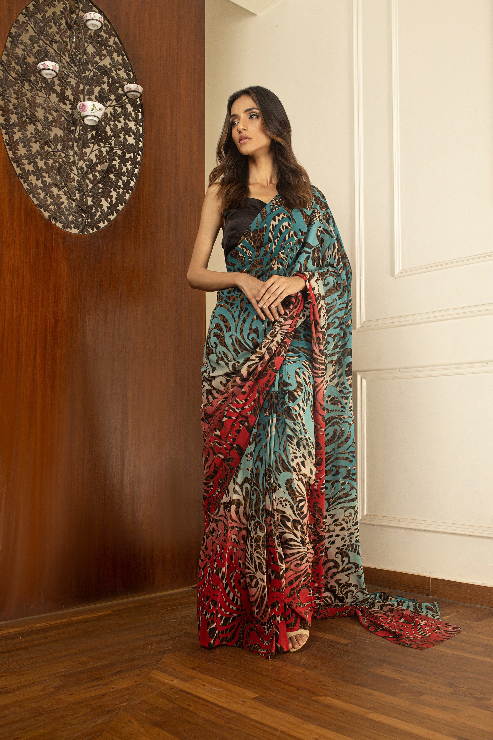 Accompanying the saree is a sophisticated Black blouse that perfectly balances the vibrant tones, creating a harmonious contrast. Designed with an eye for elegance, this saree ensemble is the perfect choice for enchanting evening occasions, allowing you to make a bold yet refined statement with your attire.
