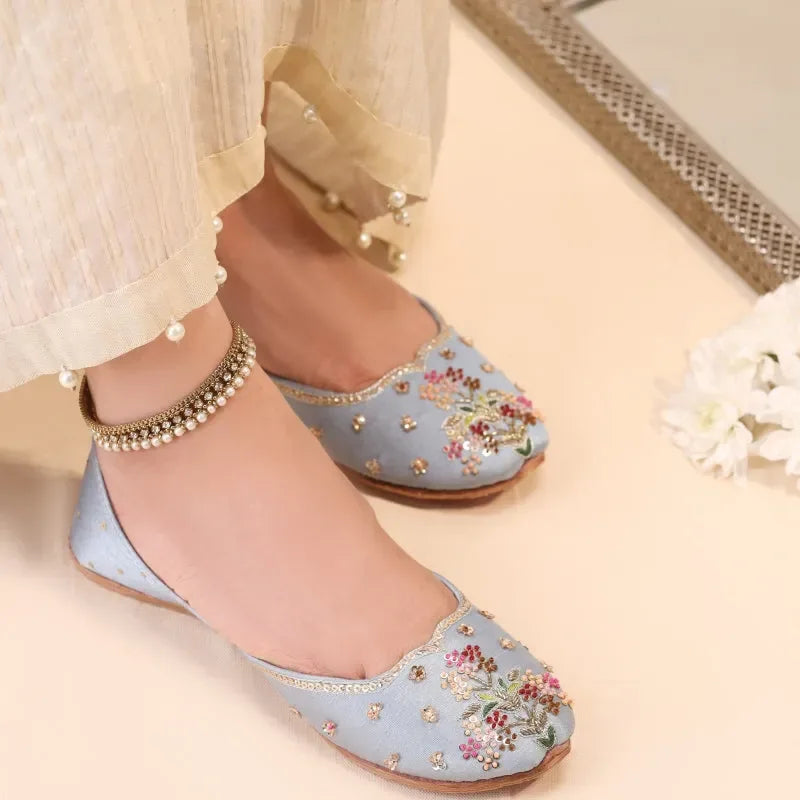 A luxe powder blue khussa with a vivid red lining and handwork that blooms in ombre. Ombre Oasis features clustered florals in jewel tones with gold sequins and cut dana that graduate in depth for a rich, dimensional look. Master artisans finish each pair by hand. A cushioned insole and flexible sole keep you comfortable from ceremony to after party.