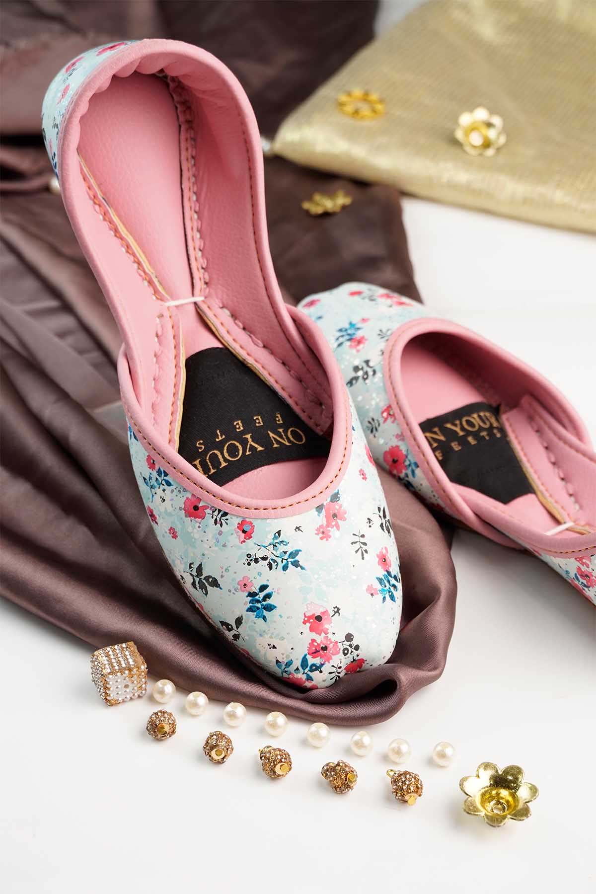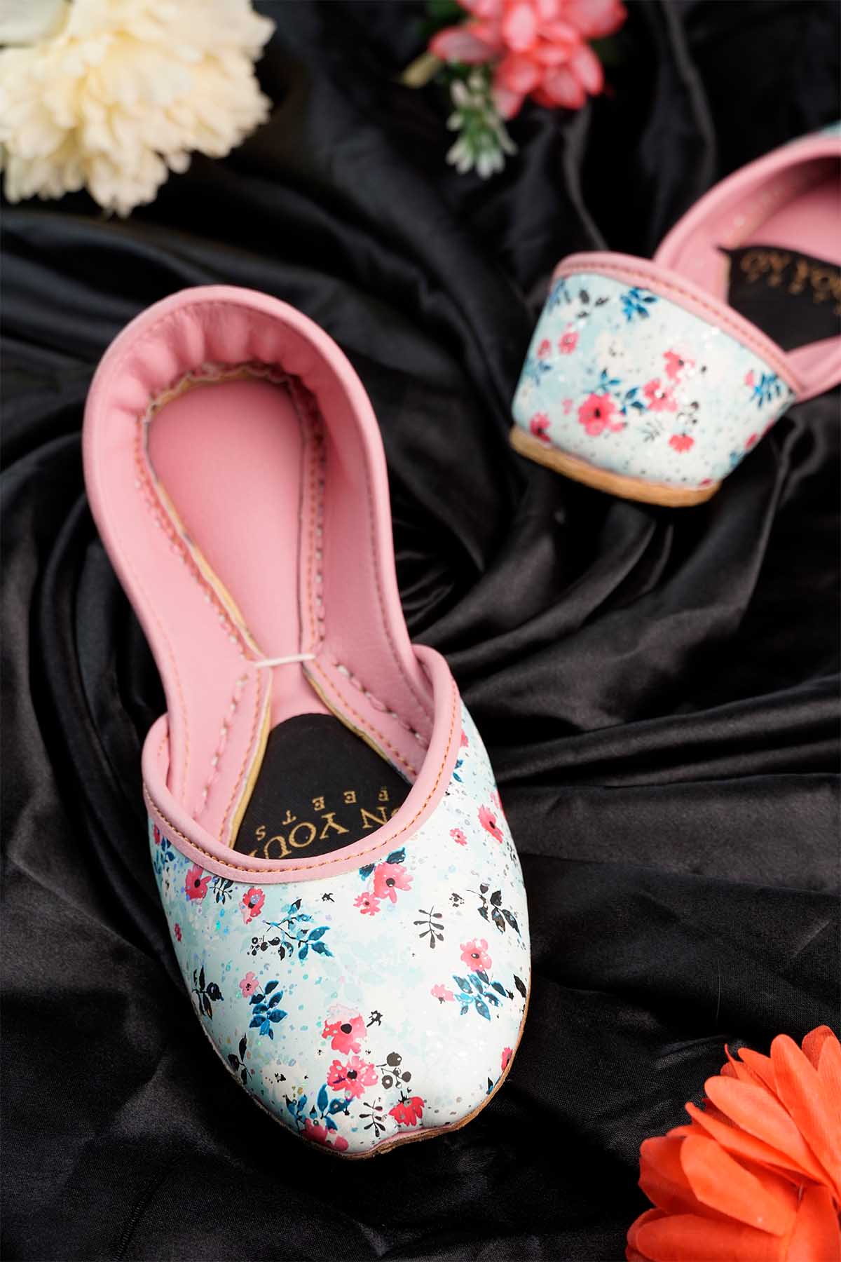 These Stylish Women’S Khussa Feature A Soft Pastel Pink Inner Lining With A Sky-Blue Base Decorated In Delicate Floral Prints. Designed For Both Comfort And Elegance, They Come With A Cushioned Insole And Fine Stitching For Durability. Perfect To Pair With Ethnic Outfits Or Casual Wear, These Juttis Add A Touch Of Grace And Charm To Your Everyday Look.