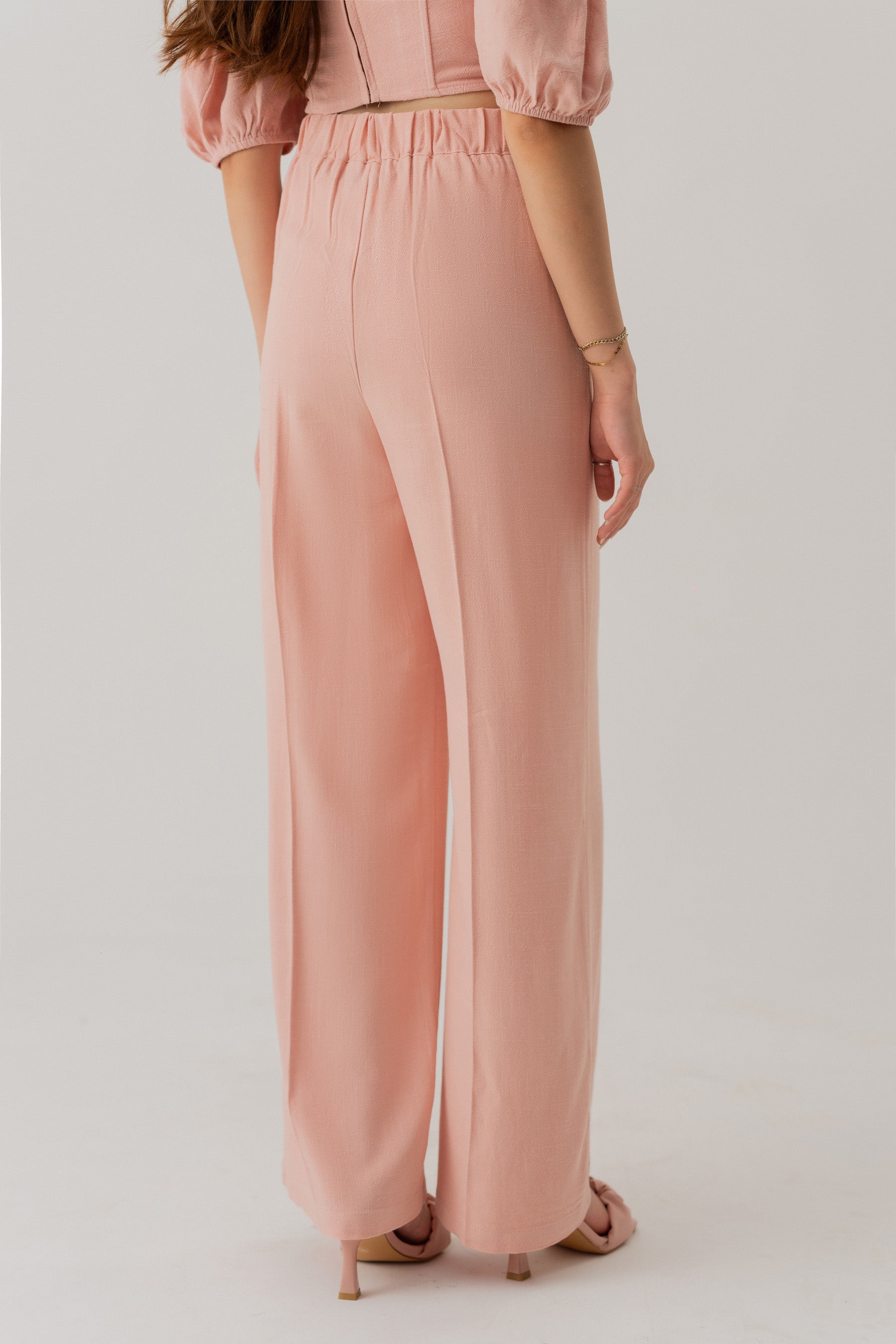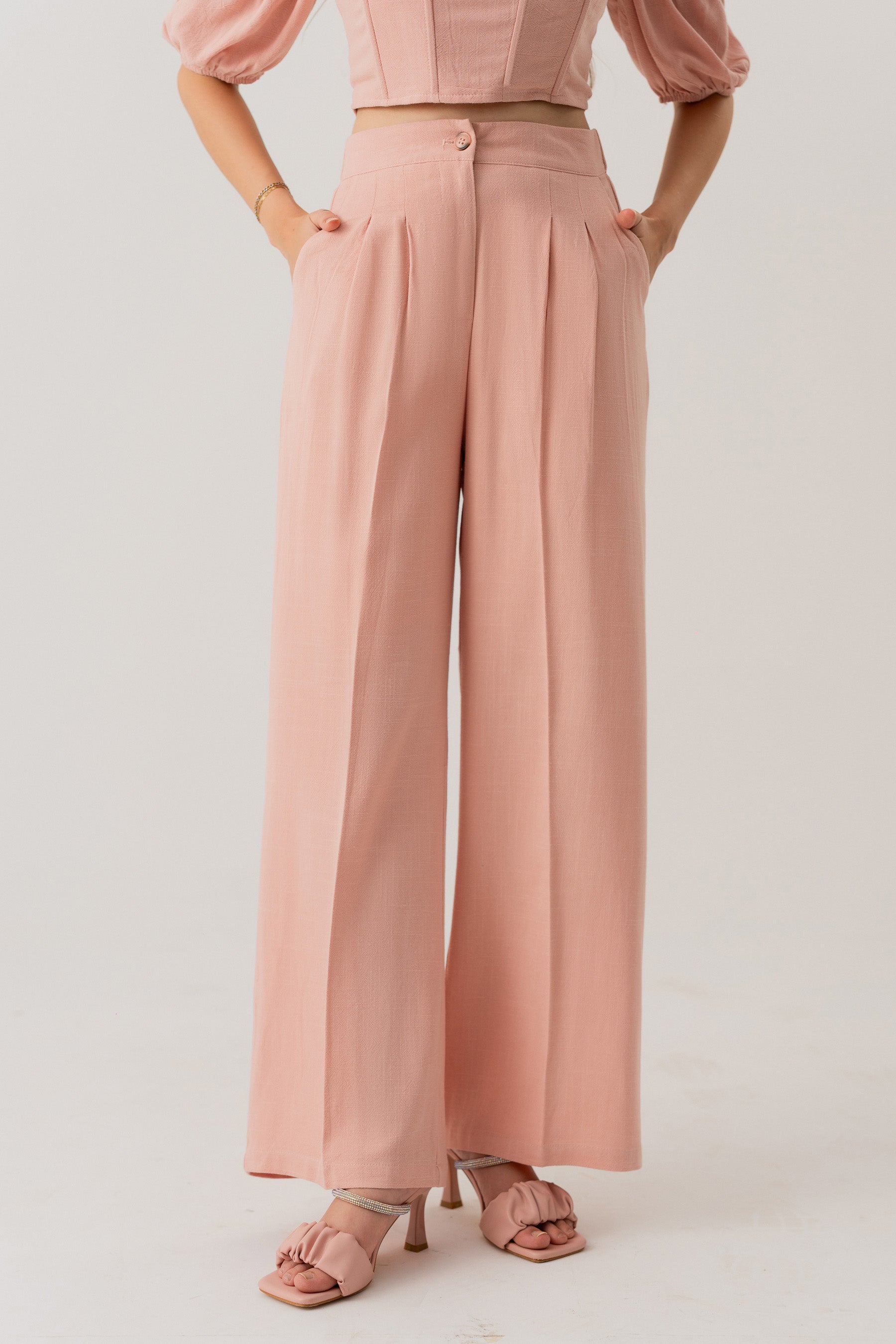 These peach wide-leg linen trousers are designed with front darts, sharp slash pockets, and a zip fly with button closure. A stylish and comfortable choice for both formal and casual look.