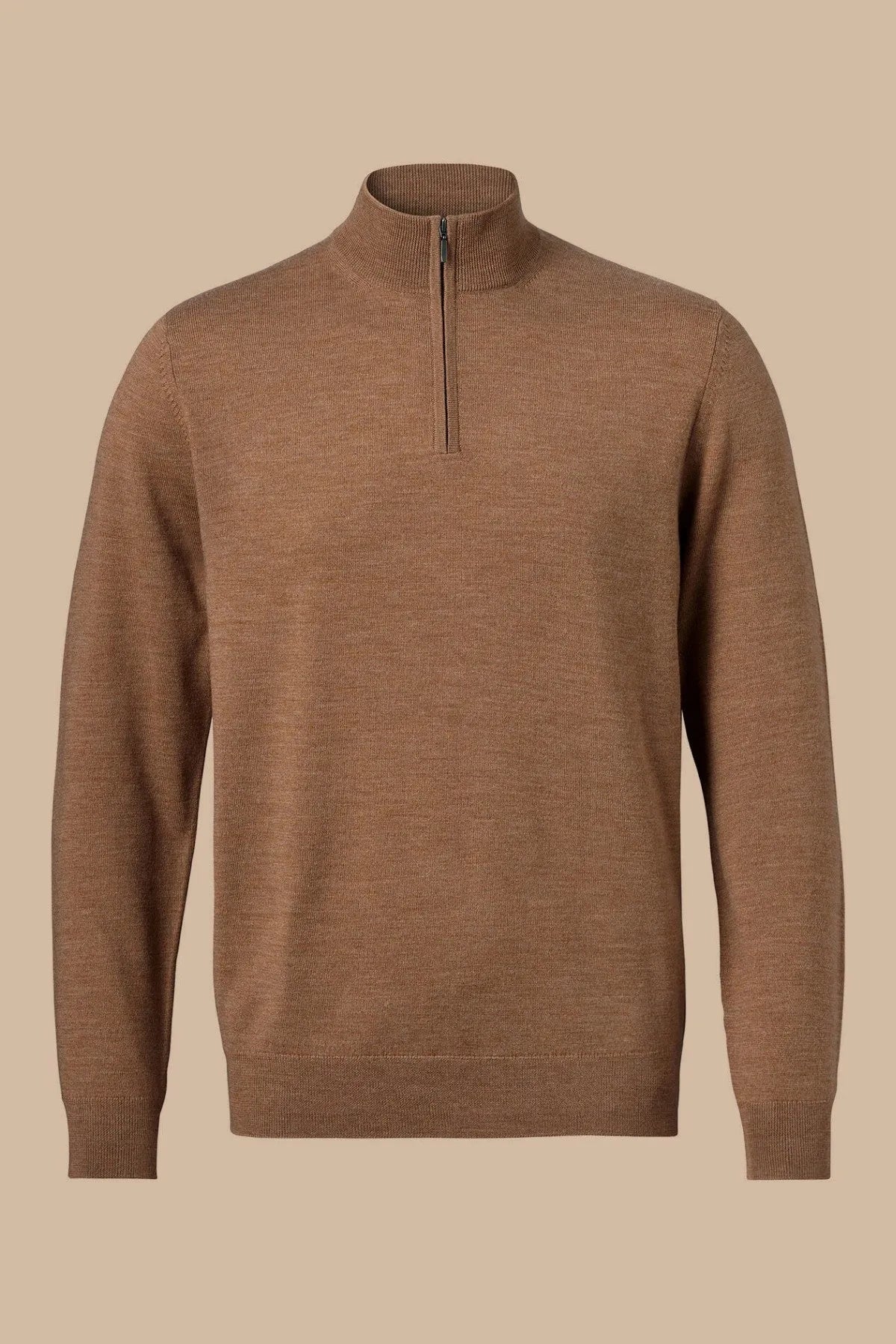 Wool mark-certified, Garment washed, Contrast back neck trim, Zip neck