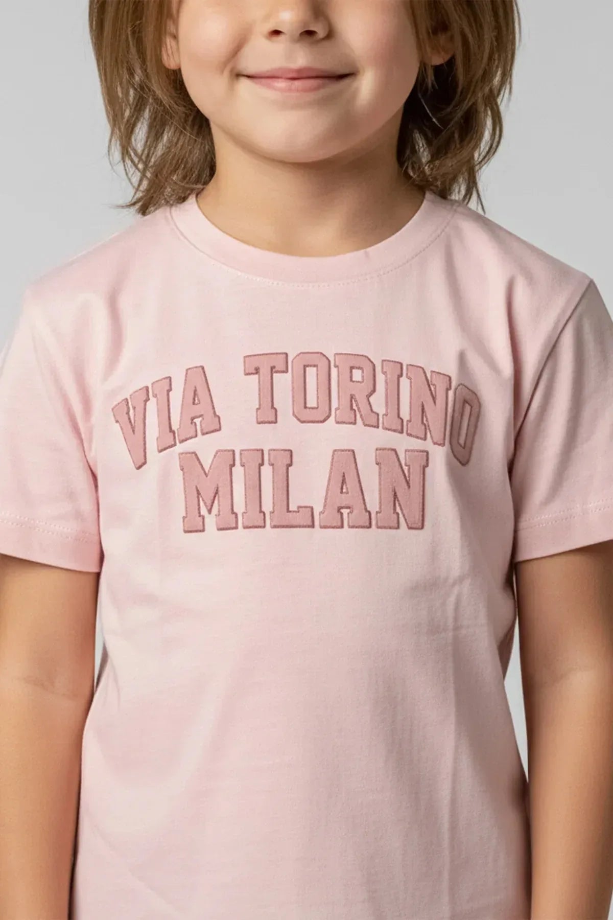 Bring European street-style flair to your childs wardrobe with this pastel pink “Via Torino Milan graphic t-shirt. Made from soft cotton with a classic crew neck fit, it's the perfect blend of comfort and fashion-forward style for everyday wear.