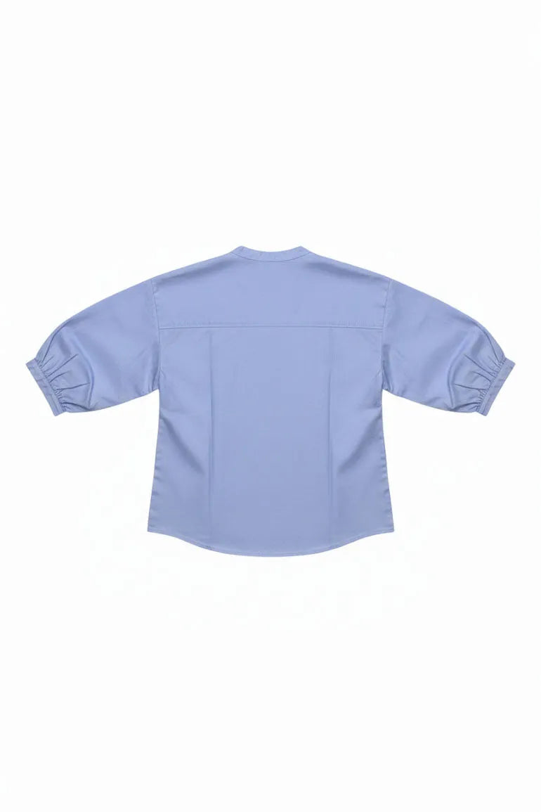 A stylish light blue top featuring soft puff sleeves and a clean button-down front for a modern, elegant look. Crafted from breathable fabric, perfect for everyday wear or casual outings with a polished touch.