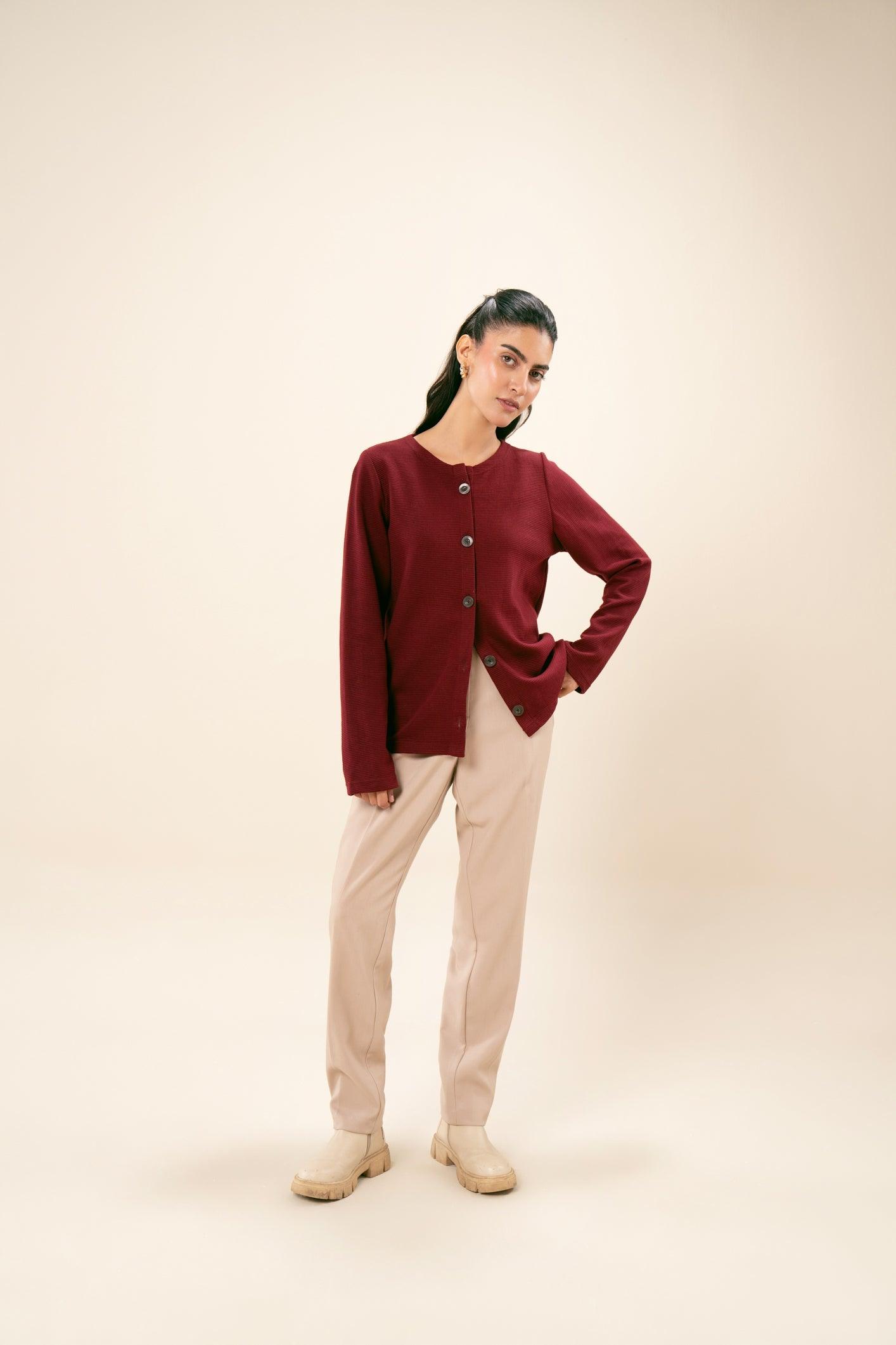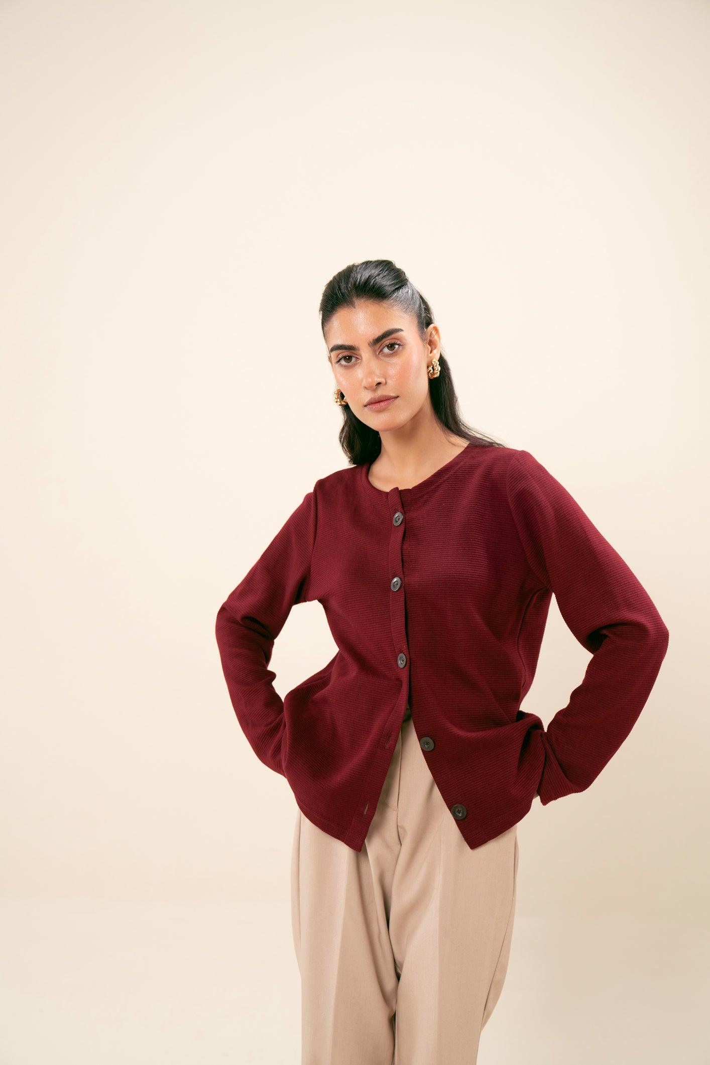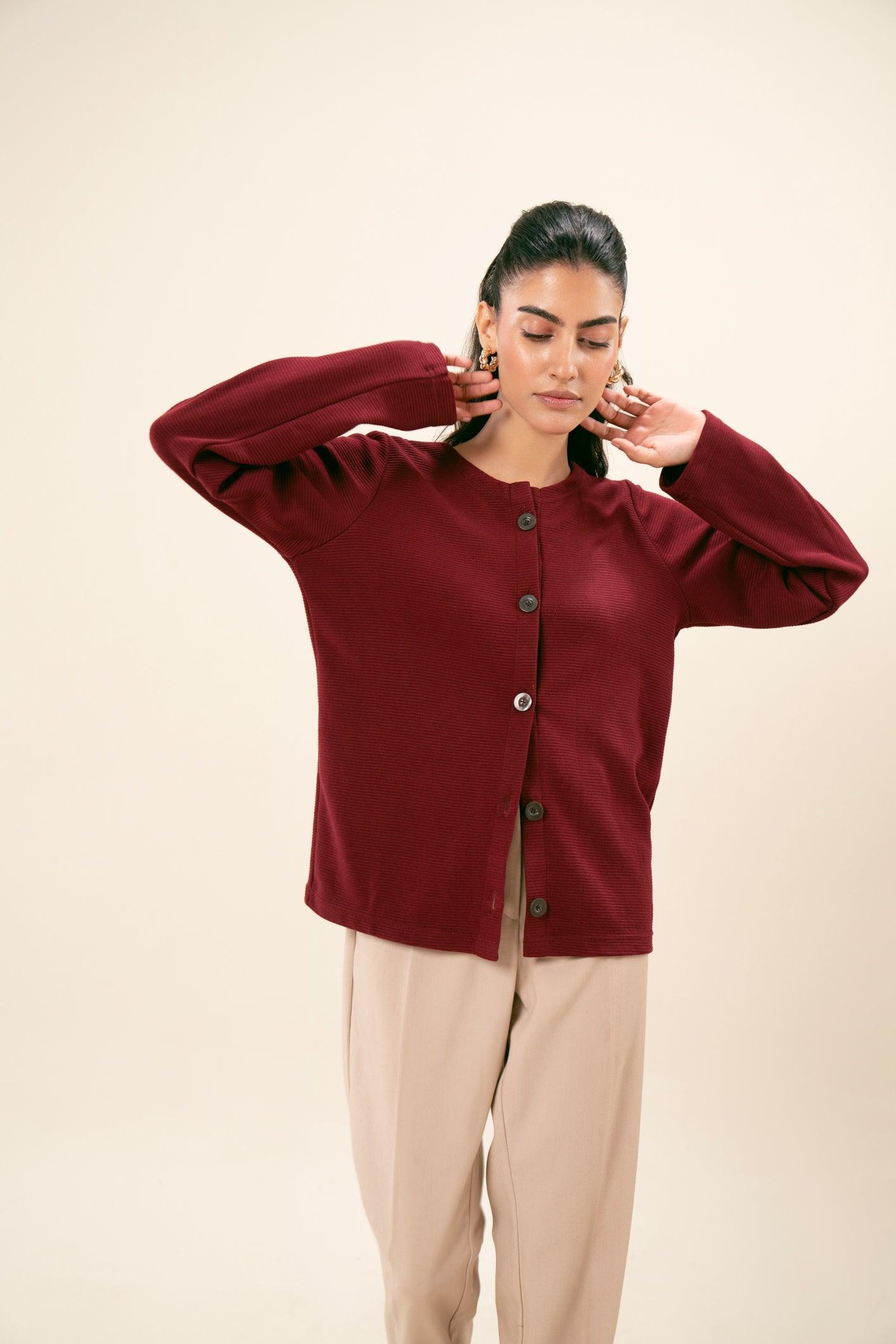 Round neck knit thermal button-down sweater. Soft, warm fabric with button detailing and a relaxed fit. Ideal for comfort and style in cooler weather.