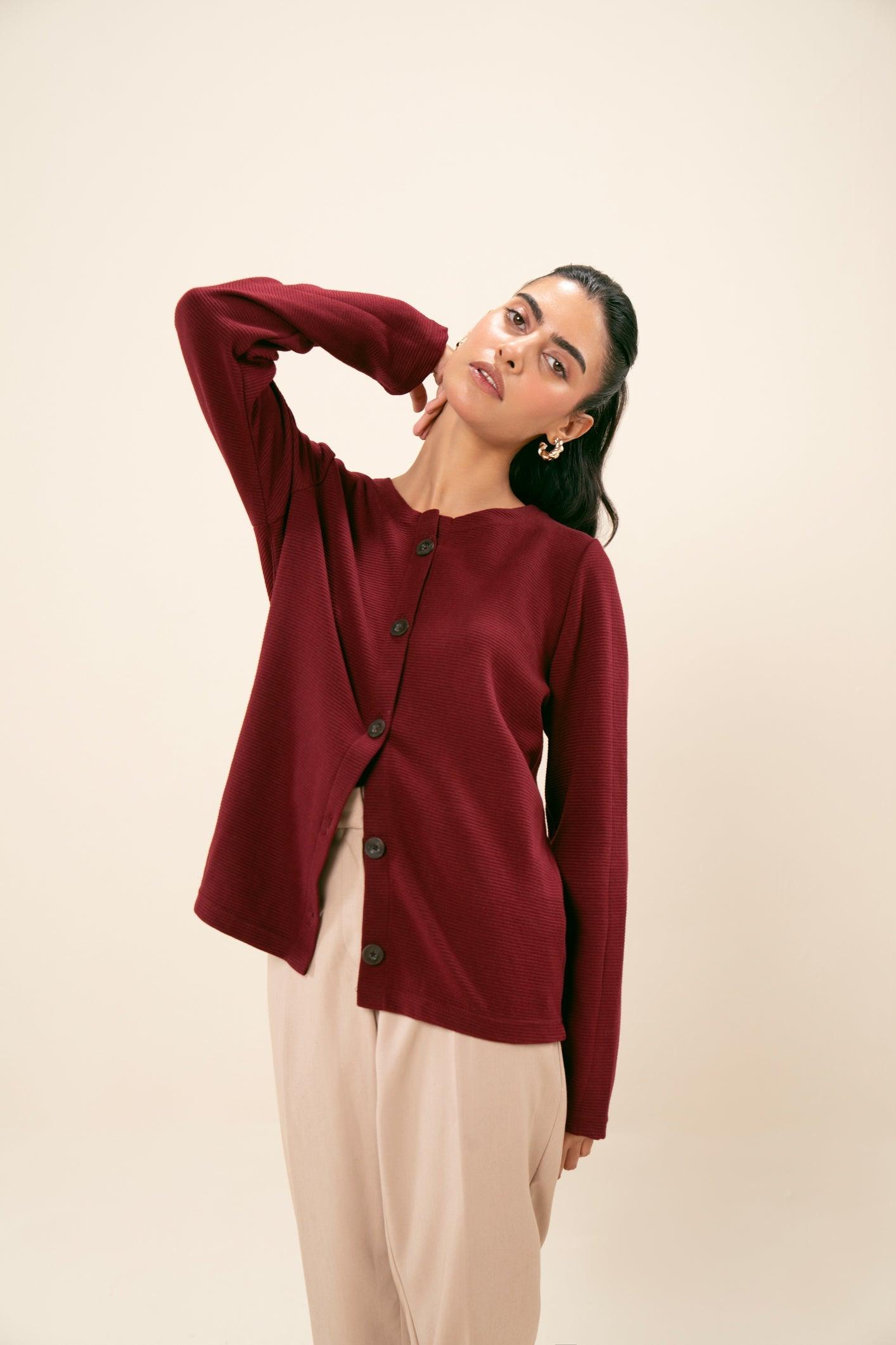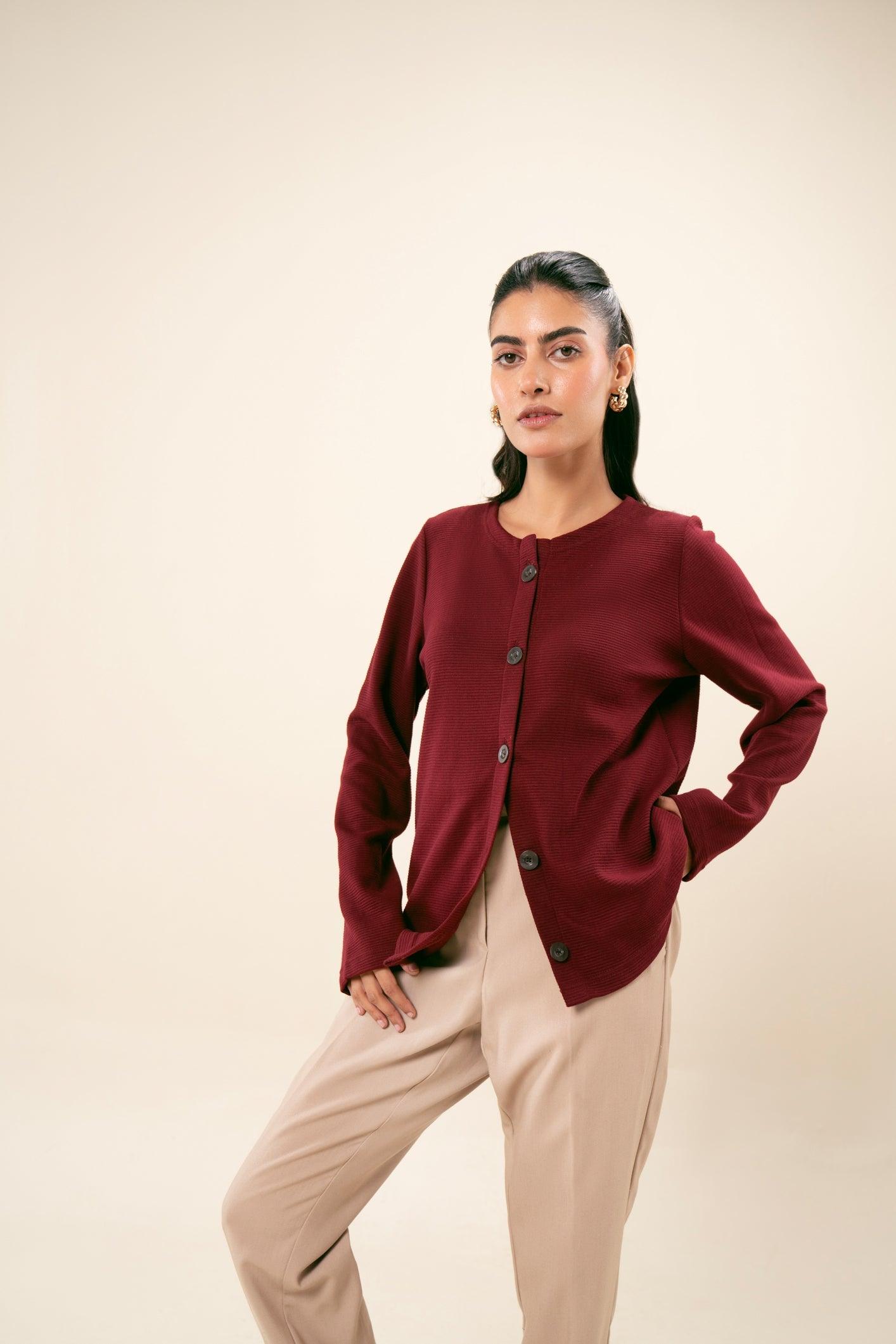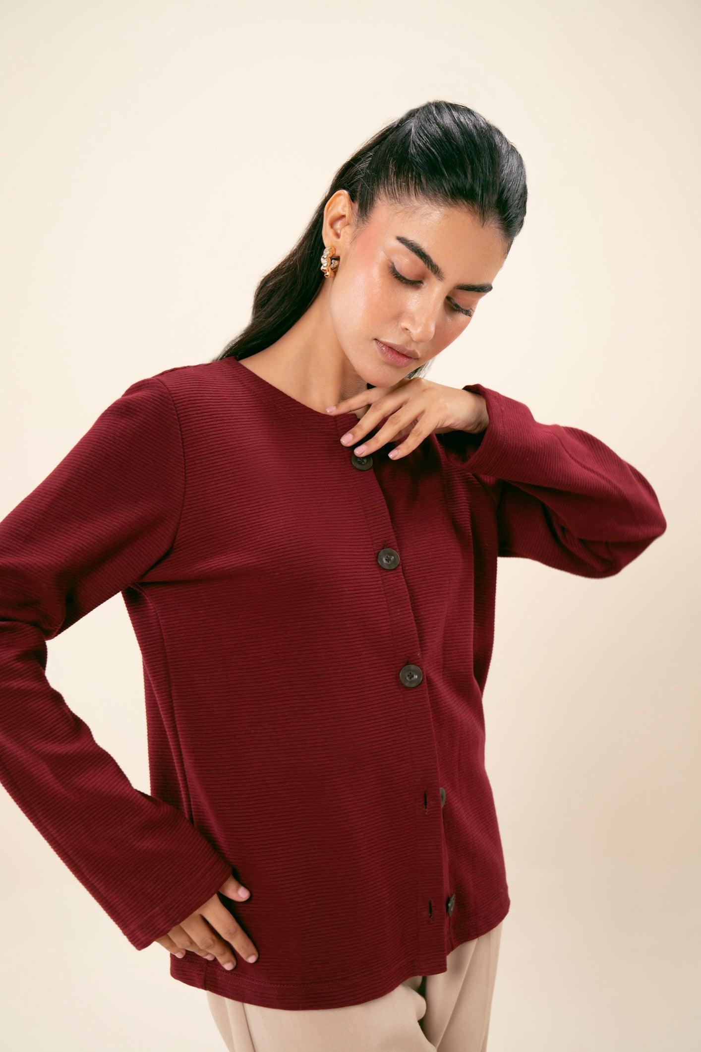 Round neck knit thermal button-down sweater. Soft, warm fabric with button detailing and a relaxed fit. Ideal for comfort and style in cooler weather.