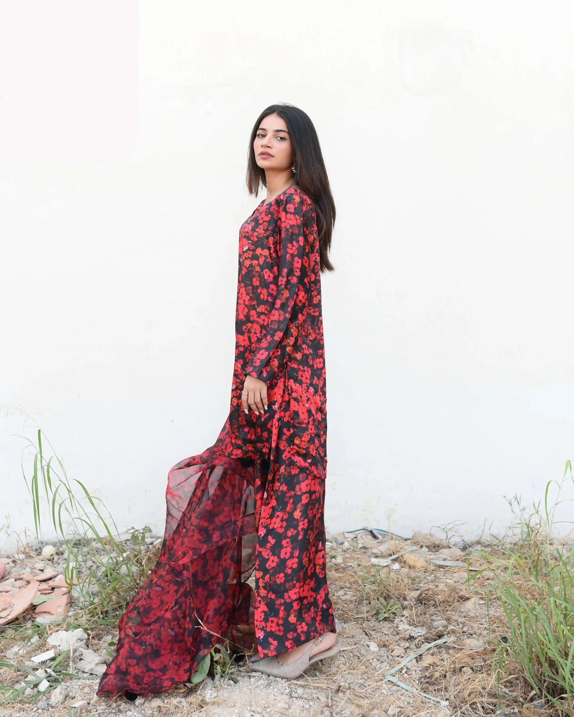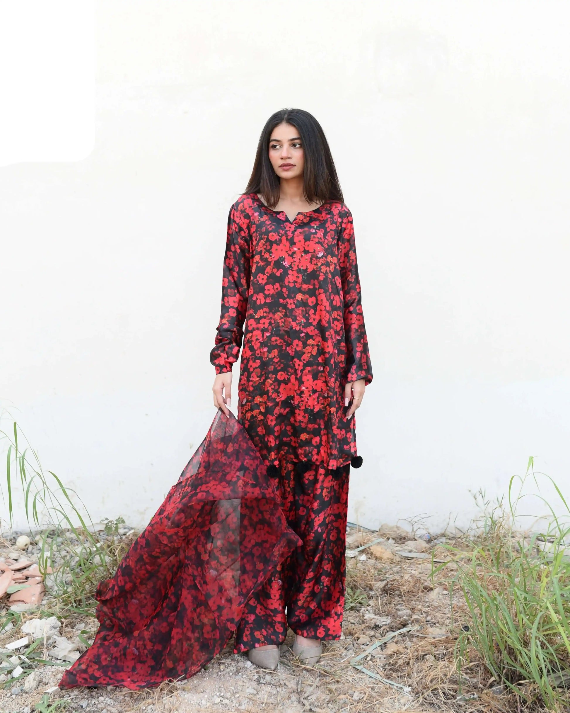 This beautifully crafted outfit features a printed dress with a classic neckline and straight sleeves, along with a flowing organza dupatta adorned with complementary print. Delicate tassels embellish the hem for a chic finish, and it is paired with a straight shalwar.