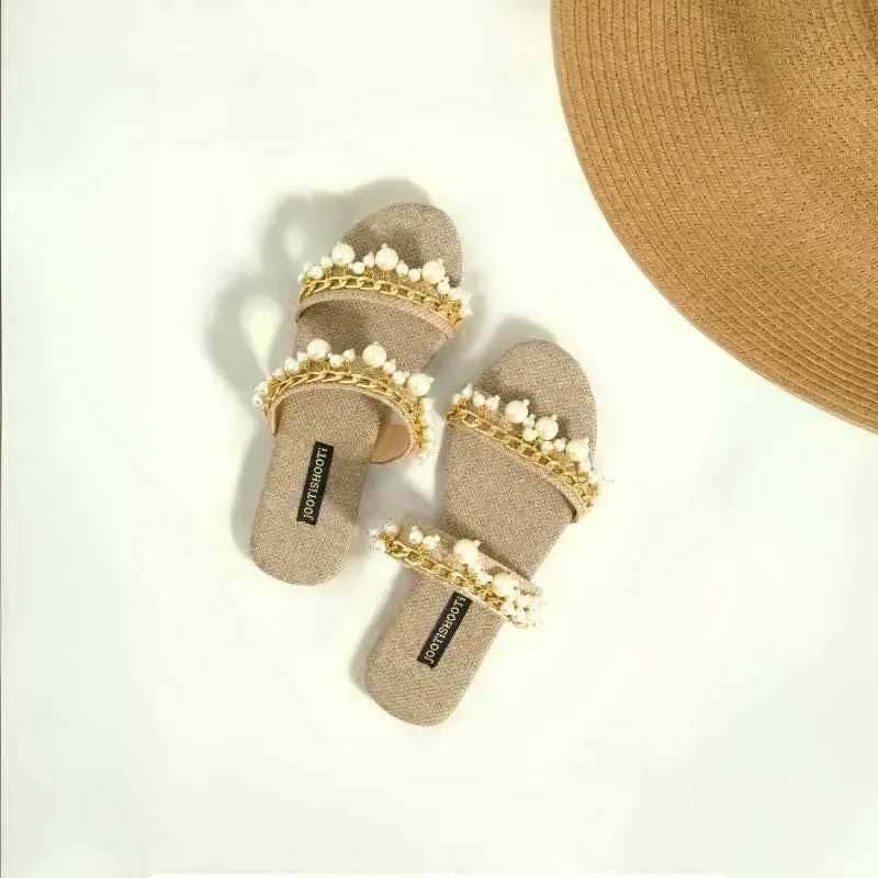 Textured, beach-chic base with two luxe straps dripping in pearls and a hint of chain. Dresses up linen fits and festive looks without trying too hard—comfy, light, and unmistakably statement.