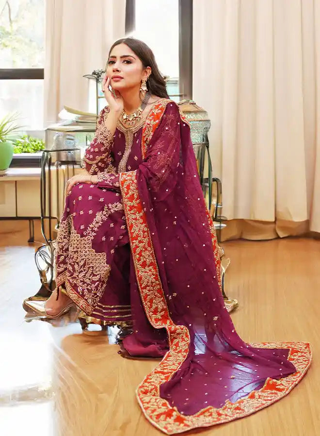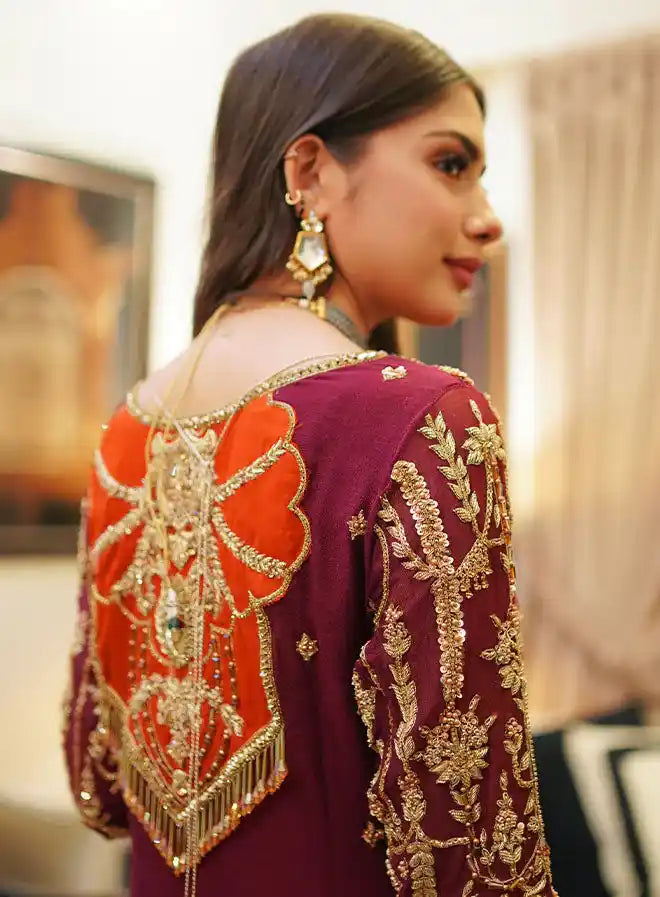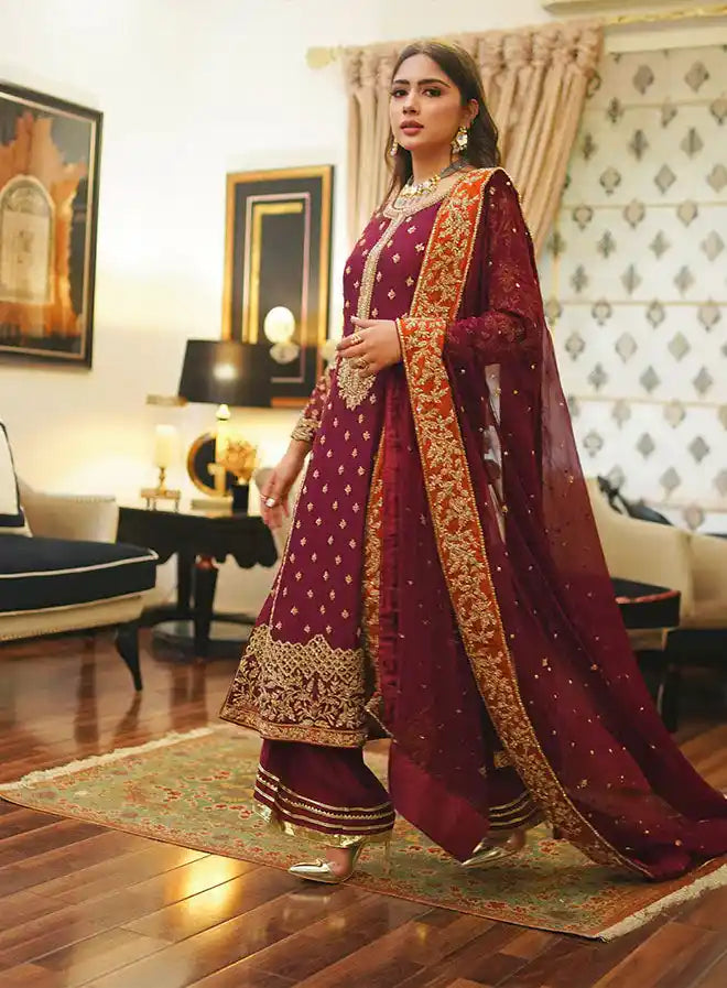 Introducing the Ruby long shirt, a masterpiece that exemplifies elegance and sophistication. This three-piece ensemble includes a stunning shirt crafted from luxurious khaddi net, paired with raw silk trousers and a delicate chiffon dupatta. The rich plumish red hue adds depth and allure, while the intricate Zardozi work in gold embellishes the fabric, creating a glittering effect as you move. The graceful flares of the shirt tell tales of royal charm, making Ruby a must-have for those looking to make a striking impression. Wear it to elevate any occasion and prepare to be the center of attention!