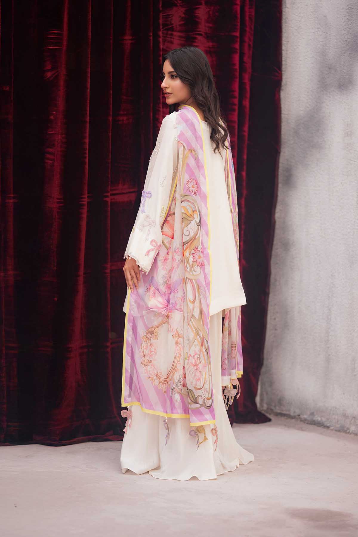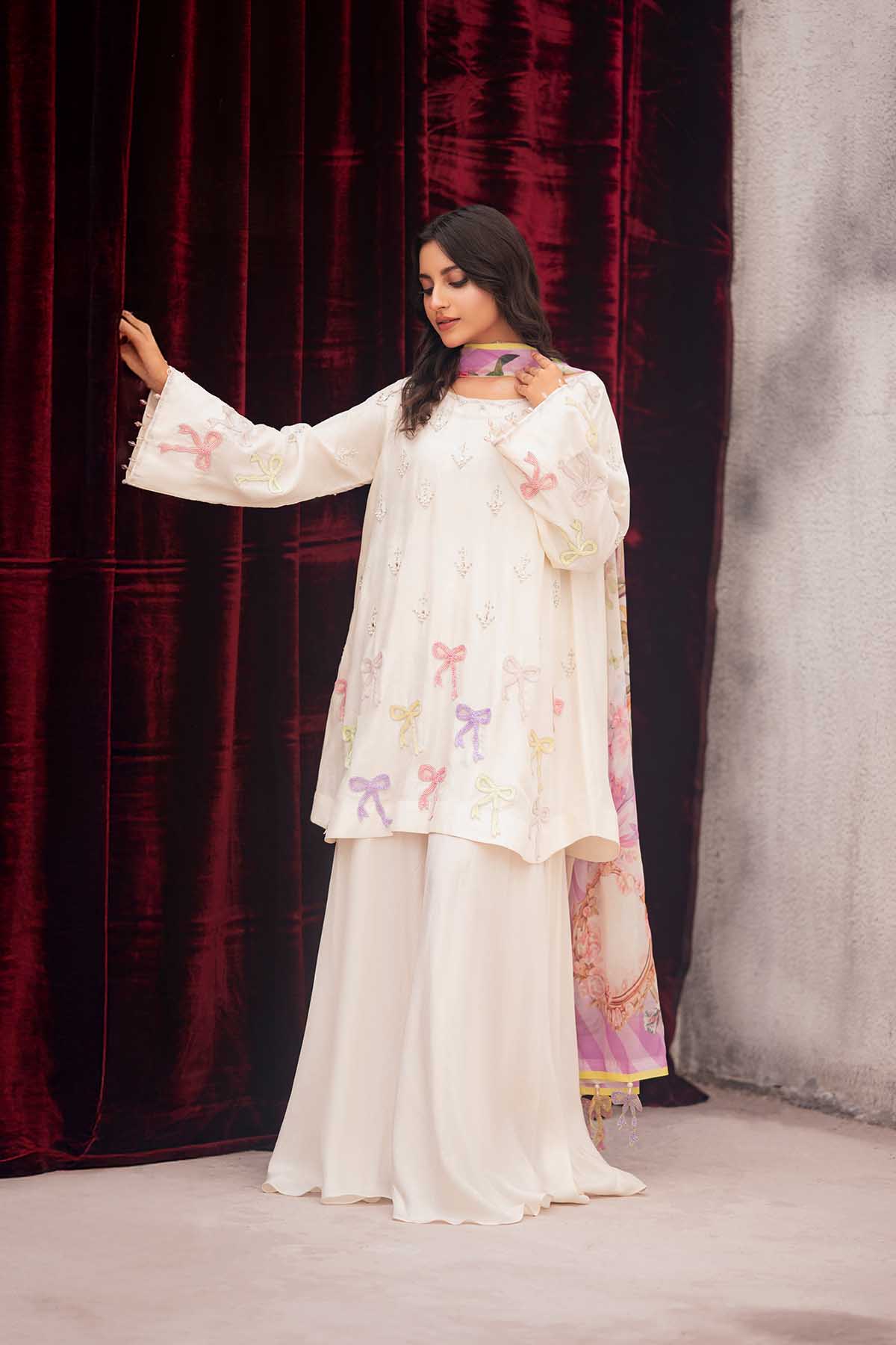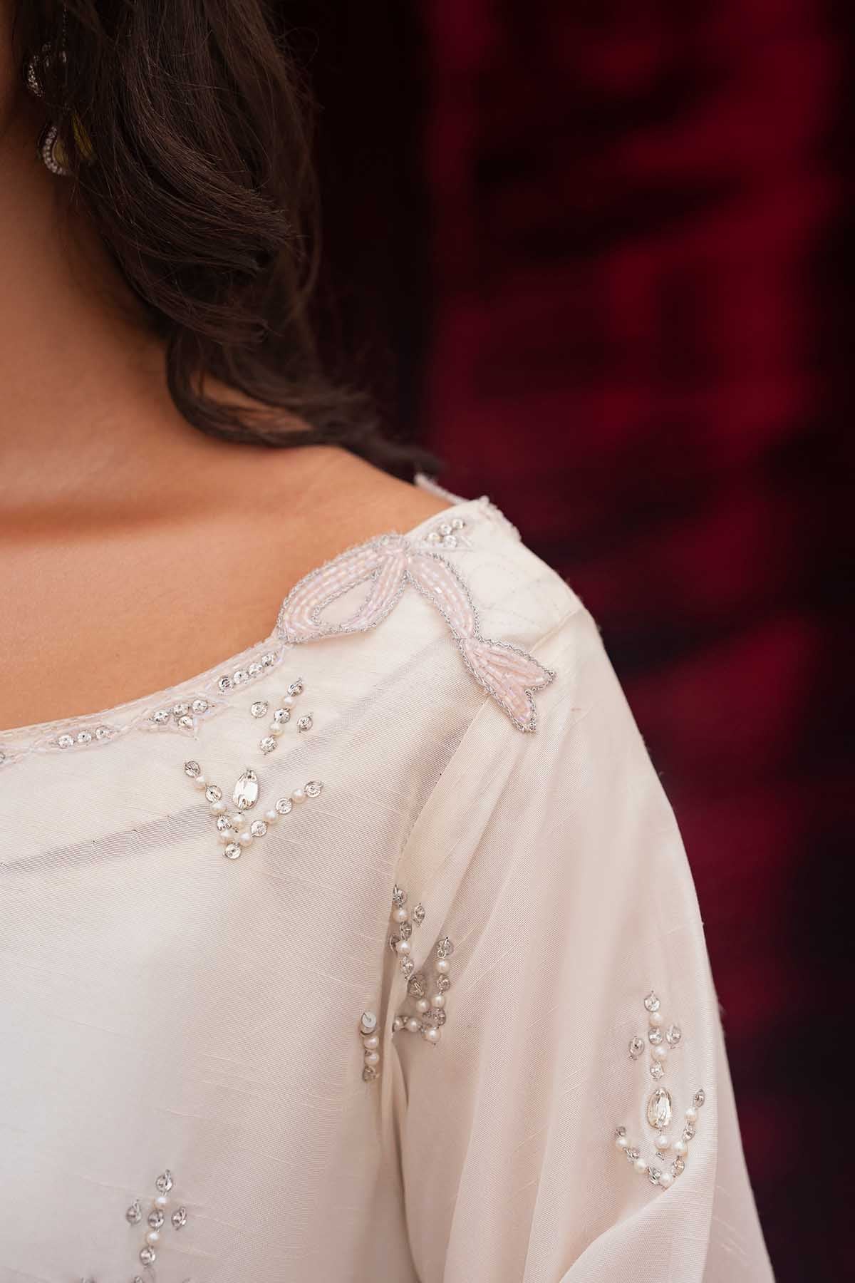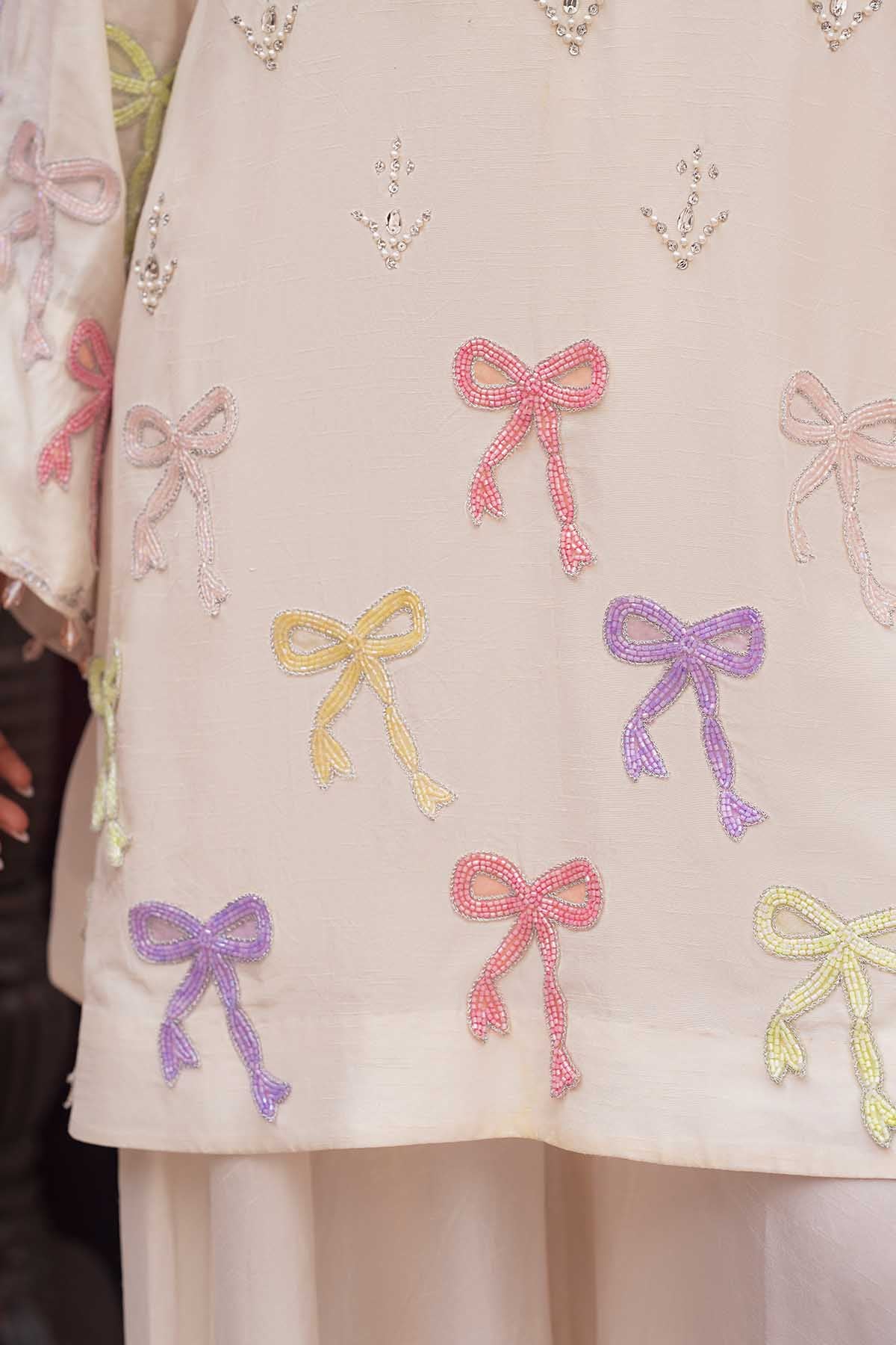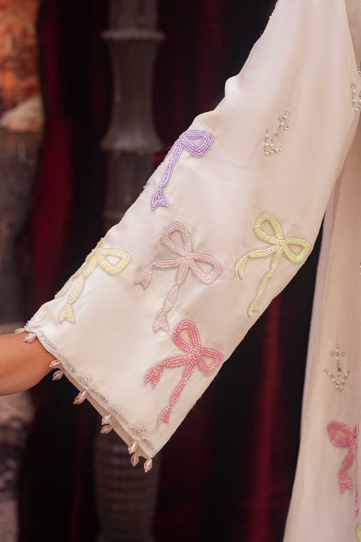 Lia - Festive Formal - Vol 2: An Ivory Ensemble Shimmering With Artisanal Finesse. A Korean Rawsilk Short, Cut In A Timeless Straight A-Line Silhouette, Is Lavishly Embroidered With Silver Zardoze, Pearl, Resham, Sequins And Appliqué Multi Coloured Bows In Cutdana Work. Sleeve Hem Finished With Hanging Beads. Paired With Tailored Korean Rawsilk Flaired Dhaka Pajama. The Contrasting Digitally Printed Silk Dupatta, Adorned With Hand Embroidered Bow Tassels On Edges, Drapes Like A Whisper Of Regality.