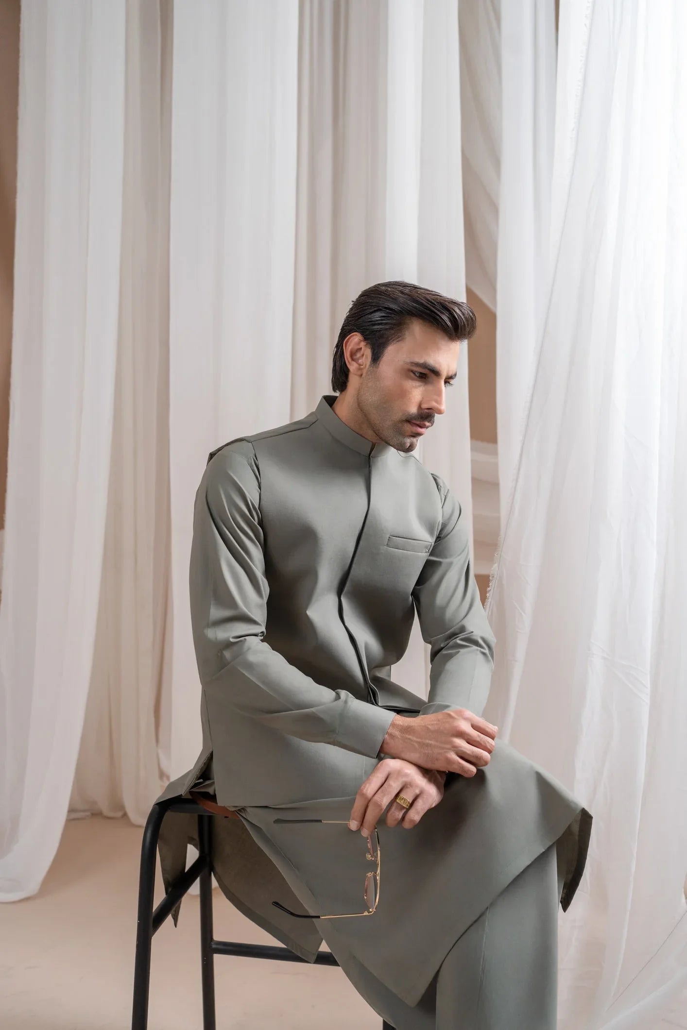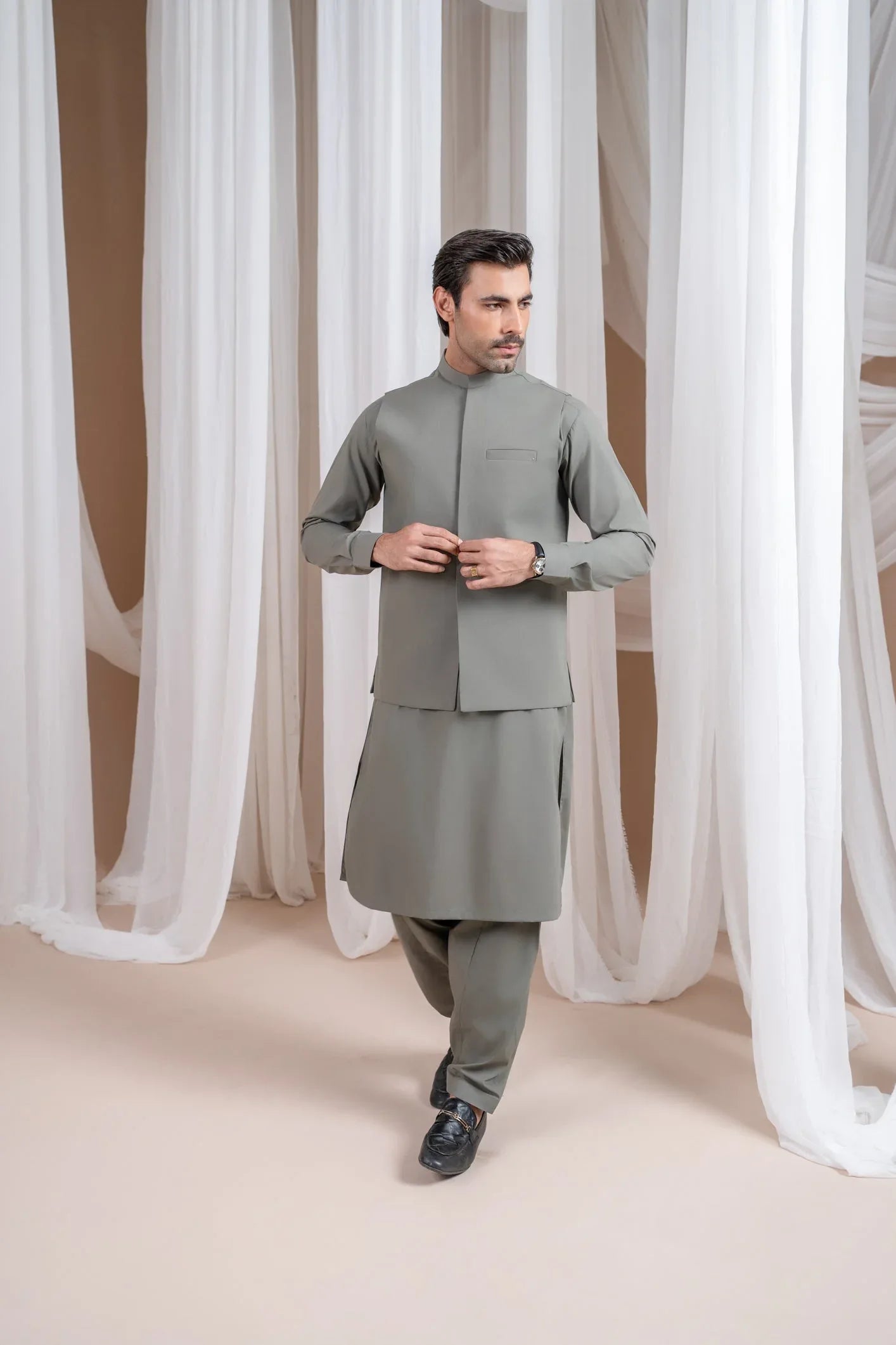 Sand Grey Luxury Formal Kameez Shalwar with Blended Waistcoat - Straight Cut - Men
