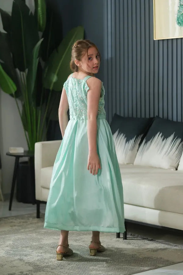 Sequence Net with Silk & Chiffon A mint green version with the same glittery bodice and satin flow — fresh, graceful, and celebration-ready.