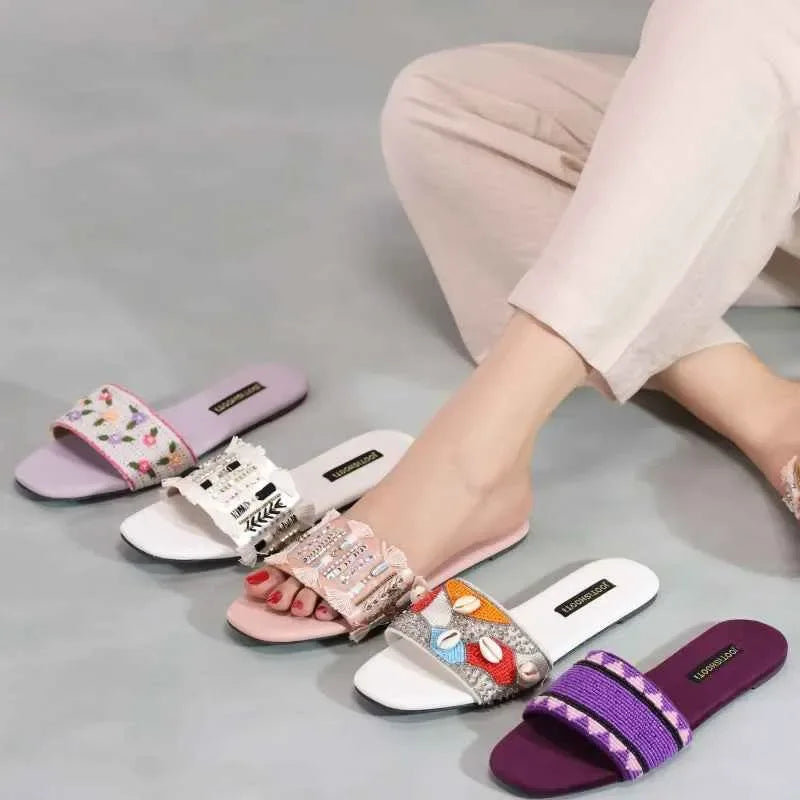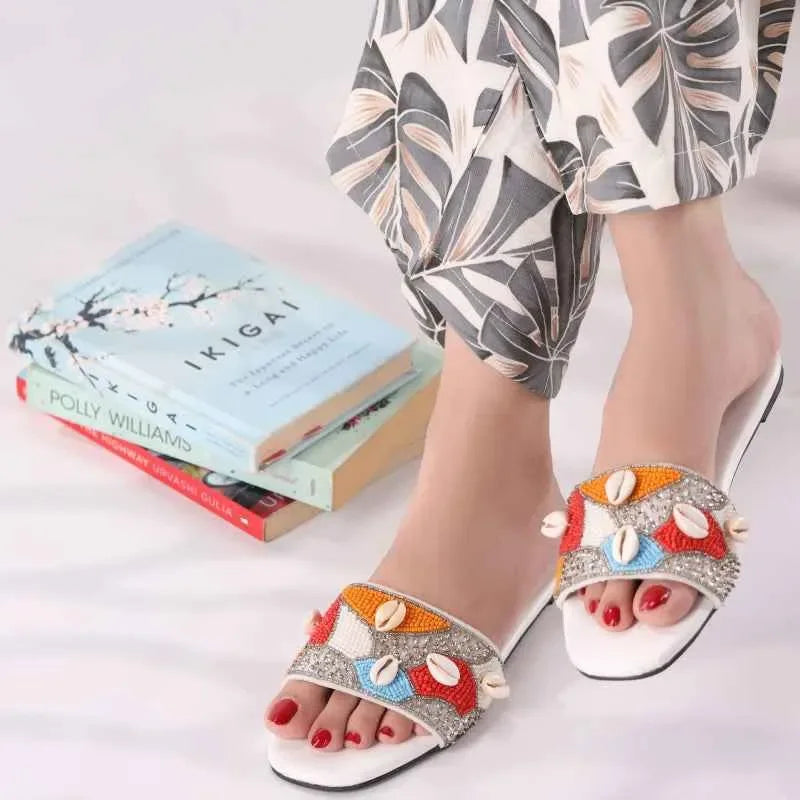 Inspired by the serene treasures of the sea, these slides feature artisanal seashell details intricately set on woven textures. They effortlessly evoke memories of beachside strolls, seaside bonfires, and laid-back island vibes. Ideal with light beach dresses or casual shorts, let them serenade your feet with every step.