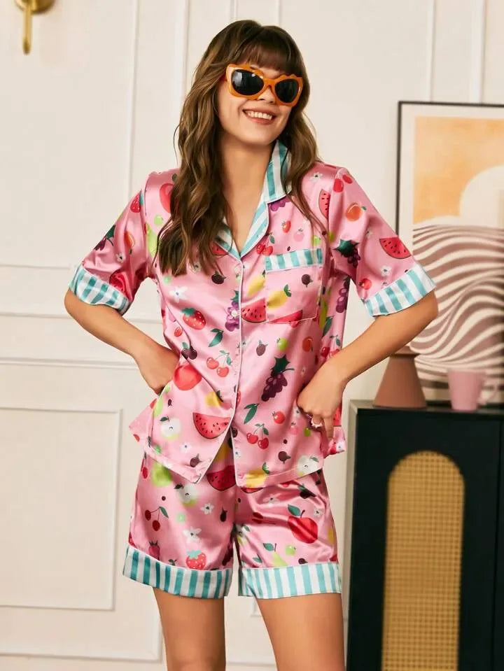She's Inn Creations Fruite Print Contrast Piping Pocket Front Satin Short Set women Night wear For Women Sleepwear For Girls
