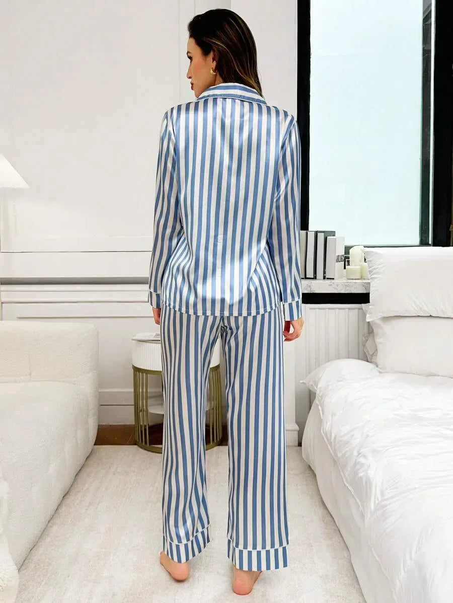 She's Inn Stylish stripe print Women Nightwear Smoothy Silky Satin Pajama set Night Drees For Girls