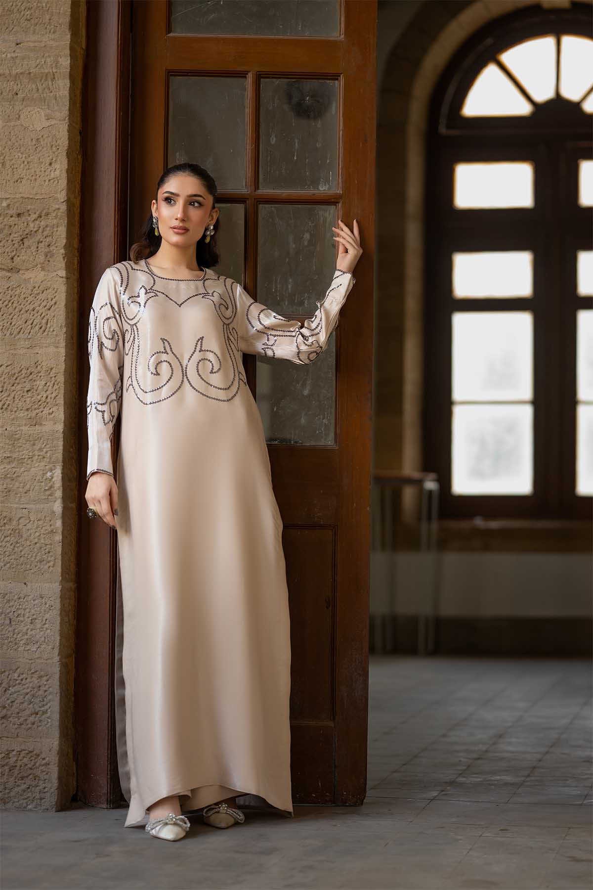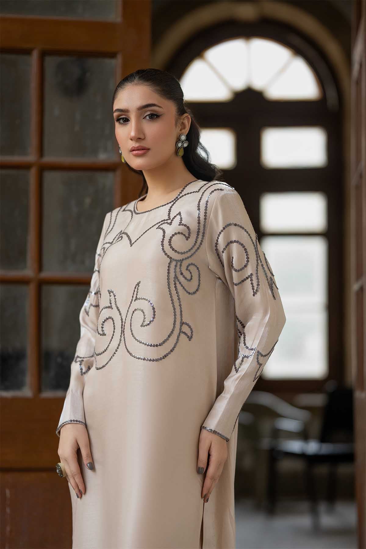 Meethi Yaadein-Eid Festive:This Elegant Ensemble Features A Full-Length, Straight-Silhouette Sheesha Silk Dress Crafted In A Soft Ivory-Beige Tone, Exuding Understated Luxury. The Neckline, Bodice, And Full Sleeves Are Adorned With Intricate Hand-Embellished Embroidery In A Muted Charcoal Hue, Forming Graceful, Swirling Motifs That Add Depth Without Overpowering The Minimal Base. The Embroidery Flows Seamlessly Across The Front And Sleeves, Creating A Balanced And Sophisticated Visual Appeal.