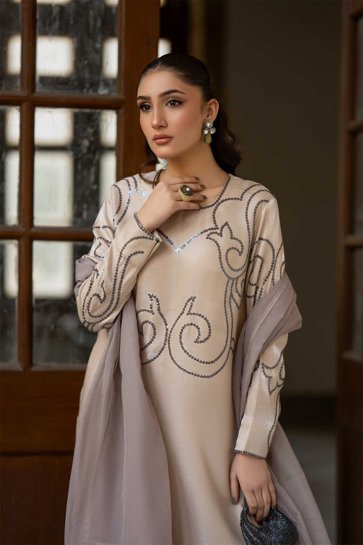 Paired With The Dress Is A Sheer, Airy Khaddi Line Silk Dupatta In A Complementary Taupe-Grey Shade, Delicately Finished With Subtle Geometric Accents Along The Edges. The Dupatta Drapes Effortlessly, Adding Movement And Softness To The Structured Look Of The Outfit. Styled With Long Culottes, Classic Embellished Heels And Minimal Statement Accessories, This Outfit Perfectly Blends Modern Elegance With Timeless Eastern Aesthetics—Ideal For Formal Gatherings, Festive Evenings, Or Intimate Celebrations.