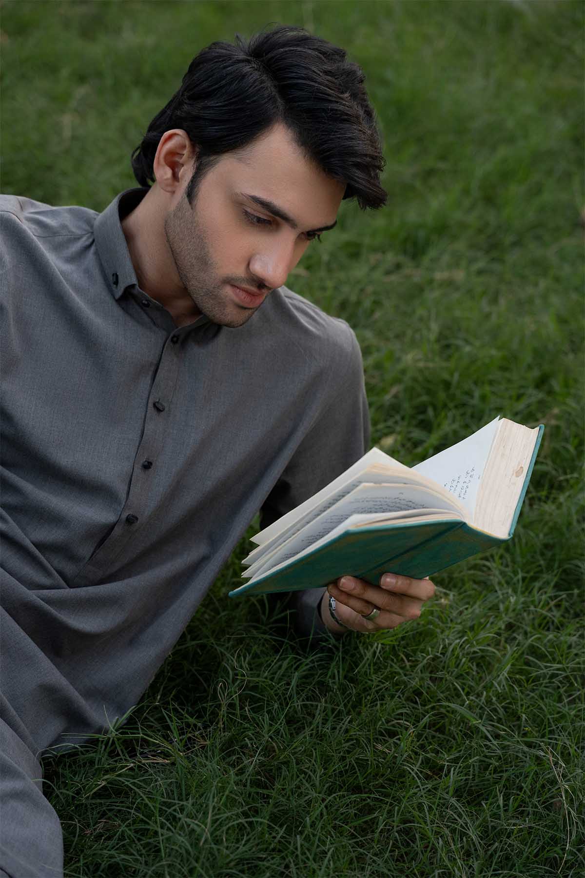 Meethi Yaadein-Ramadan / Eid:A Refined Grey Kurta Shalwar Set Crafted In A Smooth, Structured Fabric, Designed For Effortless Elegance. The Kurta Features A Classic Straight Silhouette With A Sharp Shirt Collar And A Minimal Buttoned Placket, Finished With Subtle Detailing For A Polished Look. Long Sleeves With Clean Cuffs Maintaining A Tailored Profile. Paired With Matching Shalwar, The Ensemble Delivers A Timeless Monochrome Statement—Perfect For Formal Gatherings, Festive Occasions, Or Understated Everyday Wear.