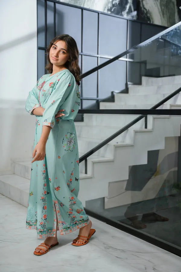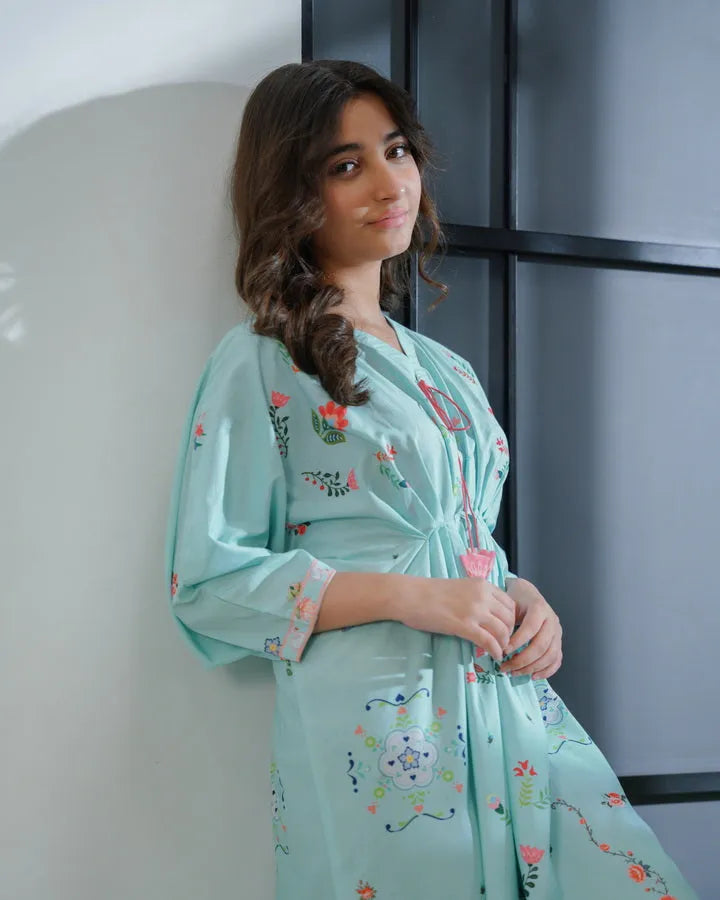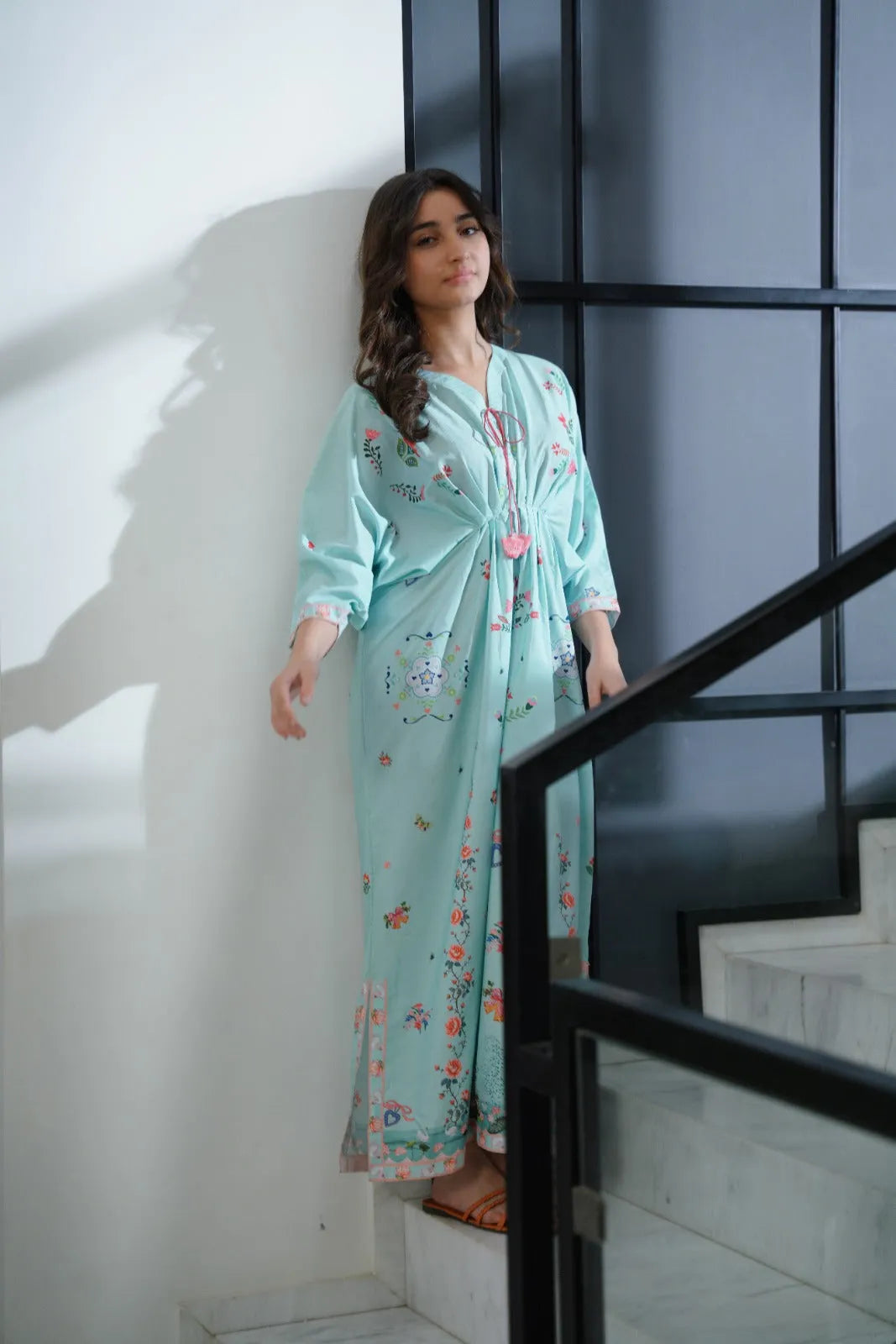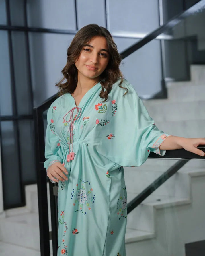 Soft and refreshing, this mint green kaftan features gentle floral prints and a cinched waist for effortless elegance.