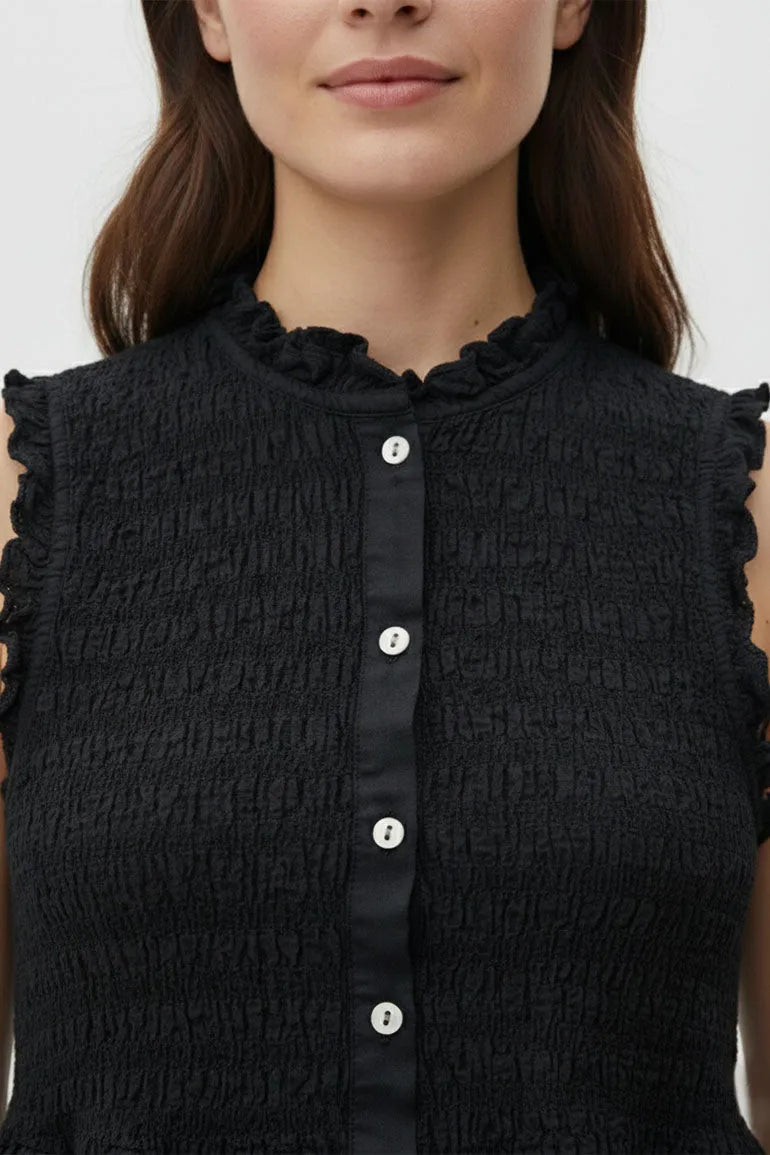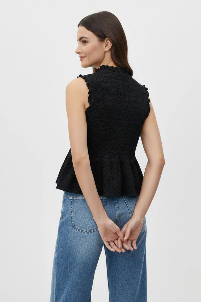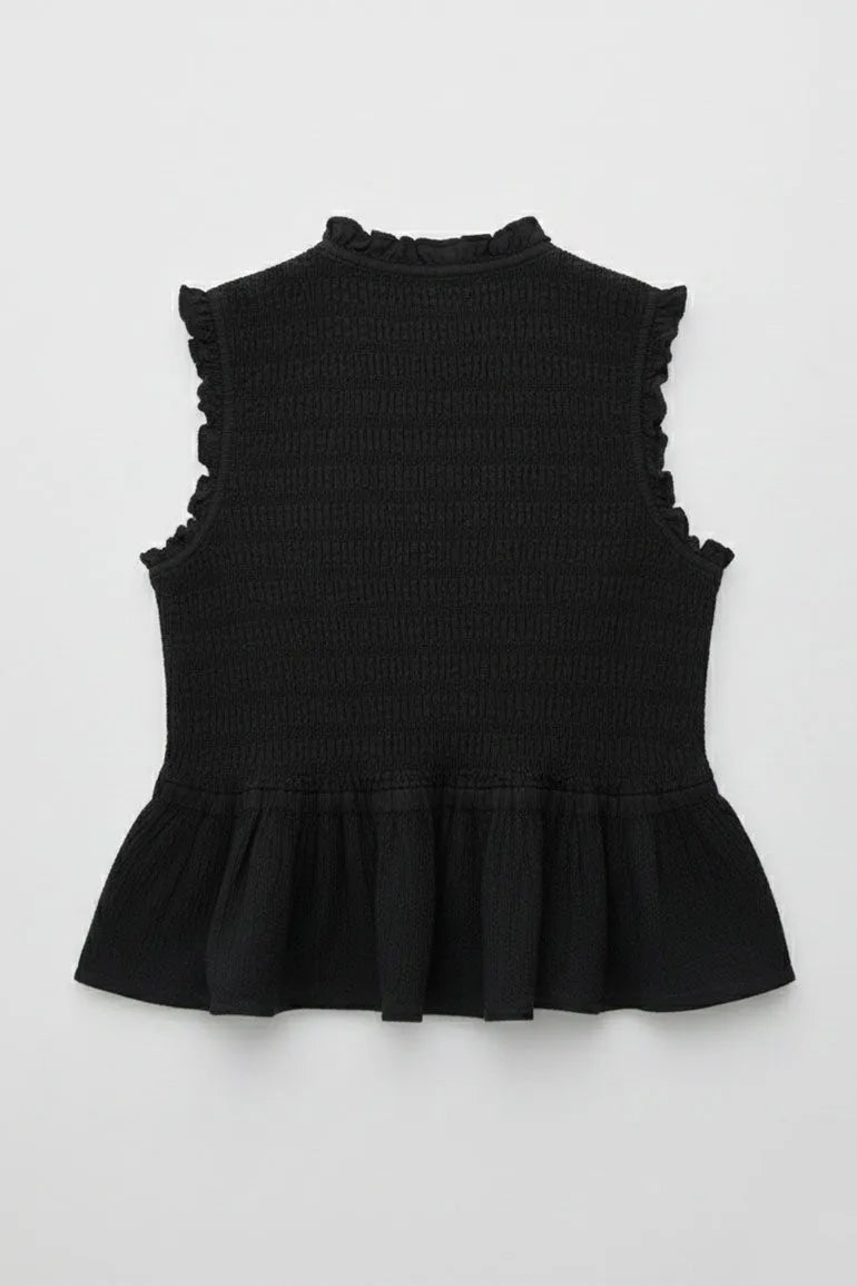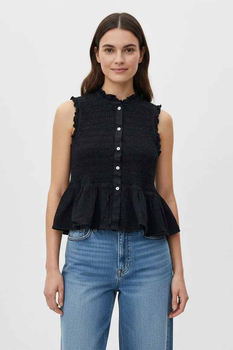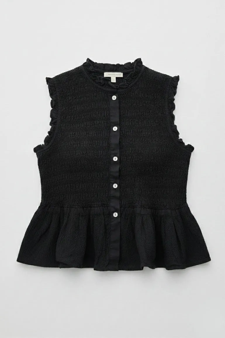 A sleeveless smocked top with front button detail and soft peplum flare. Designed with a flattering fit and feminine silhouette, perfect for casual outings or chic everyday styling.