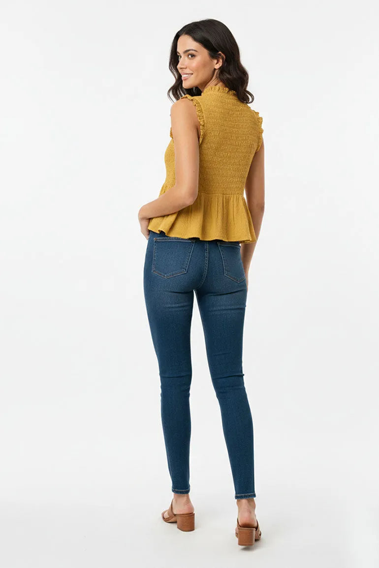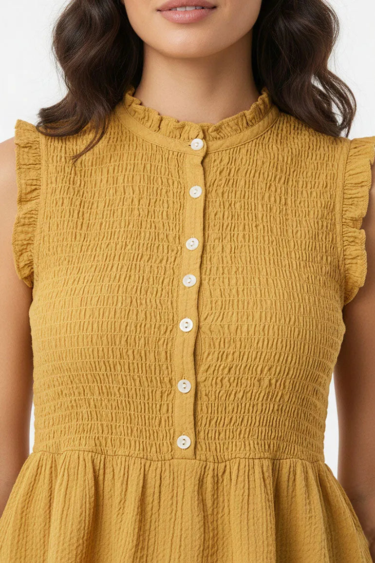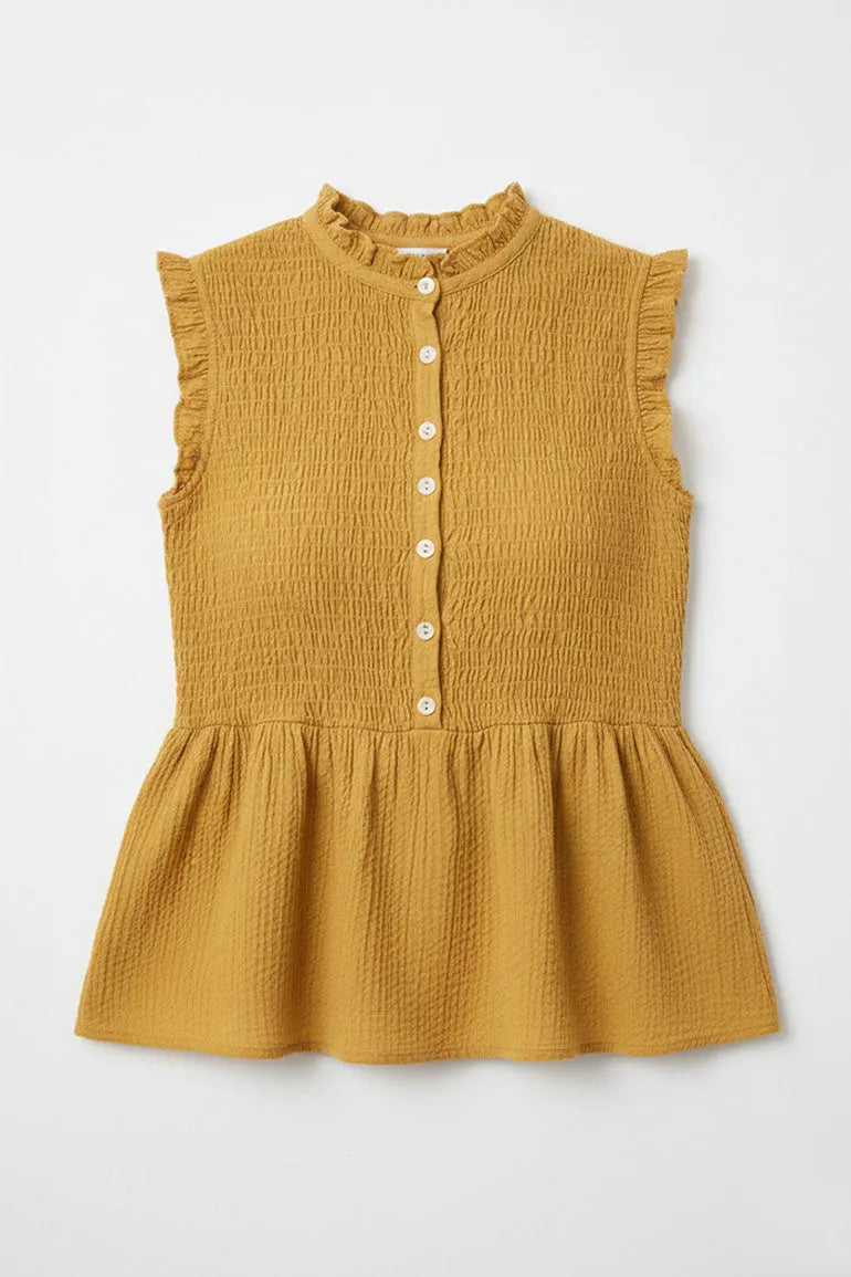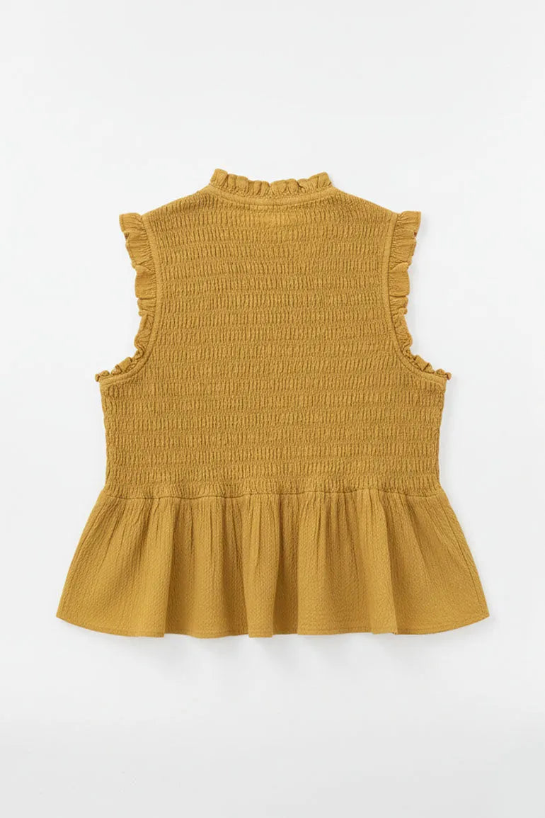 A sleeveless smocked top with ruffle detailing and front button accents. Designed with a flared peplum hem for a flattering, feminine everyday look.