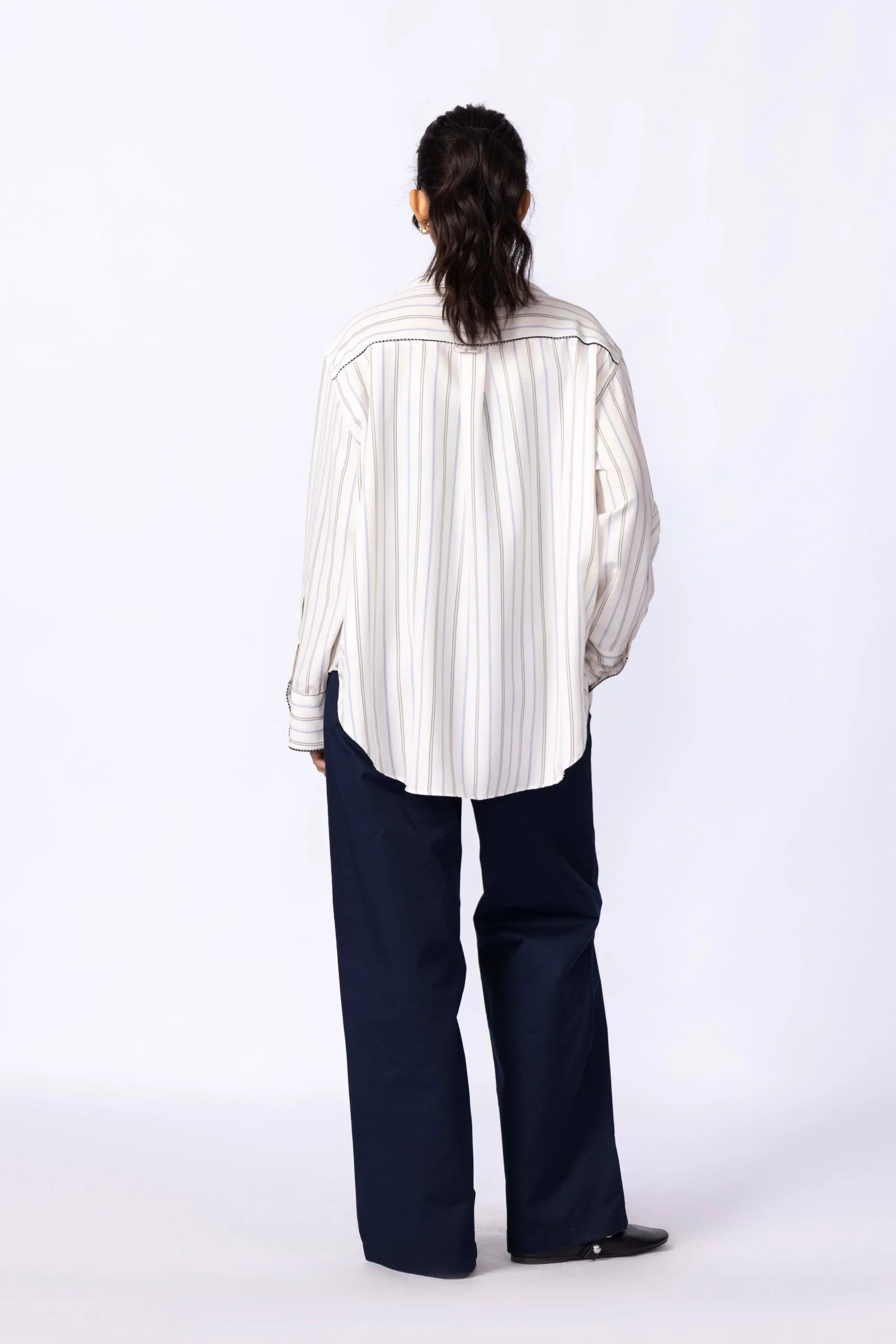 Crafted from crisp, lightweight cotton poplin that stays opaque yet breathable. The oversized cut drapes with ease, making it ideal for layering or wearing solo. Vertical stripes add polish, while the button-down front offers versatile styling.