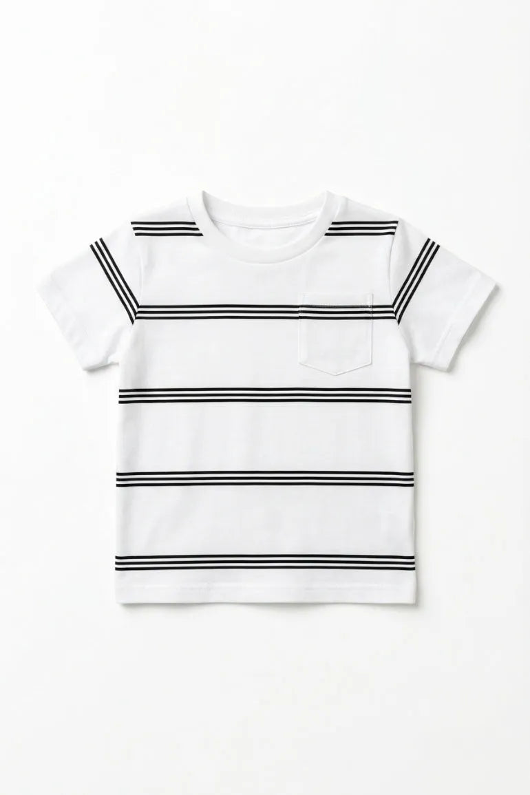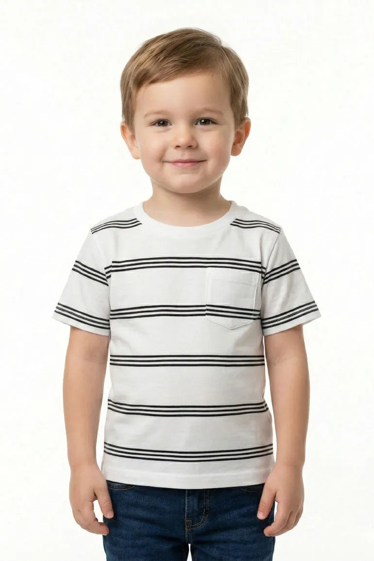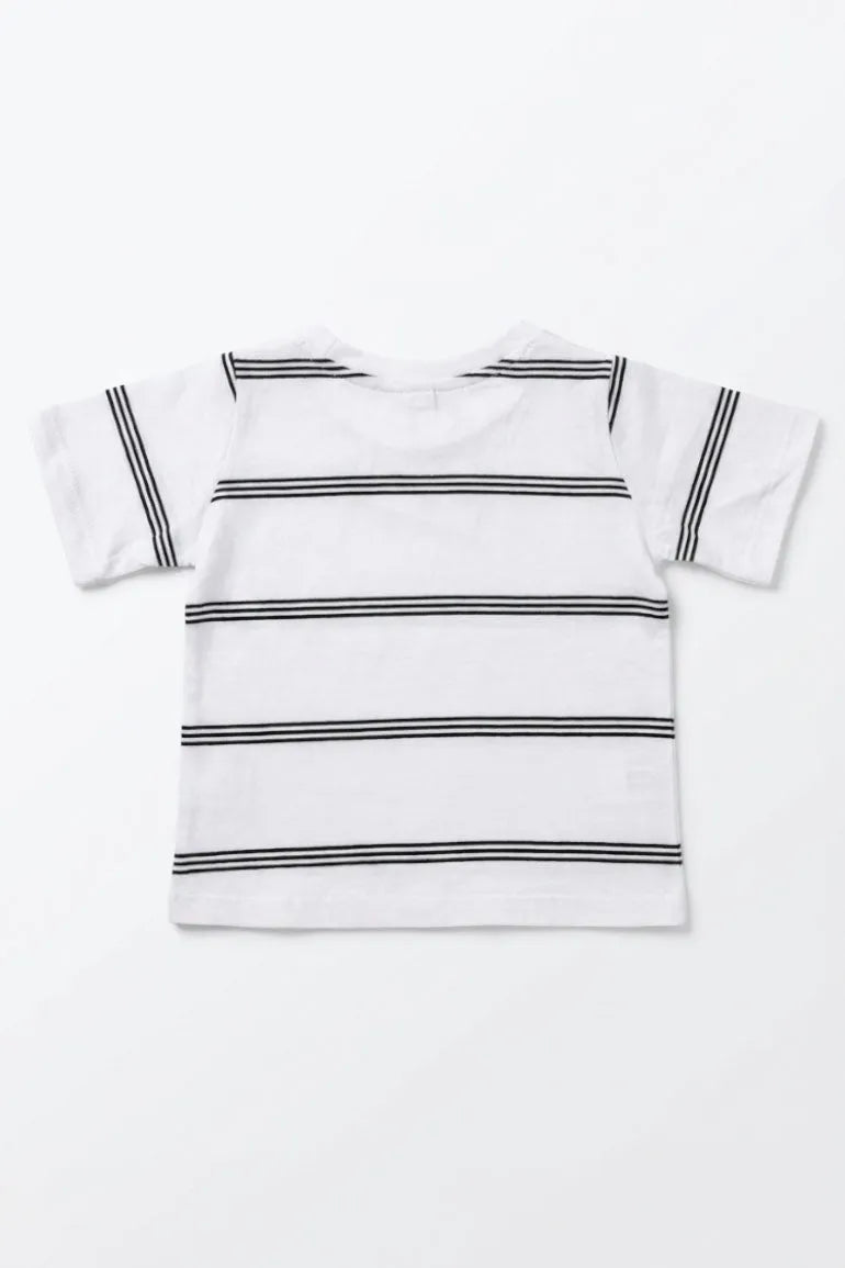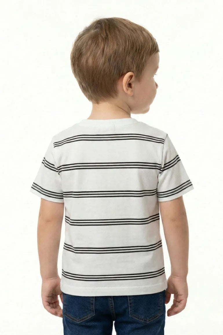 Soft cotton T-shirt featuring classic horizontal stripe detailing and short sleeves. Designed for all-day comfort with a breathable feel, ideal for baby boy everyday wear.