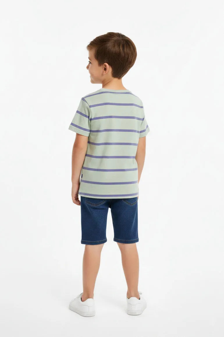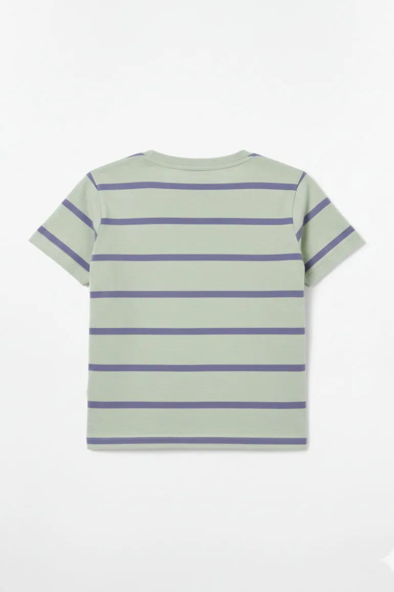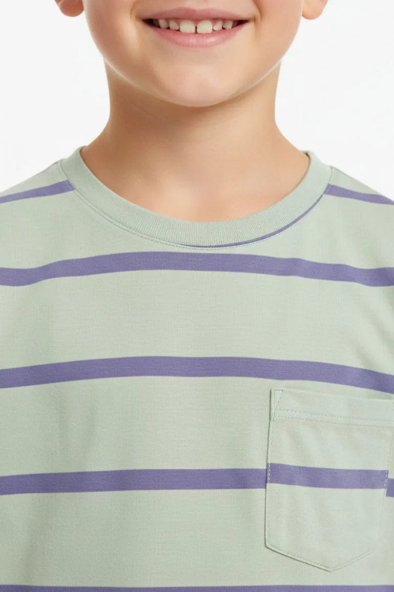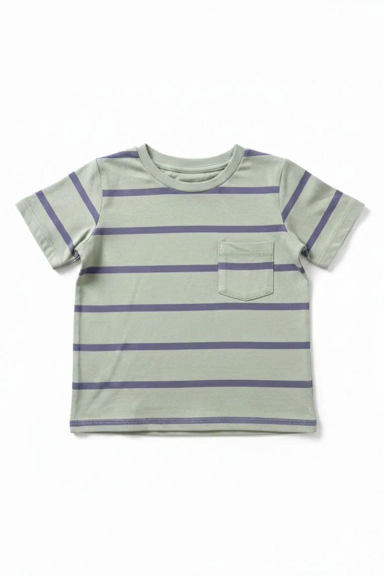 Soft sage green t-shirt designed with classic horizontal stripes and a neat chest pocket detail. Crafted from breathable, comfortable fabric, perfect for everyday wear and easy movement.