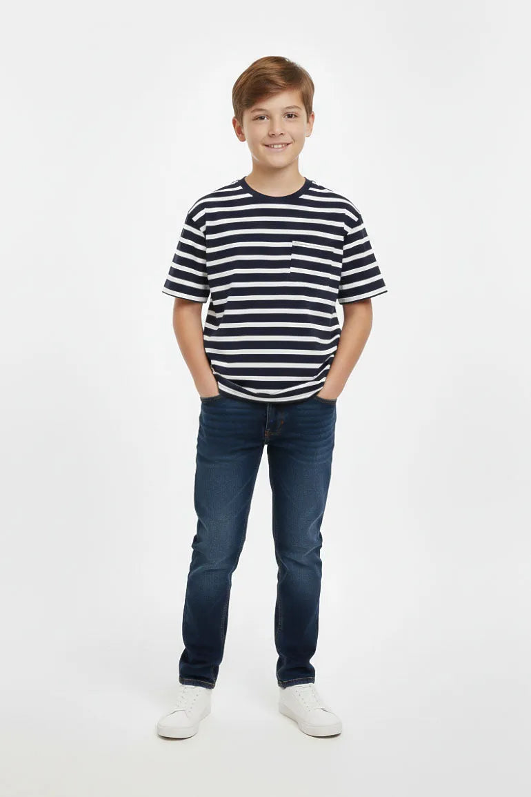 Classic white striped t-shirt featuring a round neckline and a functional chest pocket. Crafted from soft, breathable fabric for all-day comfort and effortless everyday style.