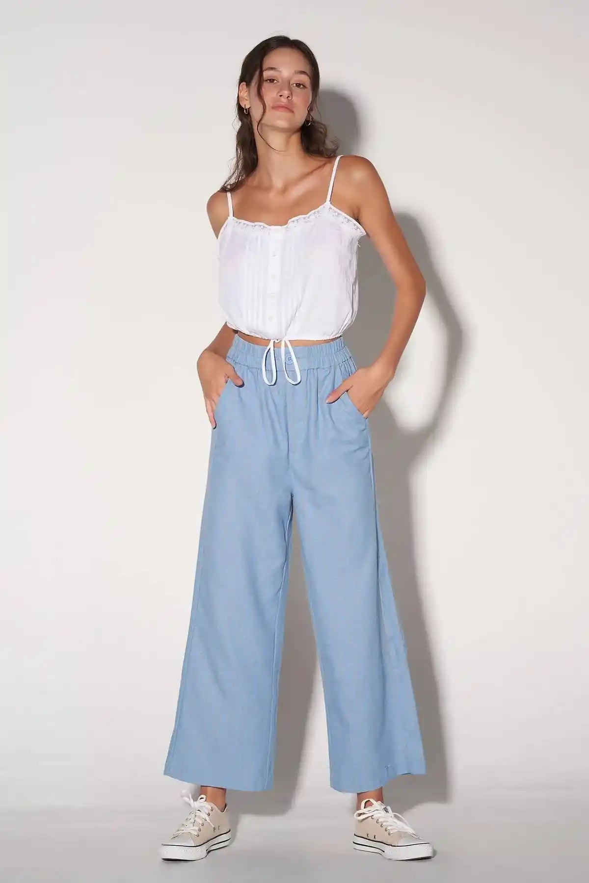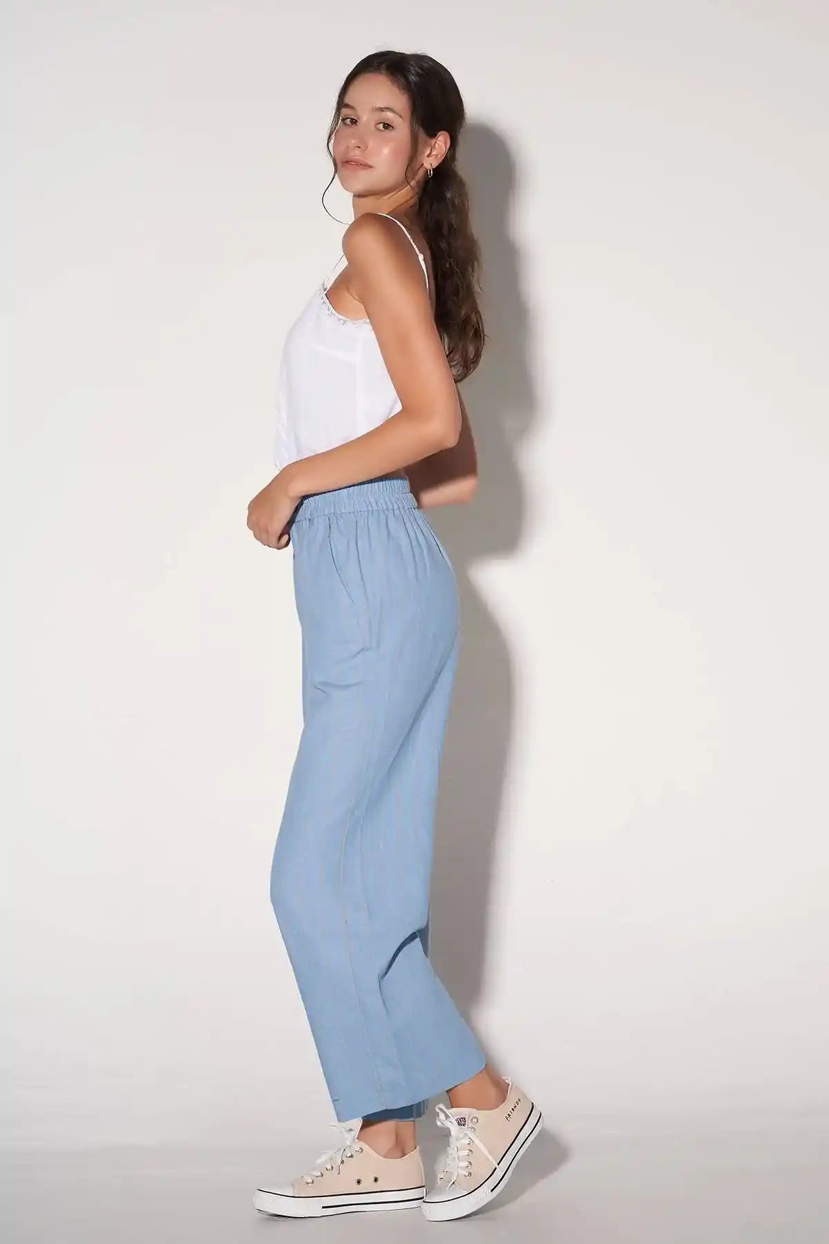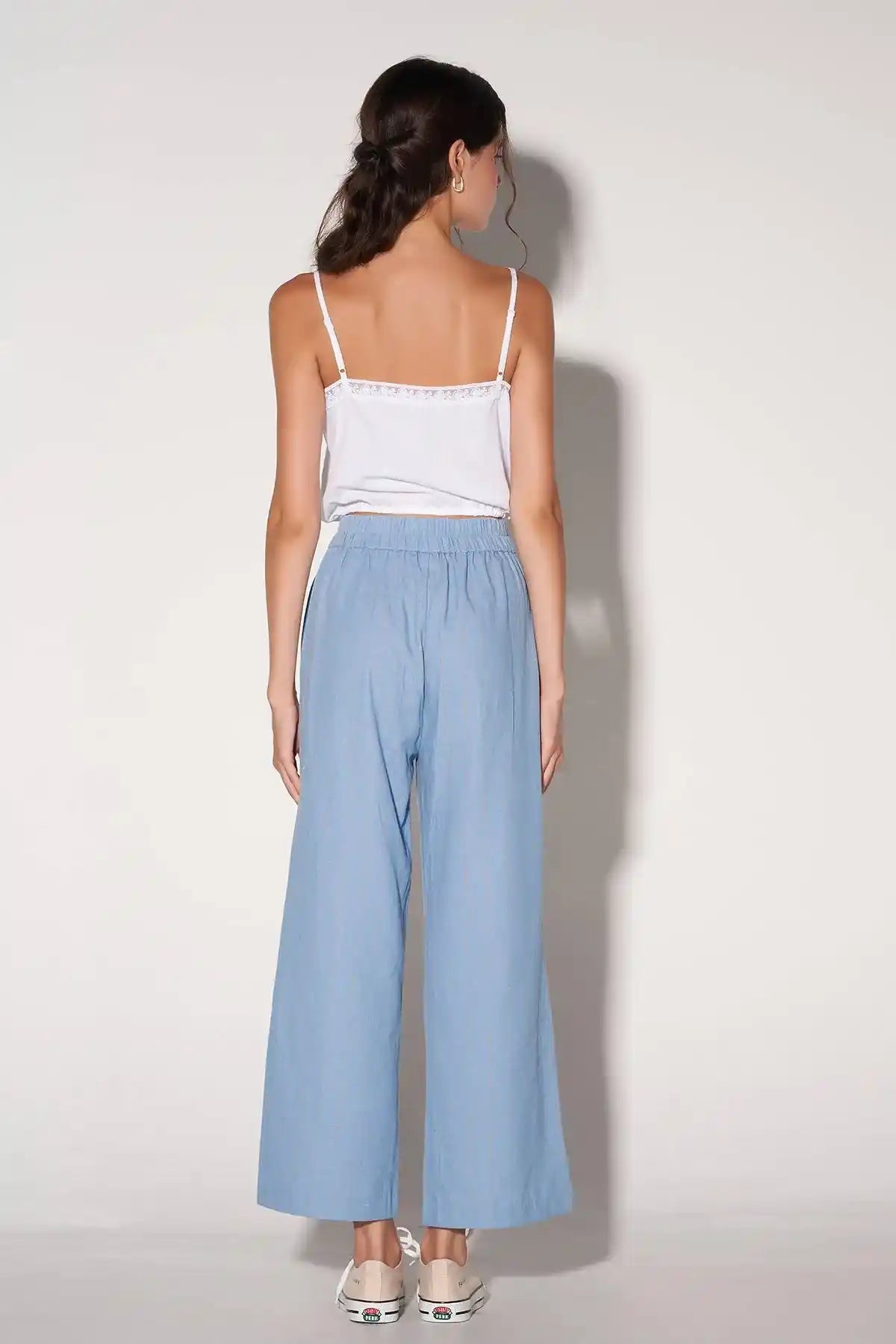 40% Cotton 60% Linen. Classical Striped Smart Casual Wide Leg Pants Featuring Elasticated Waistband With Button Closure. Front Slash Pockets. Wide Hem