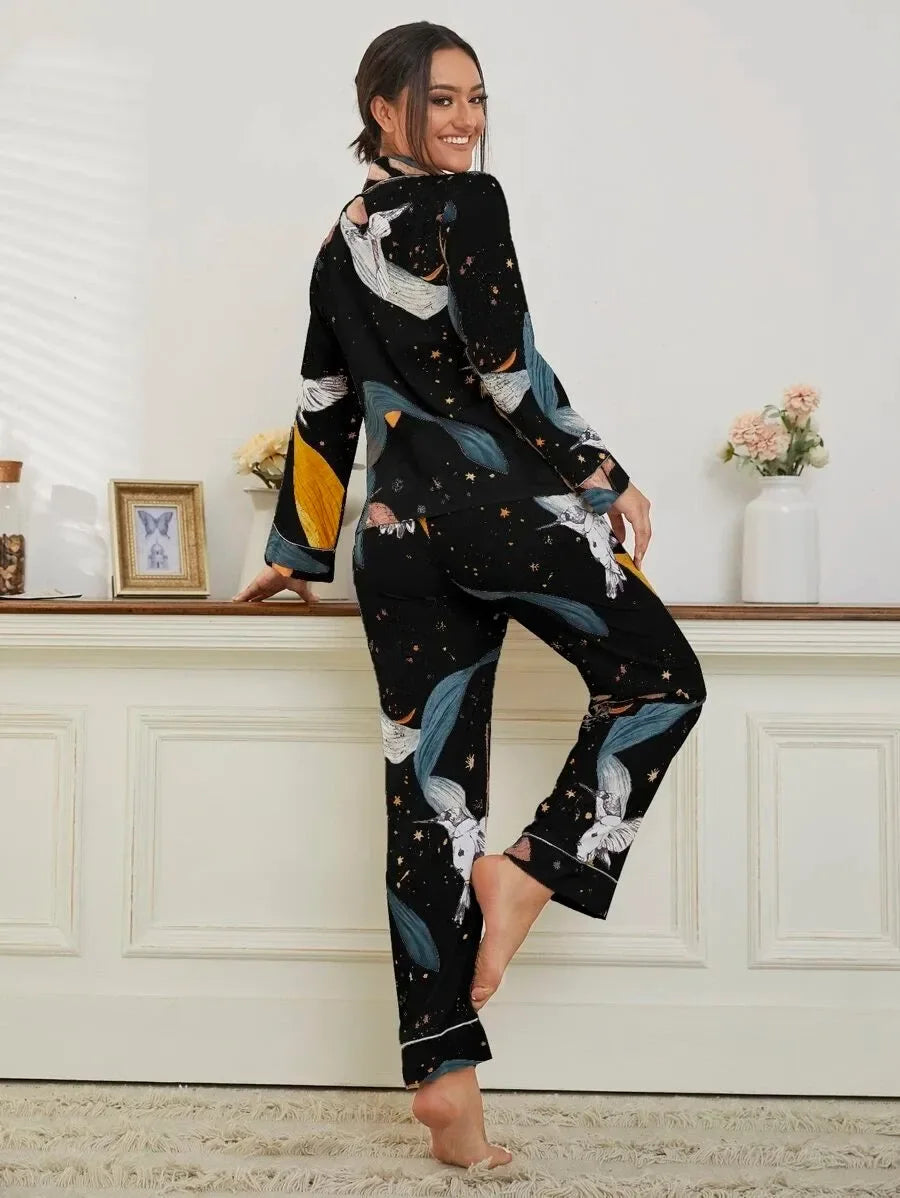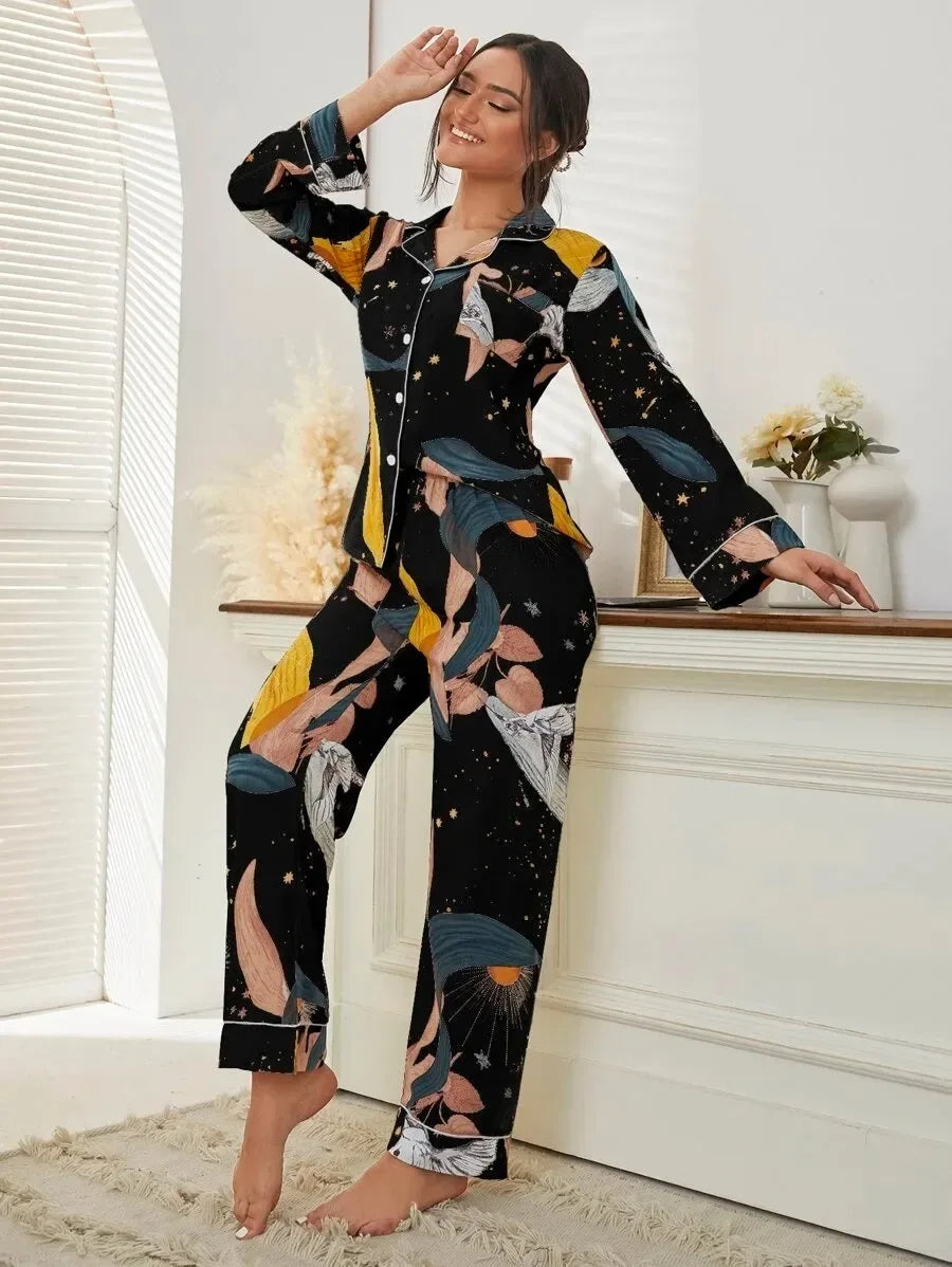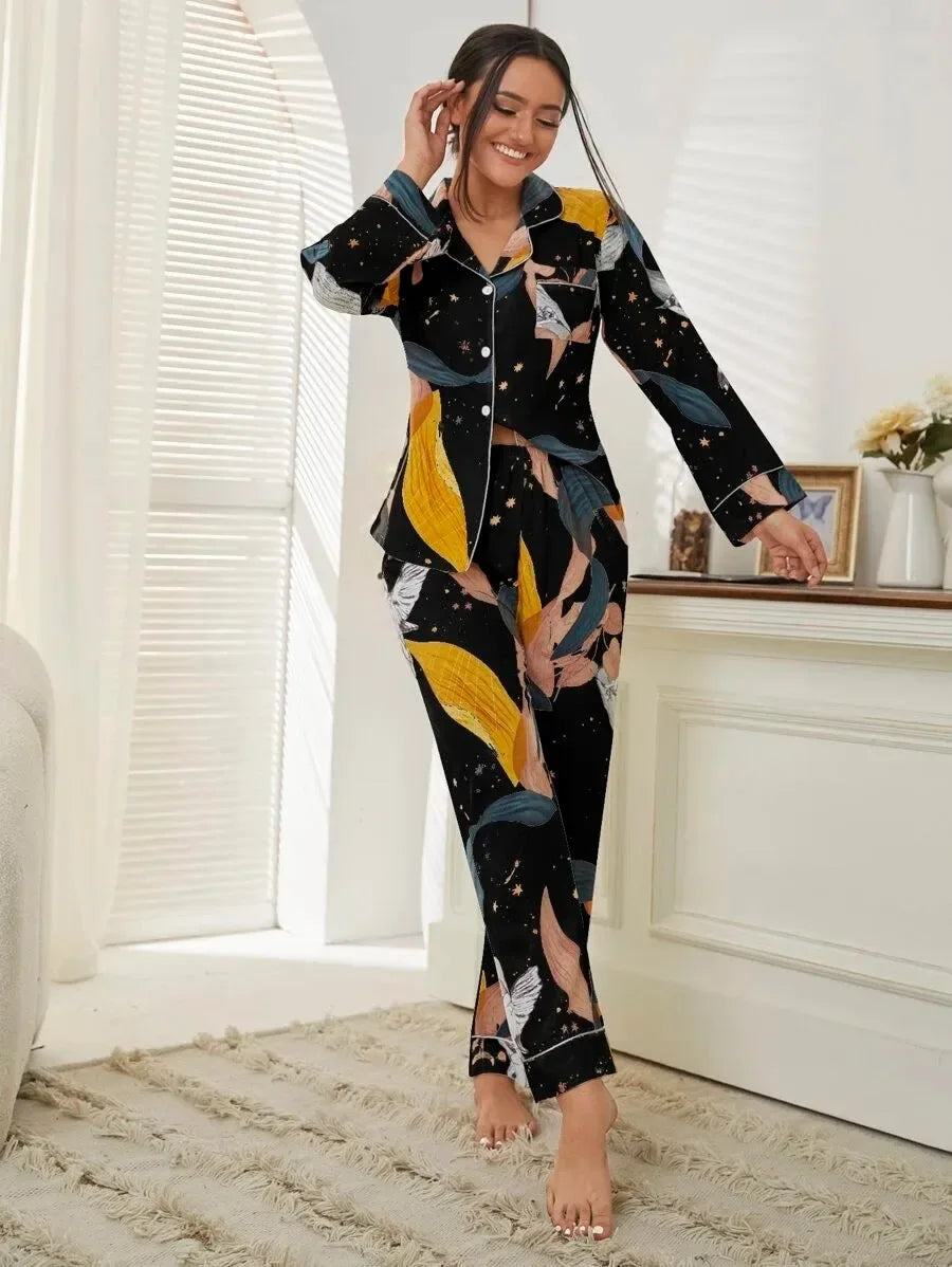 She's Inn Timeless Trends Bird & Plant Print Pocket Front PJ Set ARJ-PJ-PLANT